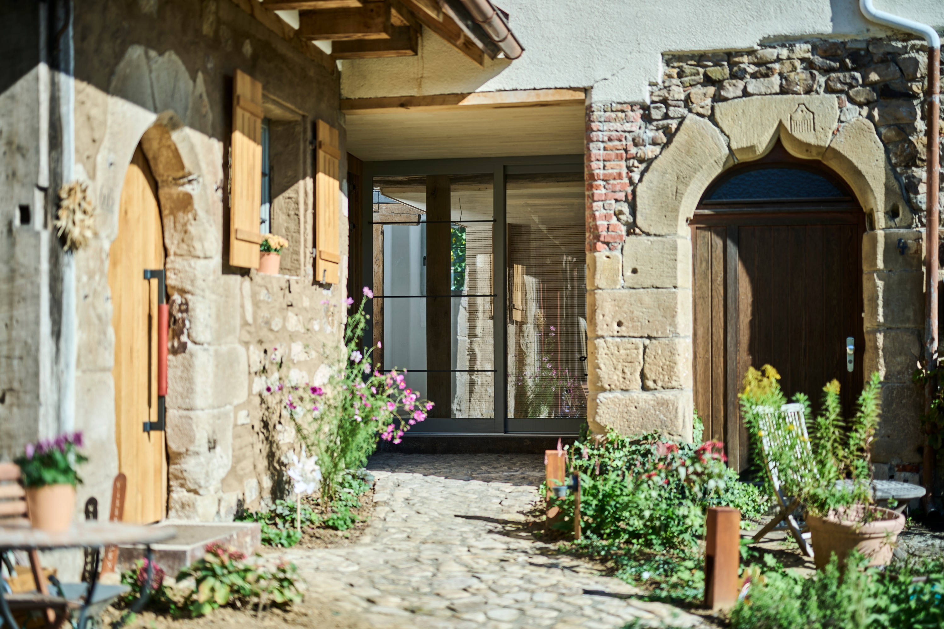 Historische Sprossenfenster wurden liebevoll restauriert und um eine Kastenfensteranlage ergänzt, um optimale Dämmwerte zu gewährleisten. Das imposante Holztor, das den Eingang bildet, wurde fachgerecht überarbeitet und führt zur eigentlichen Haustüranlage, die ebenfalls aus massivem Eichenholz gefertigt ist.