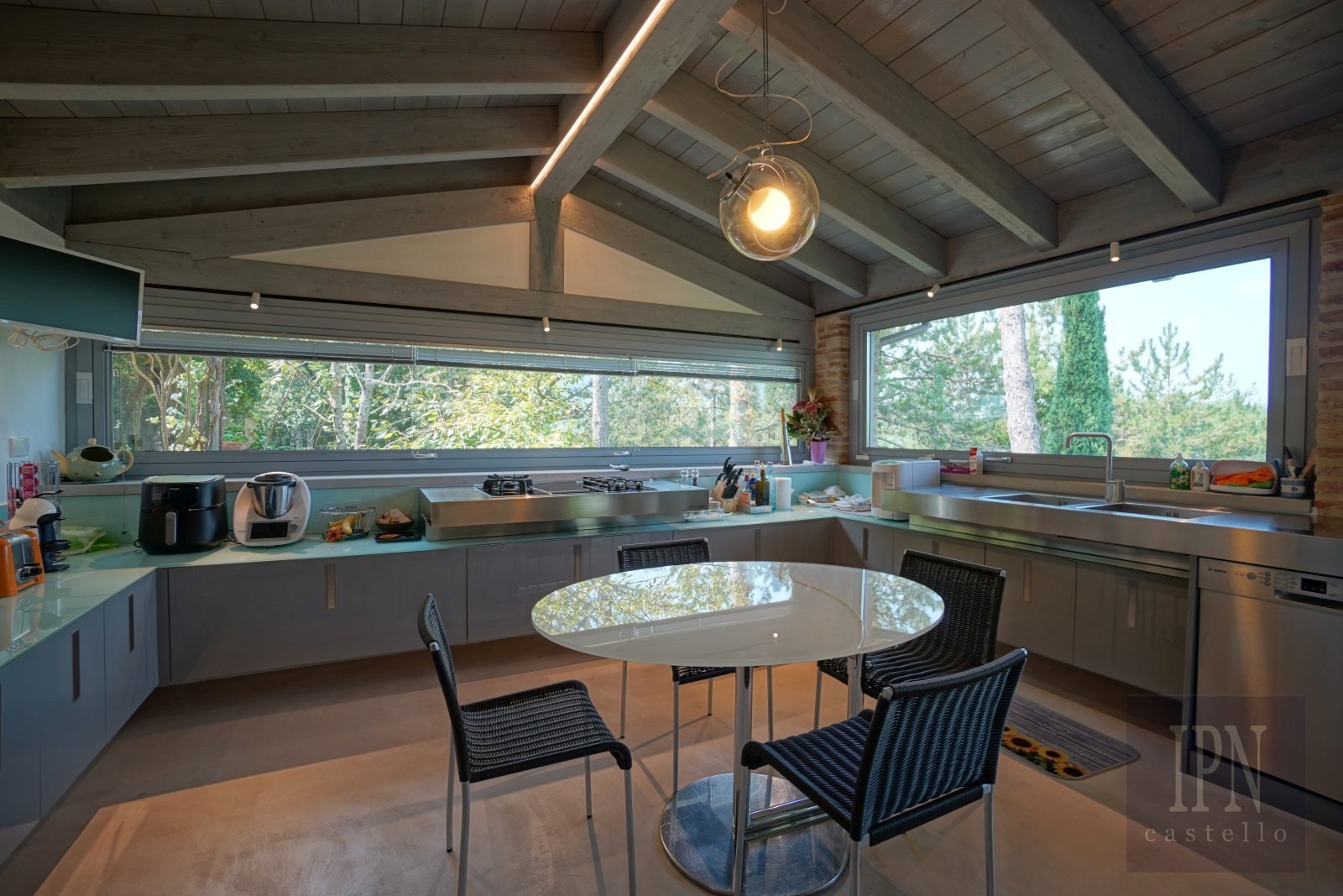 La casa principale rappresenta l’elemento più distintivo della proprietà. L’antico casale originario di 150 mq è stato ampliato con un’estensione su un solo livello di 94 mq, caratterizzata da altezze fino a 3,5 metri e da ampie pareti vetrate scorrevoli che inondano gli ambienti di luce naturale. Una cucina moderna completamente attrezzata di 30 mq, con elettrodomestici di alta gamma, si affaccia sulla zona giorno e sul portico esterno, dotato di tende trasparenti retrattili. Questo spazio open space di quasi 100 mq offre la sensazione di vivere all’aperto pur garantendo il comfort di un ambiente interno con riscaldamento a pavimento e pavimentazione in resina cementizia color sabbia. Tutte le superfici vetrate sono dotate di schermature veneziane elettriche, controllabili dall’interno o tramite smartphone.