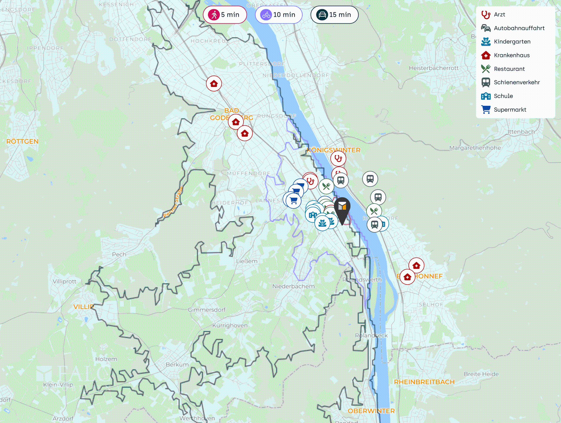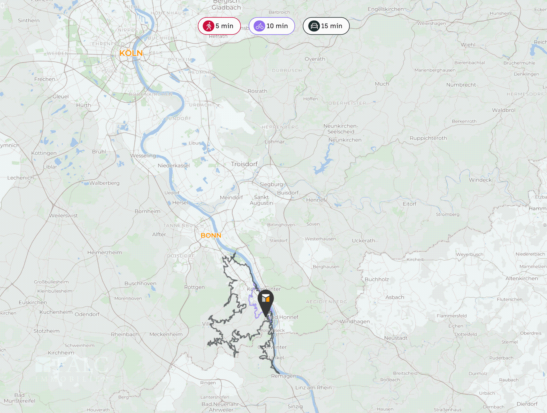 Rustige ligging aan de Rijnpromenade in Mehlem met goede infrastructuur. Scholen en kinderopvang zijn op loopafstand. Openbaar vervoer (bus, tram) en de oprit naar de snelweg liggen dichtbij. Winkels en medische voorzieningen zijn aanwezig. De luchthaven Keulen/Bonn ligt op ongeveer 30 km afstand.