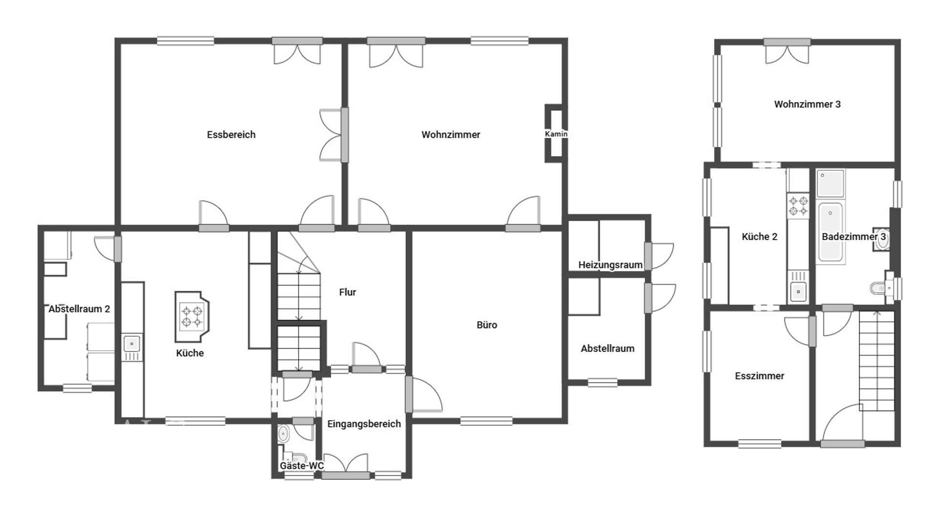 De eerste verdieping omvat vier kamers, waaronder drie kantoren, een badkamer, een kleedruimte en een tweede bijkeuken.