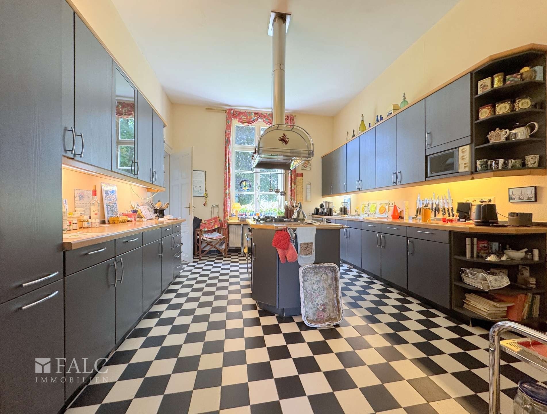 Een apart gastenverblijf biedt twee verdiepingen met keuken, badkamer, woon- en slaapkamers. Beide gebouwen zijn volledig onderkelderd.