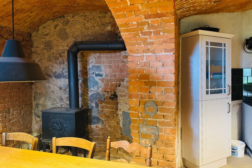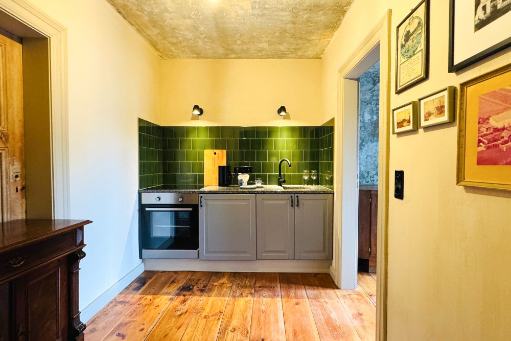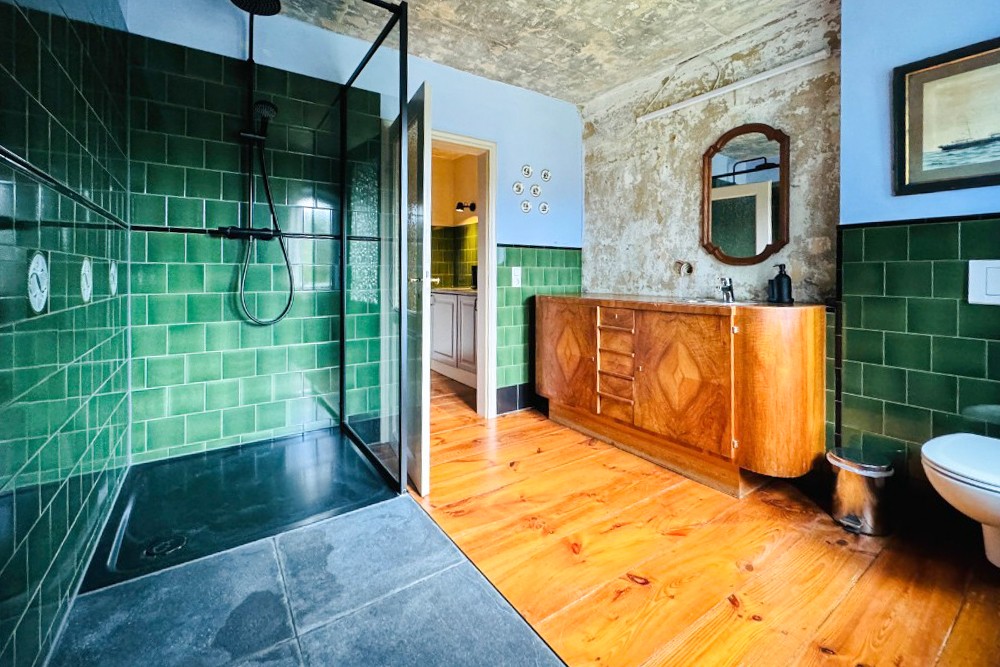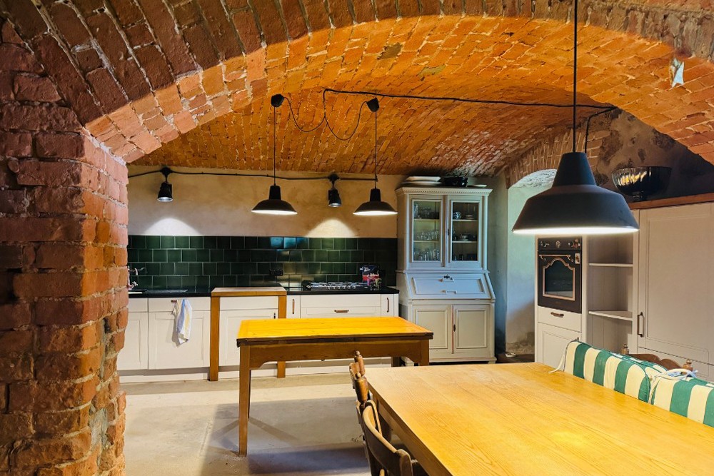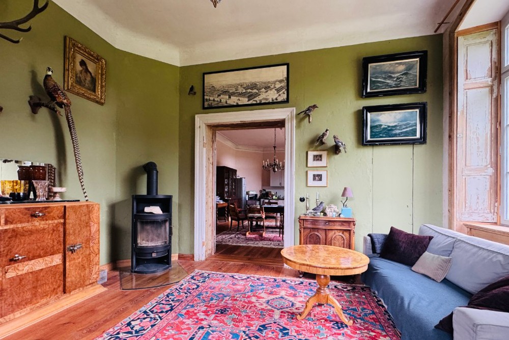 Het te koop aangeboden gedeelte van het landhuis opent zich naar een zorgvuldig gerestaureerd interieur. In de gewelfde kelder is de oorspronkelijke landhuiskamer met een gezellige gietijzeren kachel behouden. Op de begane grond is een klein gastenappartement met eigen badkamer voltooid; daarnaast bevinden zich de keuken, eetkamer en salon, die naadloos aansluiten op een bijna voltooide terras. Op de eerste verdieping liggen meerdere slaapkamers en een aparte gastenruimte, verbonden met de charmante torenkamer, momenteel als slaapkamer in gebruik. Deze verdieping biedt tevens veel uitbreidingsmogelijkheden.