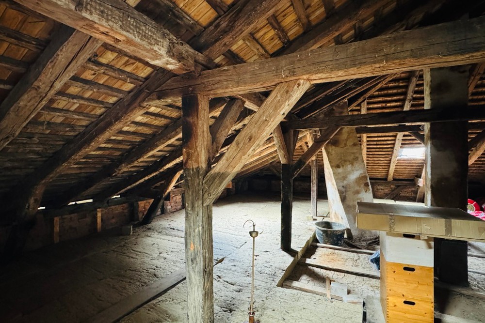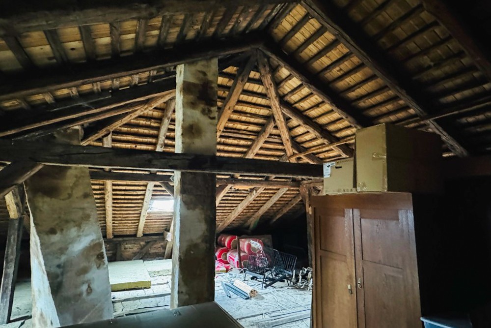 Het dak is bedekt met teerleien; het houten geraamte verkeert in goede staat, hoewel de dakbedekking vernieuwing behoeft, wat ruimte biedt voor toekomstige ontwerpvrijheid.
