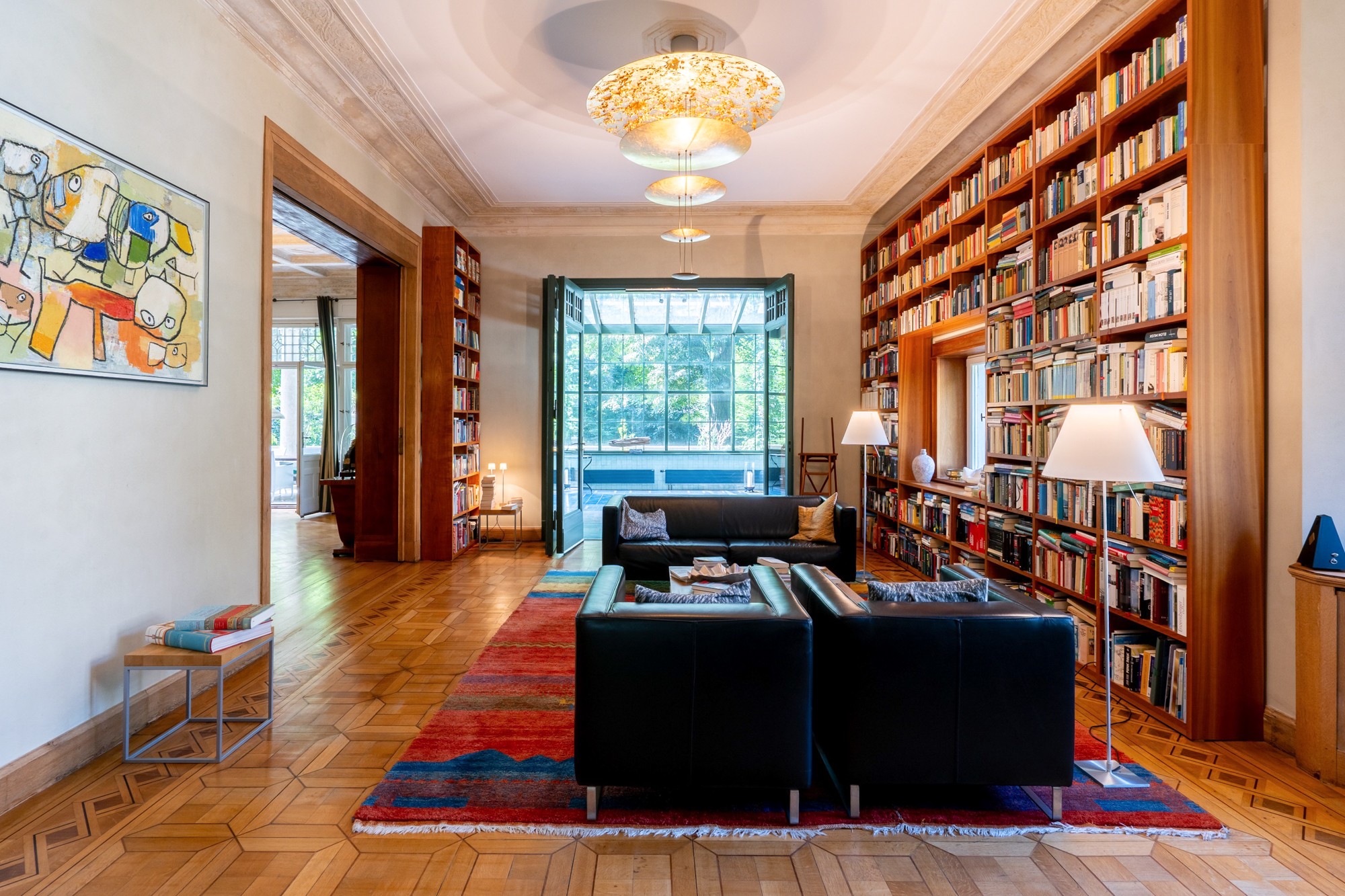 Reeds bij binnenkomst wordt duidelijk dat dit geen gewoon huis is: een twee verdiepingen tellende hal met omlopende galerij, kunstzinnige glas-in-loodramen en handgesneden balustrades verwelkomt bewoners en gasten met grandeur. De enfilade van salon, bibliotheek en eetkamer opent met hoge dubbele deuren naar de tuin – ruimtes die zowel voor sociale bijeenkomsten als voor privégezelligheid zijn ontworpen. Originele details zoals cassetteplafonds, stucmarmer, historische parketvloeren en een veranda met ornamentale mozaïekvloer getuigen van vakmanschap.