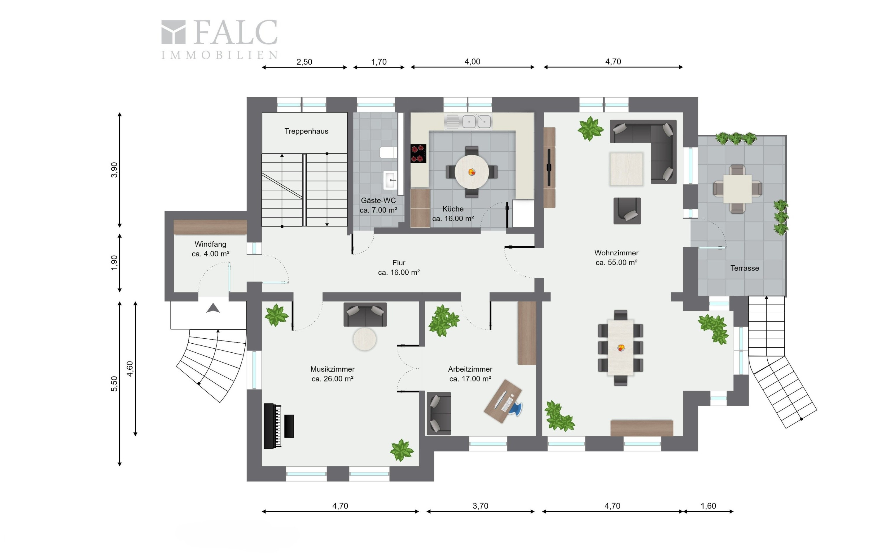 Laten we een virtuele rondleiding beginnen! Vanaf de hoofdingang bereiken we via een geplaveide weg de ingangshal met een prachtige stenen trap. In de lichte hal van de villa is ruimte voor garderobe en schoenen. Via artistieke dubbele deuren komen we in de lange gang met plafonds van wel 4 meter hoog. De muziekkamer met 3 ramen is geschikt als hobbyruimte, de werkkamer biedt plaats aan kantoormeubilair. Aan de linkerkant van de gang bevindt zich een gastentoilet. De keuken heeft een raam, een kroonluchter en een moderne keuken uit 2022. Vanuit de gang komen we in het eet- en woongedeelte met open haard en toegang tot het terras. Op het terras kunt u genieten van zwoele zomeravonden. Op de bovenverdieping bevinden zich 2 kinder-/gastenkamers en een badkamer. De slaapkamer biedt toegang tot het buitenbalkon en heeft een kleedkamer. De aangrenzende badkamer is luxueus uitgerust. De zolder kan worden gebruikt als hobbyruimte of gastenverblijf en heeft nog een badkamer. In het souterrain vindt u een bijkeuken, een wintertuin, een fitnessruimte, een wijnkelder en een sauna-/wellnessruimte. Deze ruimte is echt een hoogtepunt!
