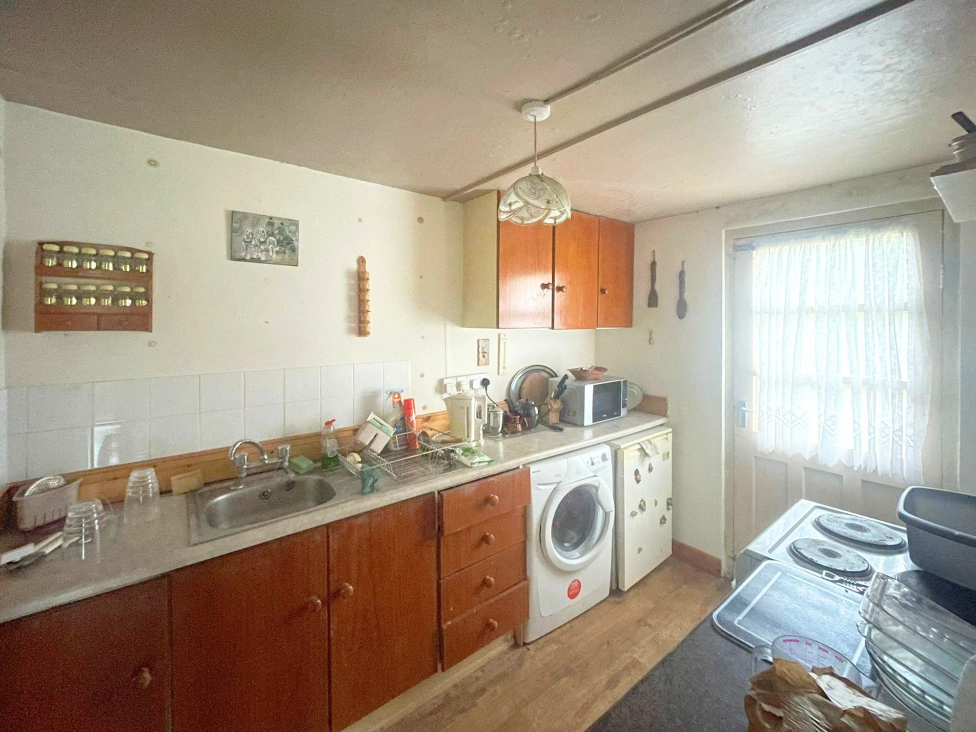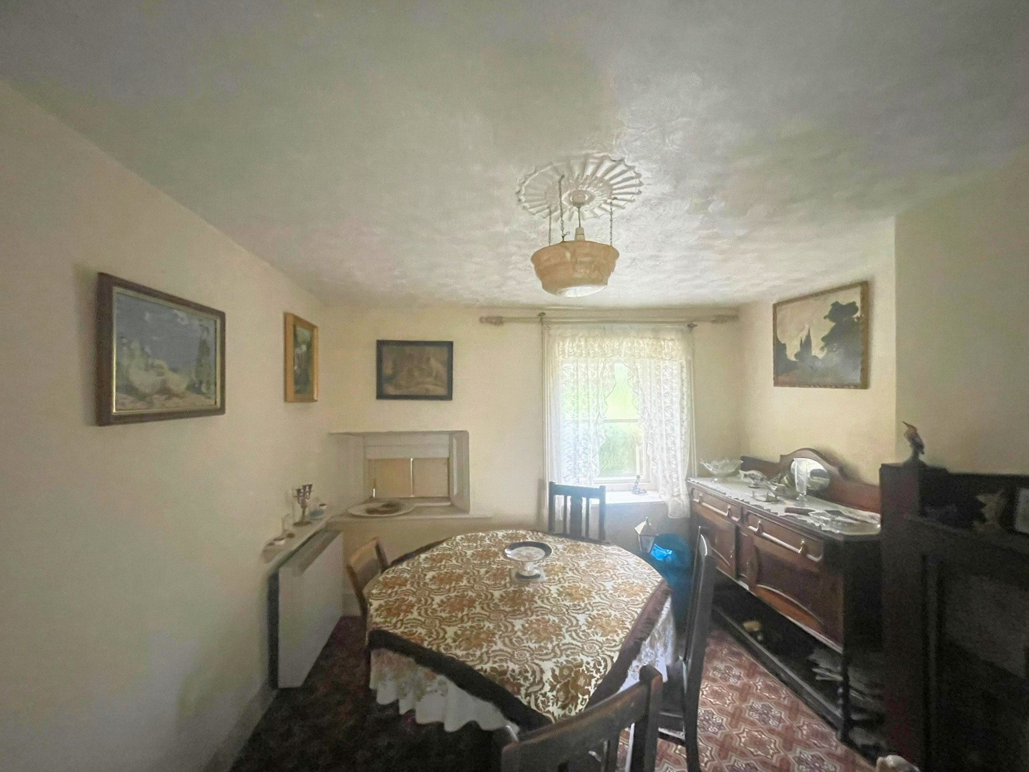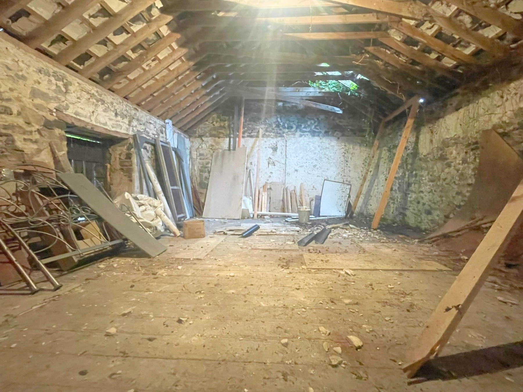 Volwassen bomen, een ommuurde tuin en de binnenplaats met de gebouwen met leien dak bieden mogelijkheden voor herontwikkeling (met vergunning).