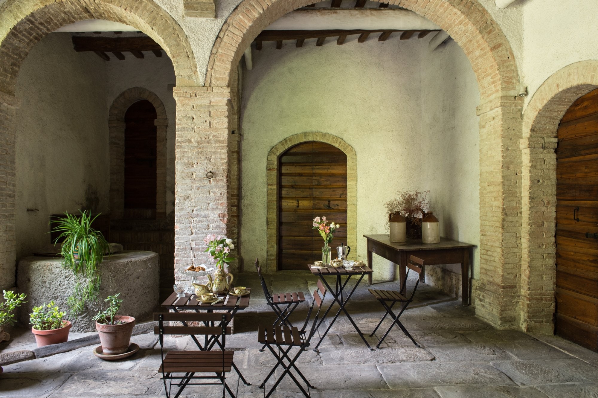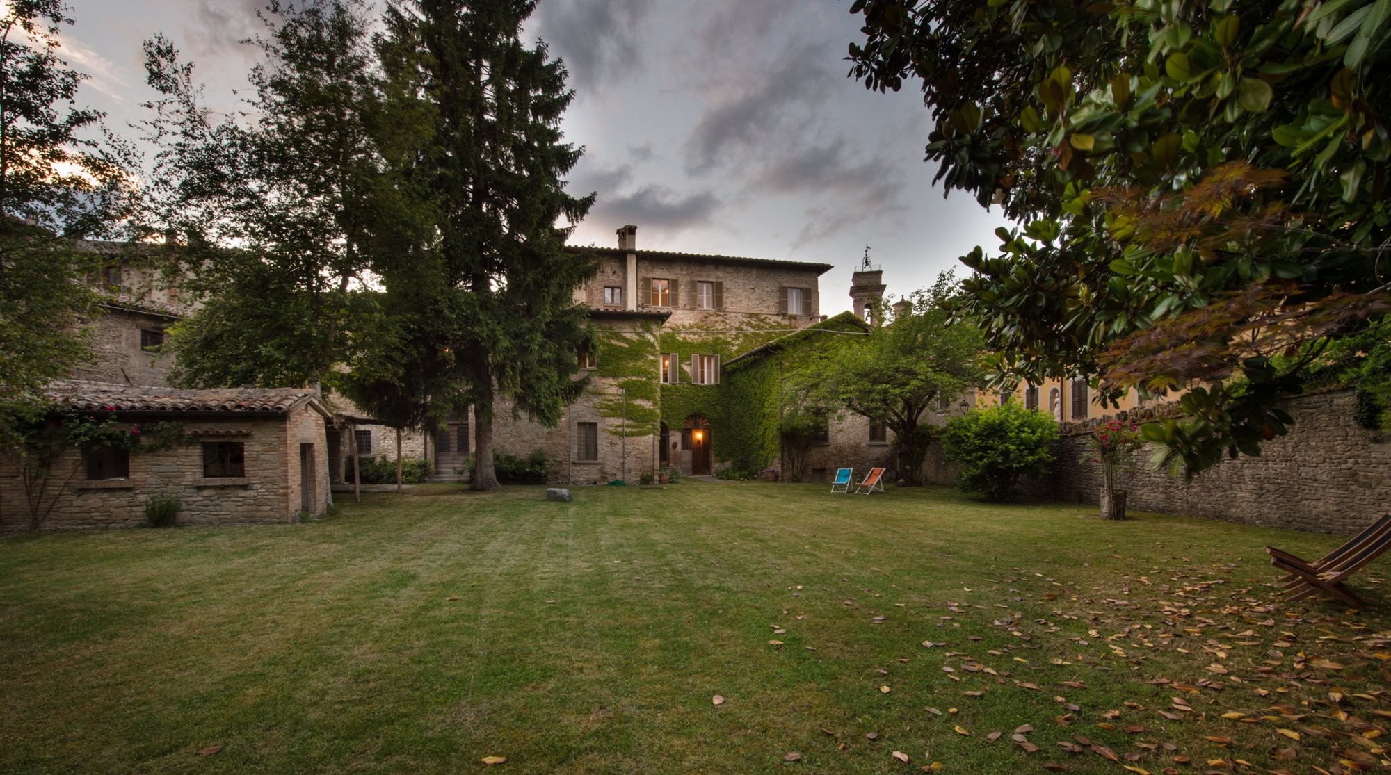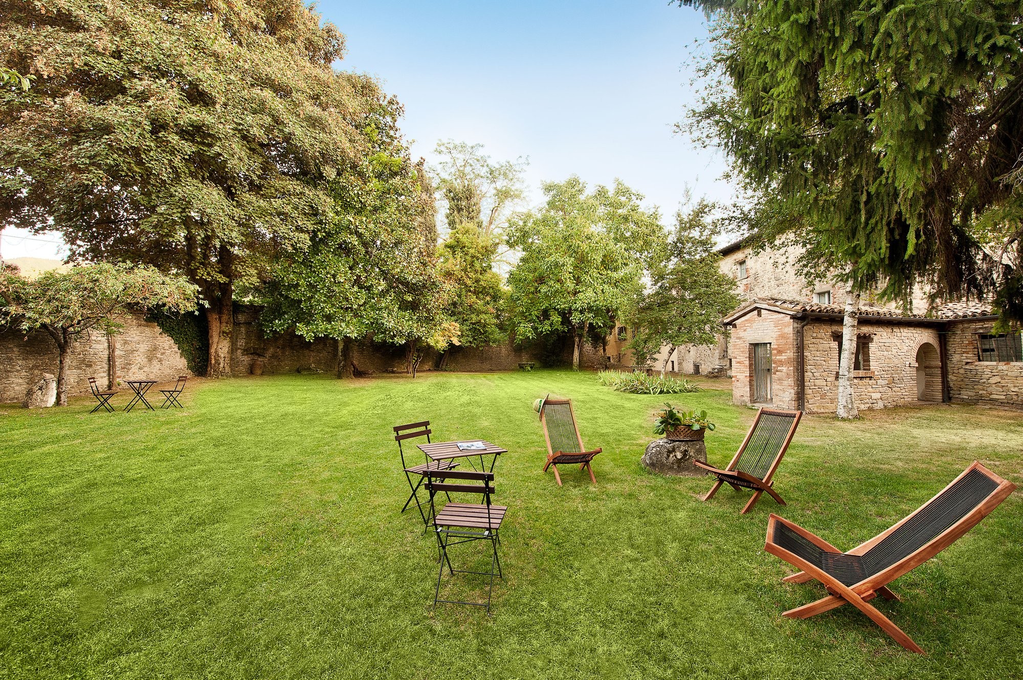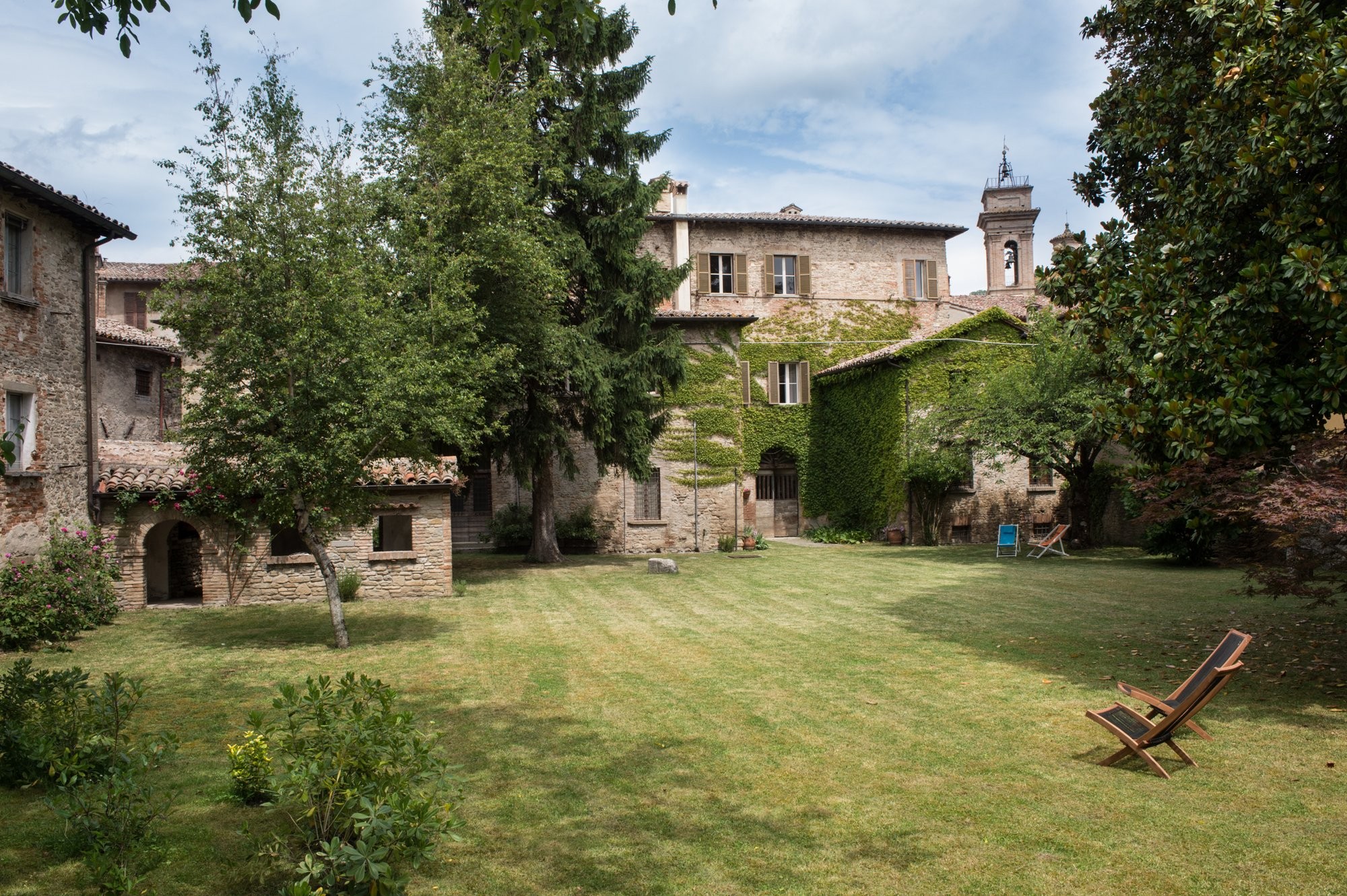 De binnenplaats biedt een rustige oase met rozen, citrusbomen, een pergola en een antieke fontein. Kleine balkons en panoramische ramen bieden uitzicht over het dorp en de omliggende Apennijnen, waardoor binnen- en buitenruimtes harmonieus worden verbonden.
