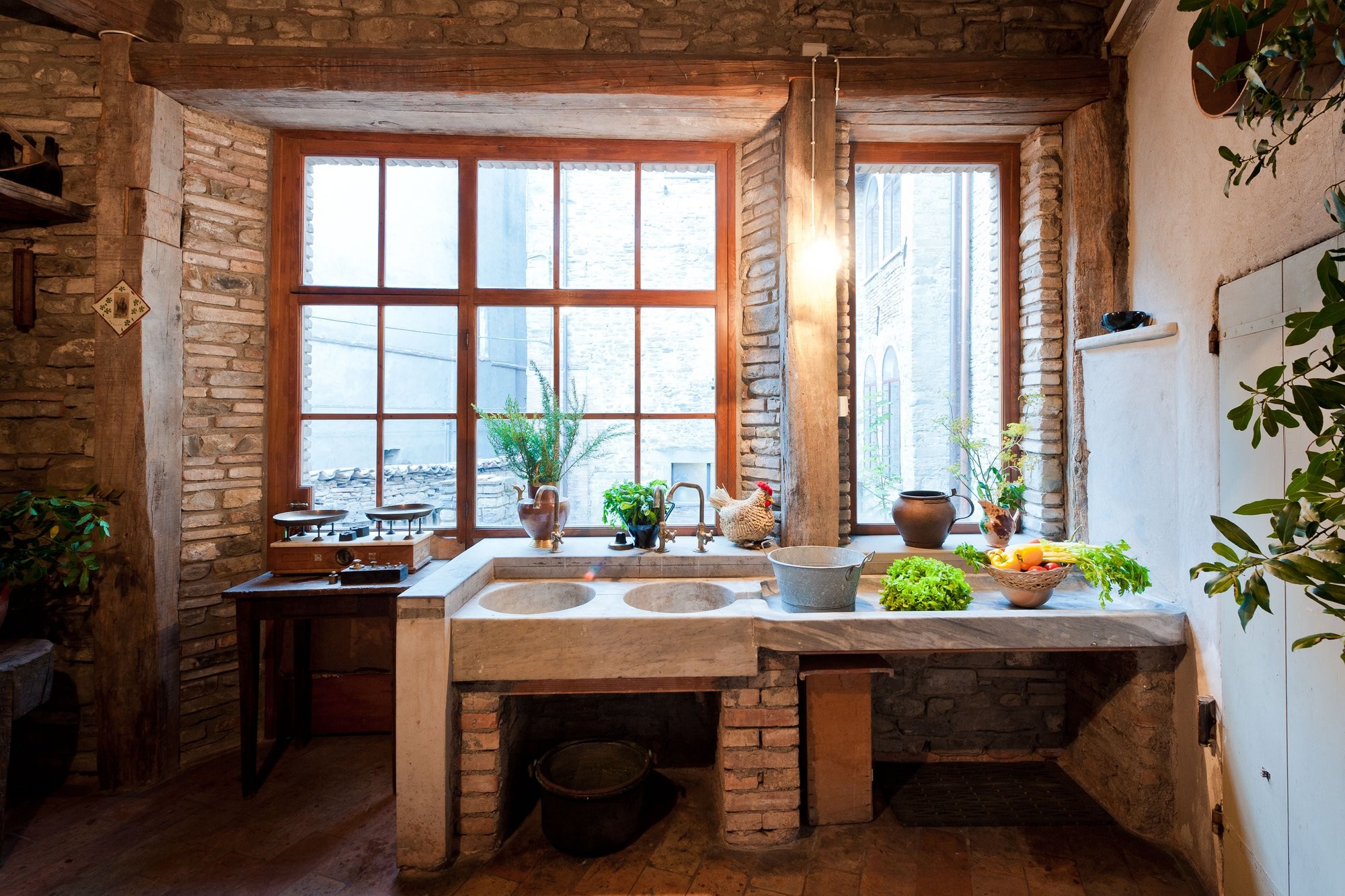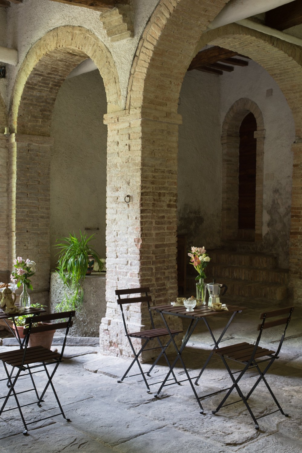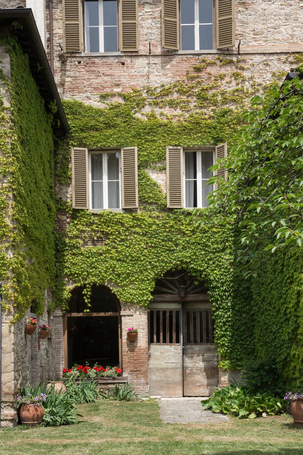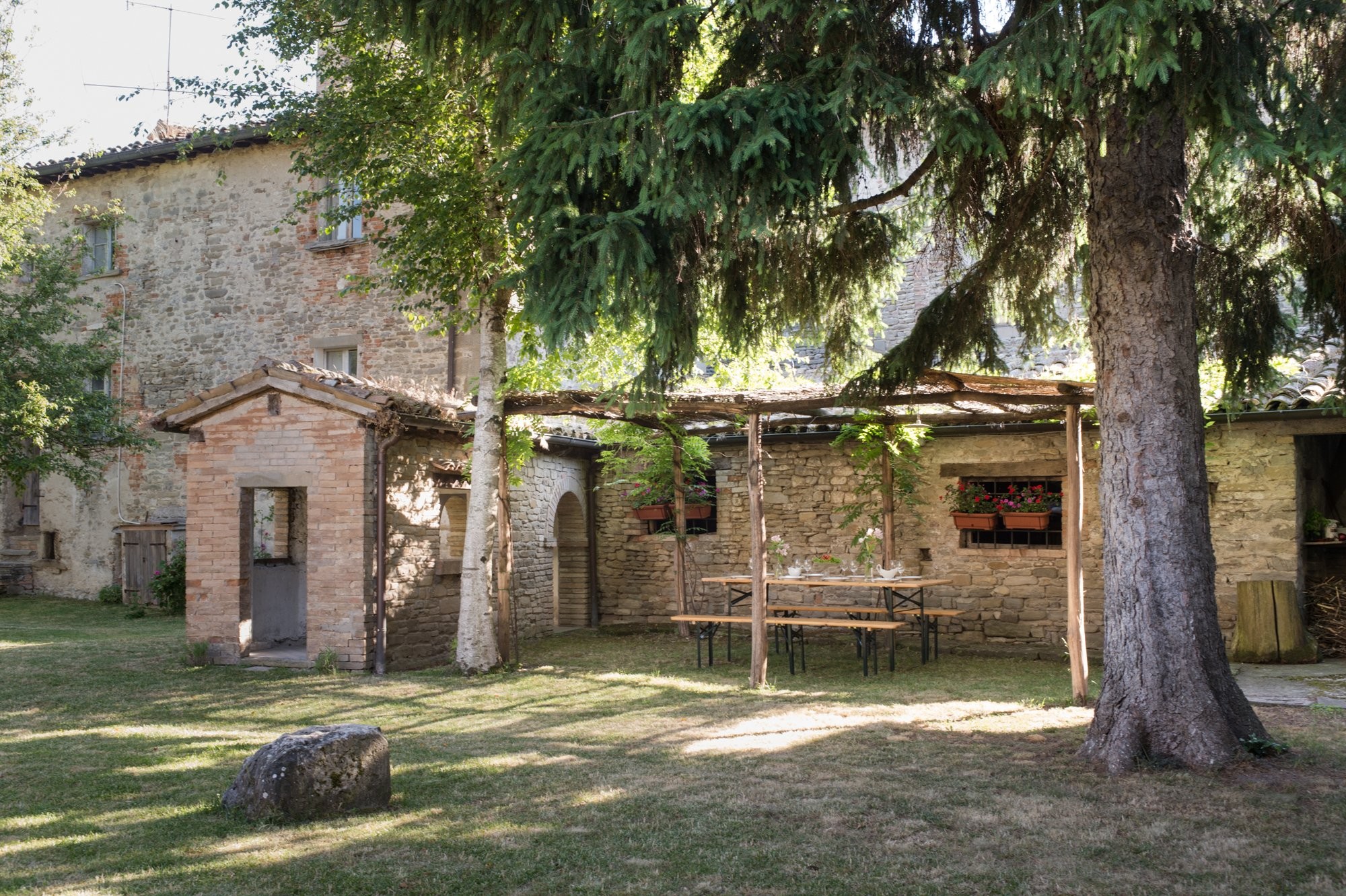De binnenplaats biedt een rustige oase met rozen, citrusbomen, een pergola en een antieke fontein. Kleine balkons en panoramische ramen bieden uitzicht over het dorp en de omliggende Apennijnen, waardoor binnen- en buitenruimtes harmonieus worden verbonden.