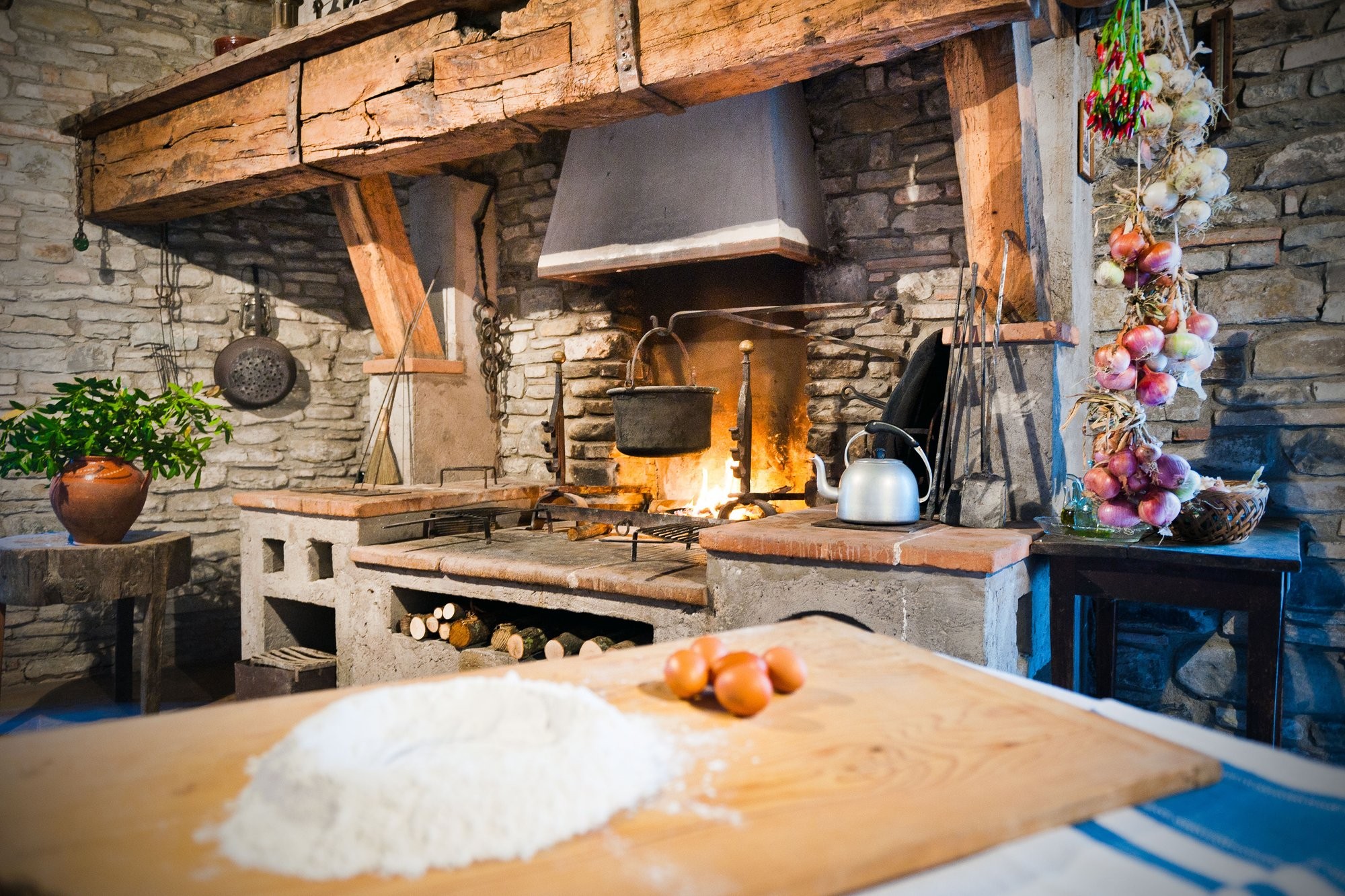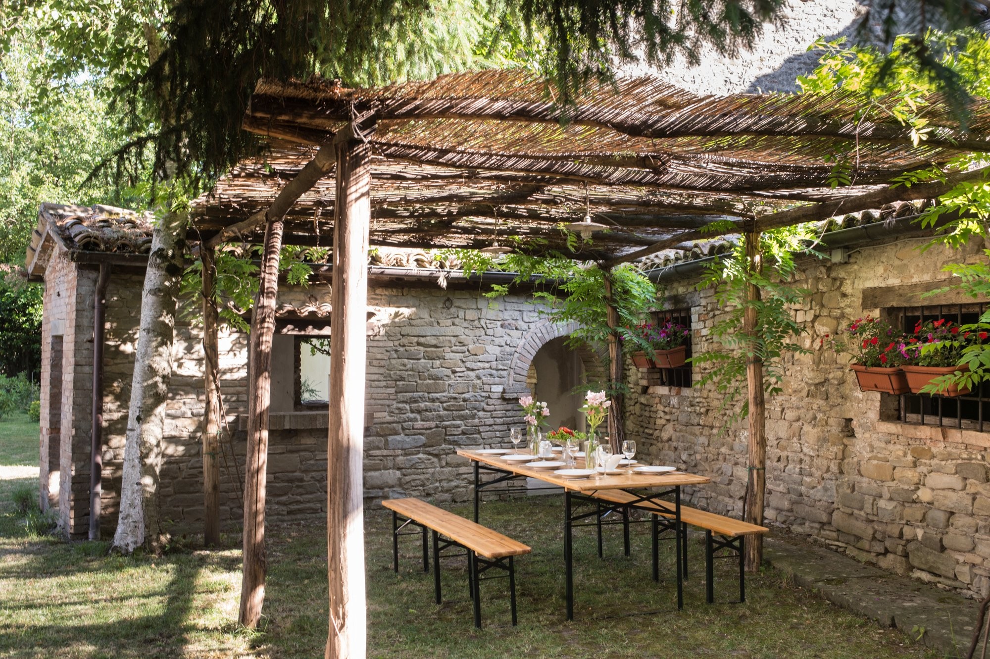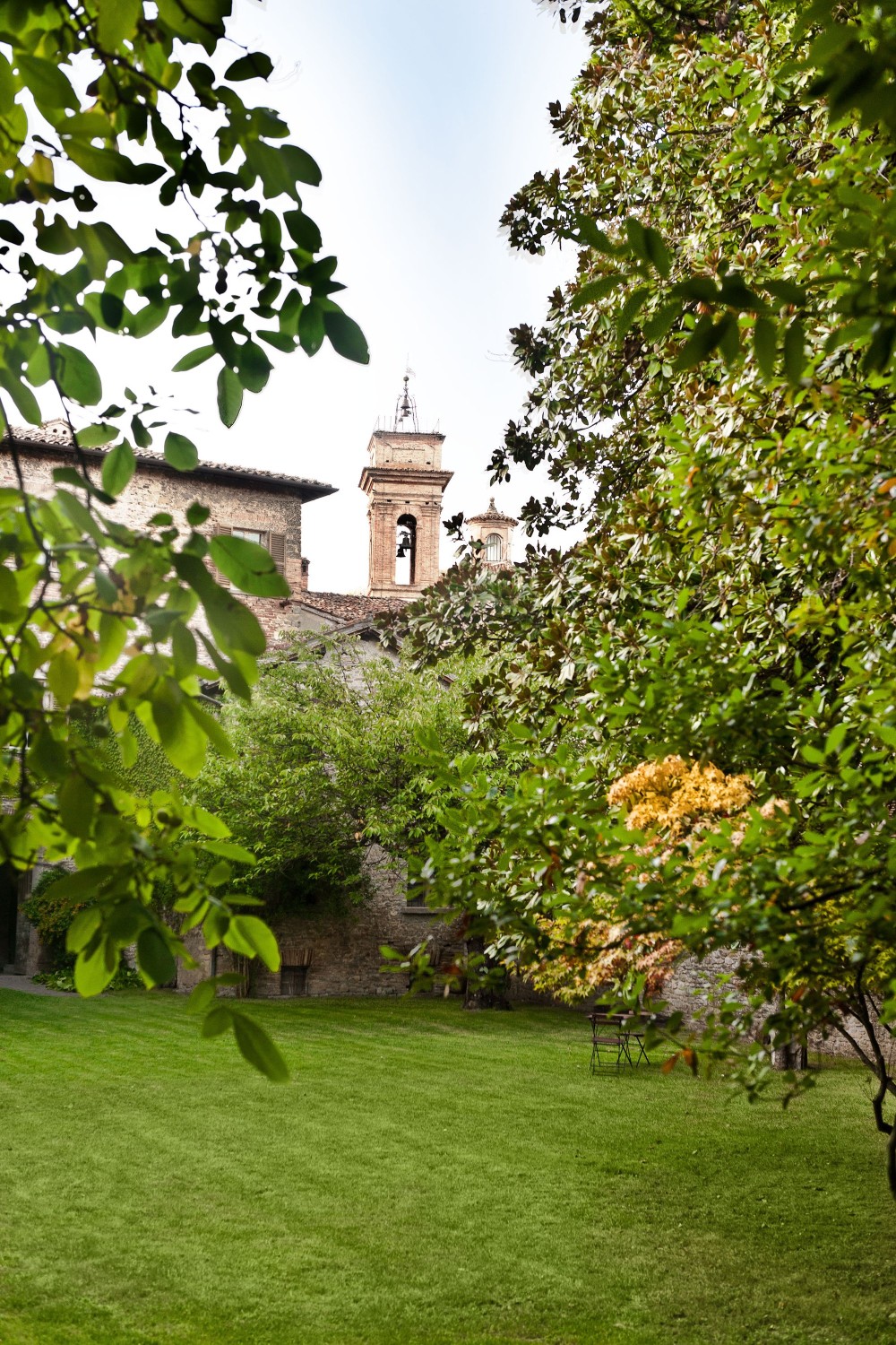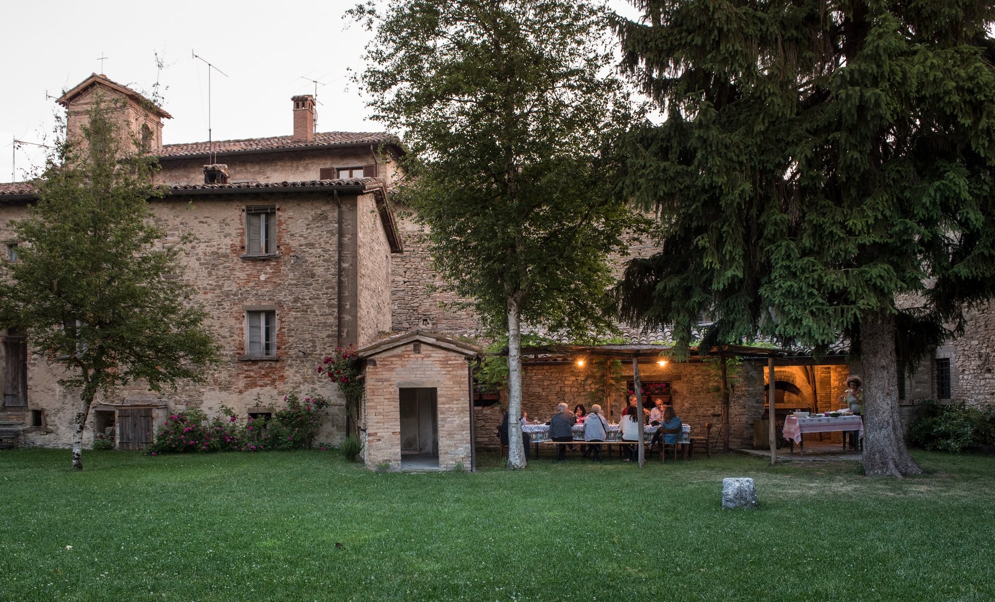 De binnenplaats biedt een rustige oase met rozen, citrusbomen, een pergola en een antieke fontein. Kleine balkons en panoramische ramen bieden uitzicht over het dorp en de omliggende Apennijnen, waardoor binnen- en buitenruimtes harmonieus worden verbonden.