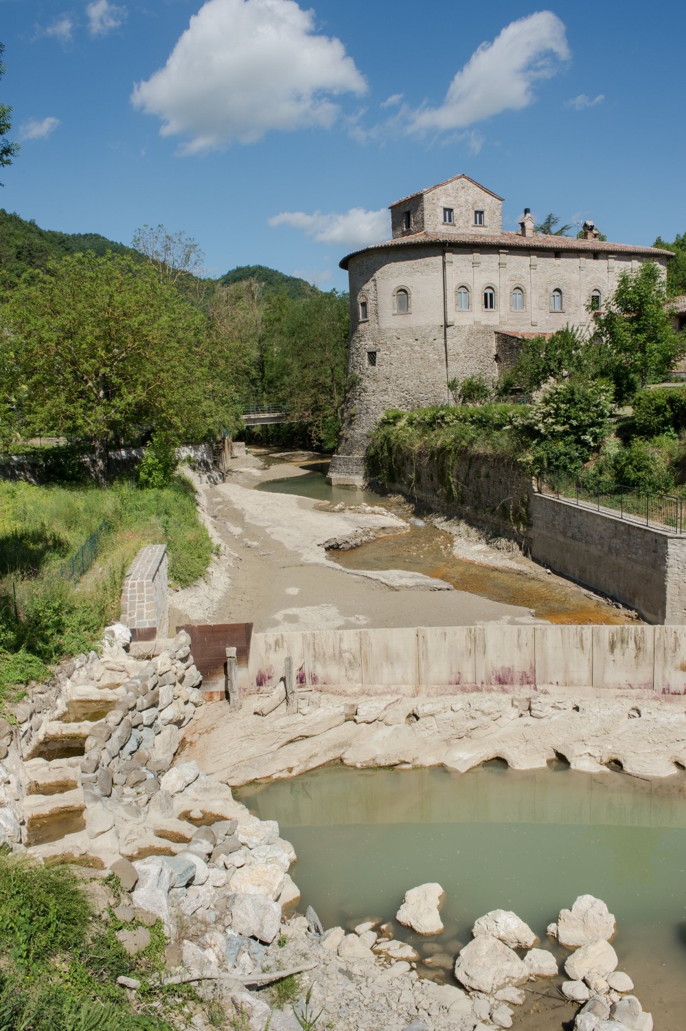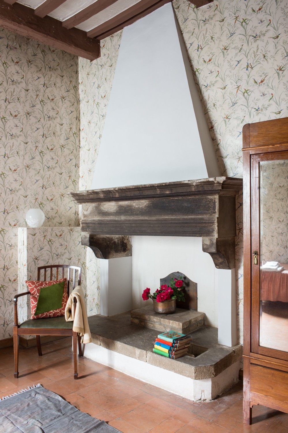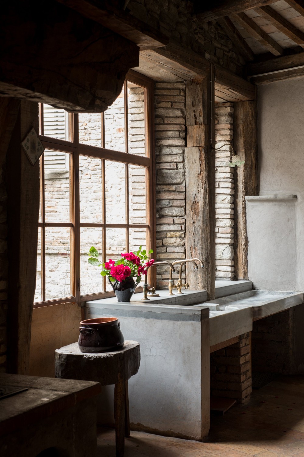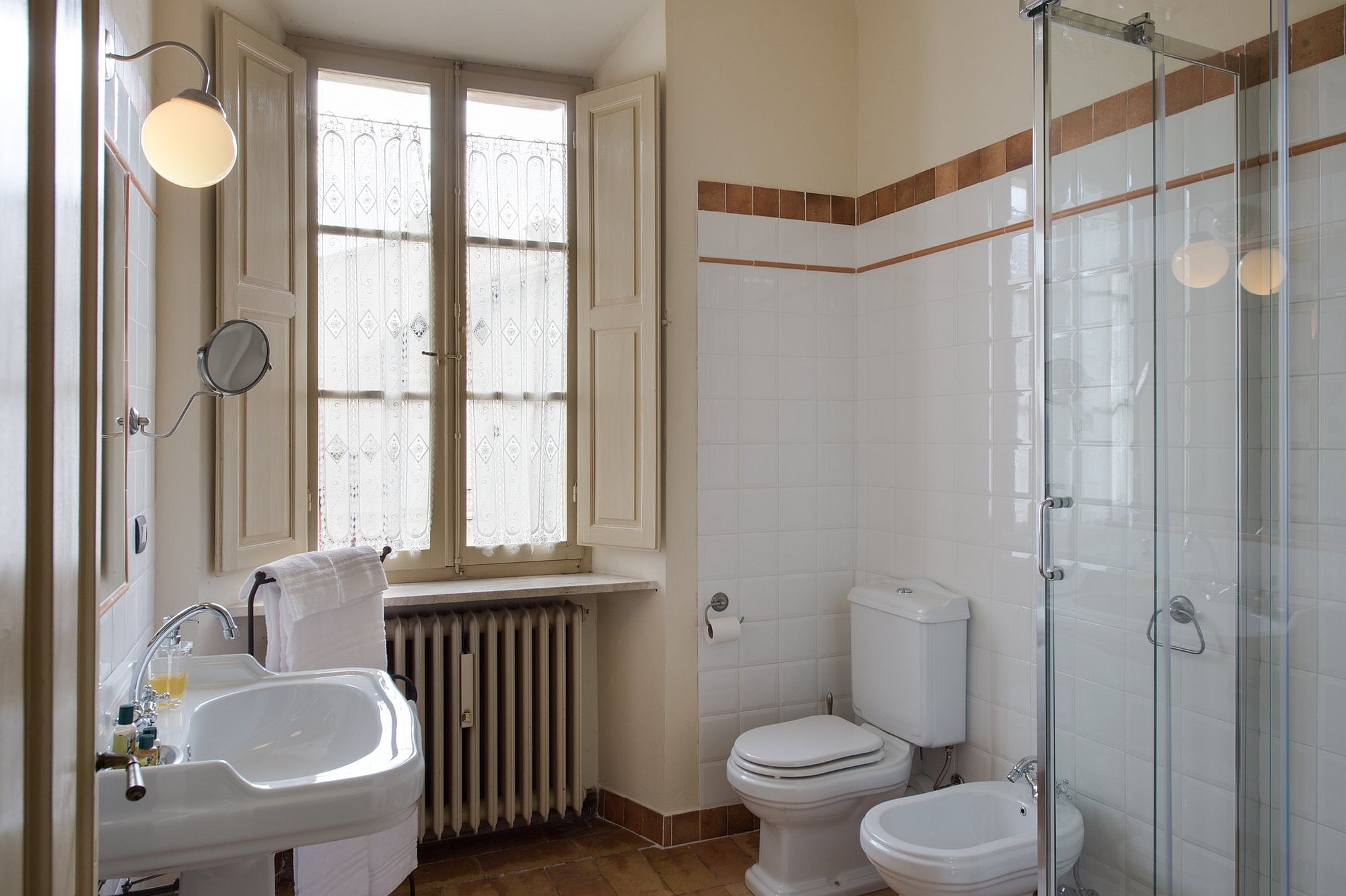 De binnenplaats biedt een rustige oase met rozen, citrusbomen, een pergola en een antieke fontein. Kleine balkons en panoramische ramen bieden uitzicht over het dorp en de omliggende Apennijnen, waardoor binnen- en buitenruimtes harmonieus worden verbonden.