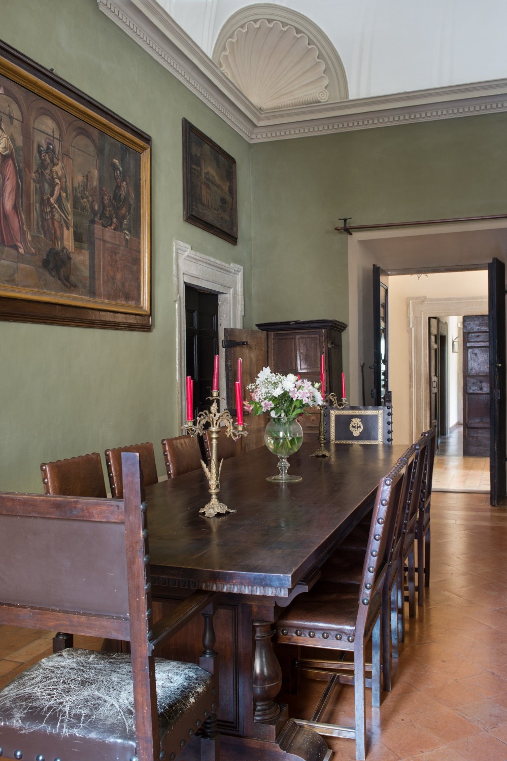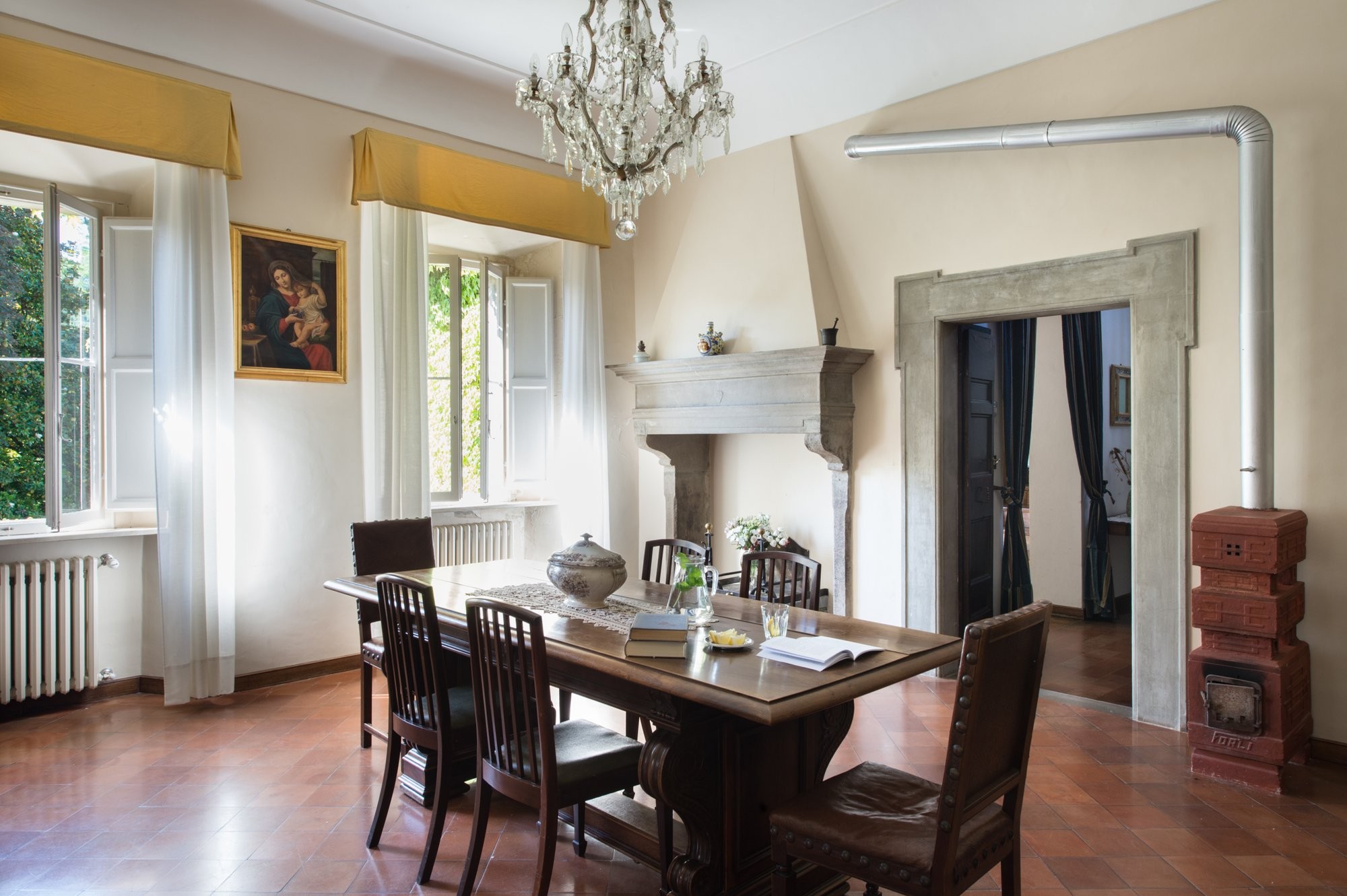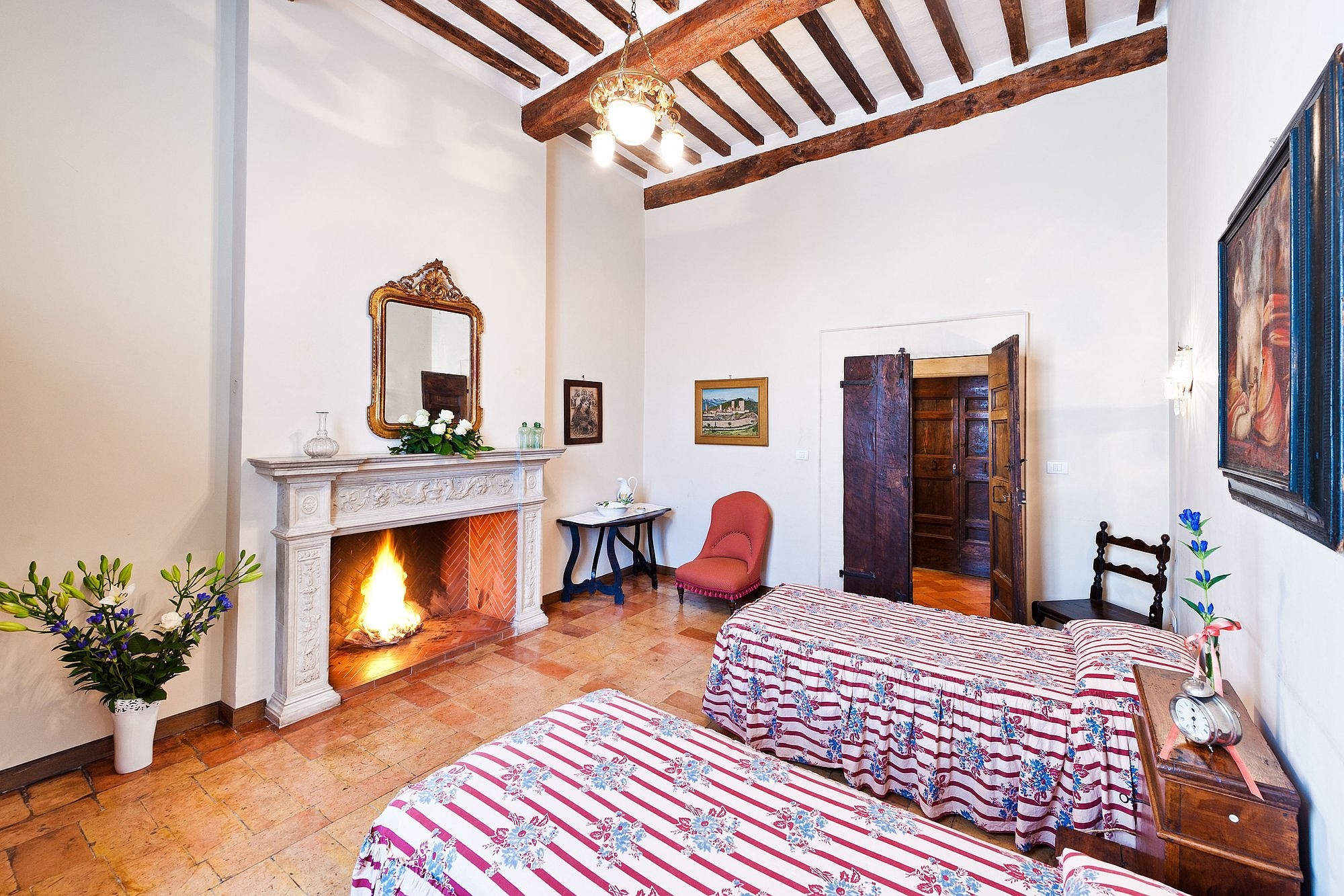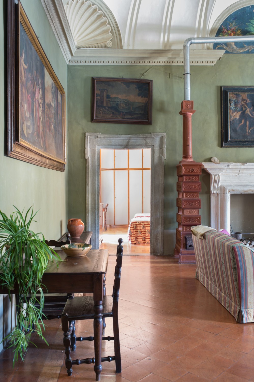 De linker vleugel herbergt het piano nobile, met originele renaissanceornamenten, hoge handgeschilderde fresco’s en muren die meer dan 500 jaar Italiaanse geschiedenis hebben meegemaakt. De rechter vleugel beslaat twee verdiepingen met ruime woonruimtes die historische charme combineren met modern comfort. Natuurlijk licht valt door hoge ramen en benadrukt gewelfde doorgangen, decoratieve lijstwerken en gebeeldhouwde deuren – elk detail weerspiegelt de adellijke erfenis van de residentie.