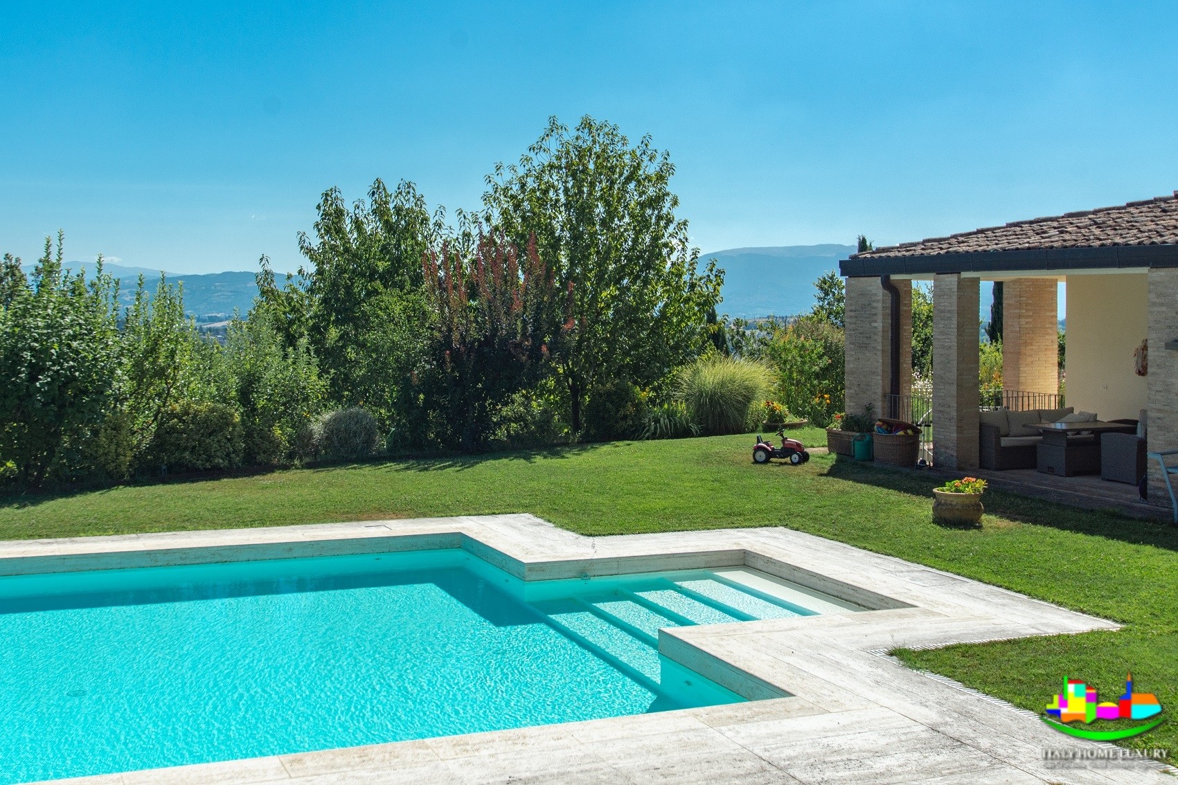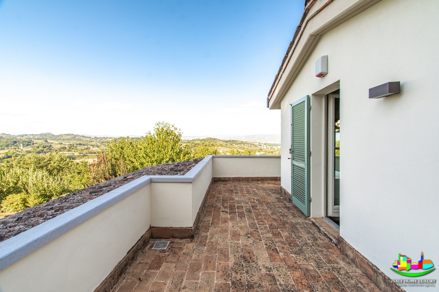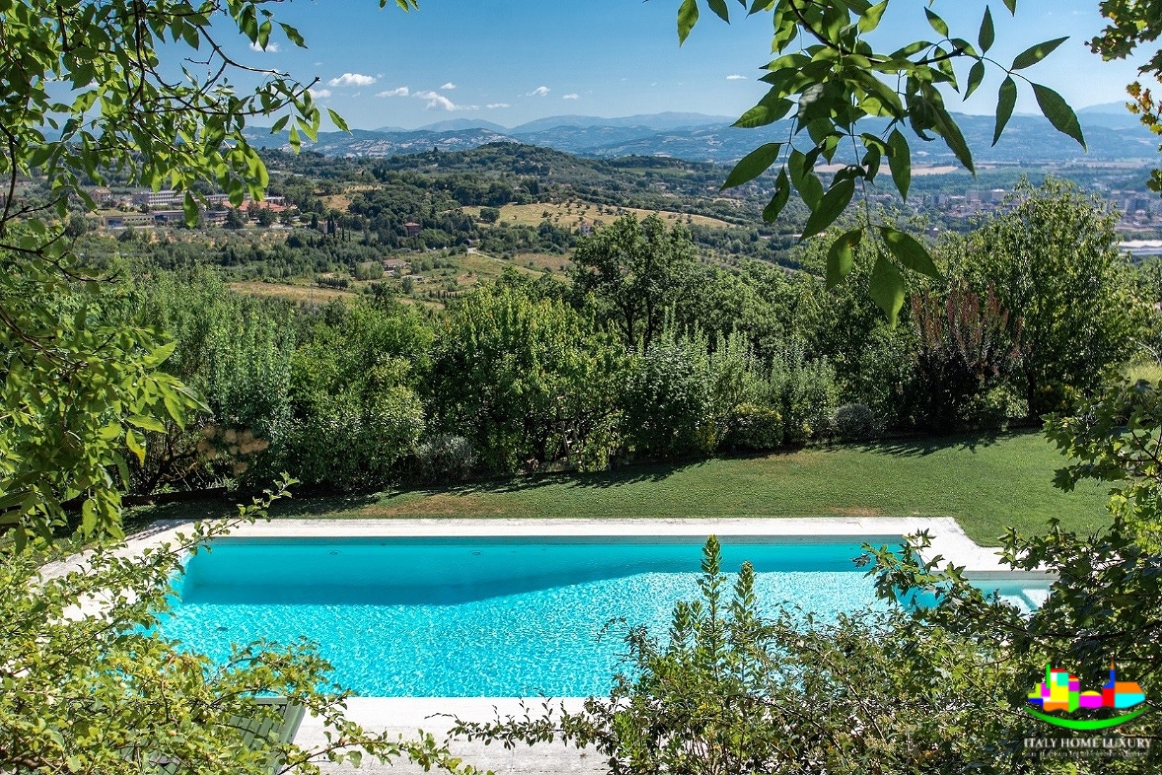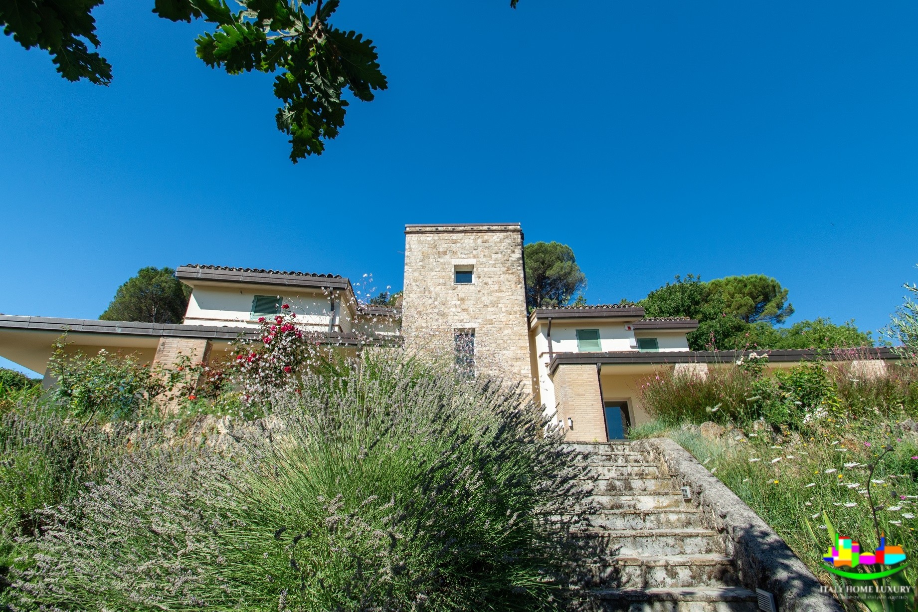 Gelegen in een rustige omgeving van Perugia, combineert dit landhuis historische charme met modern wooncomfort. Het middelpunt van het pand is een middeleeuwse duiventoren van travertin, aangevuld met twee vleugels met grote ramen en klassieke zadeldaken.