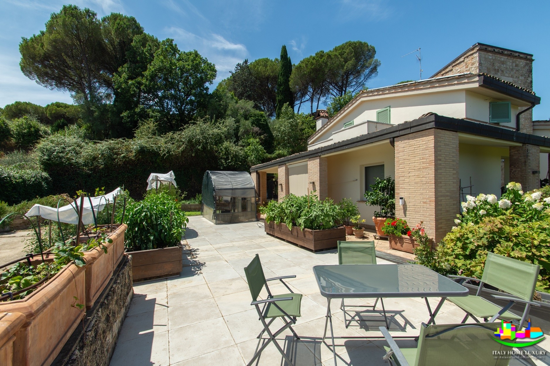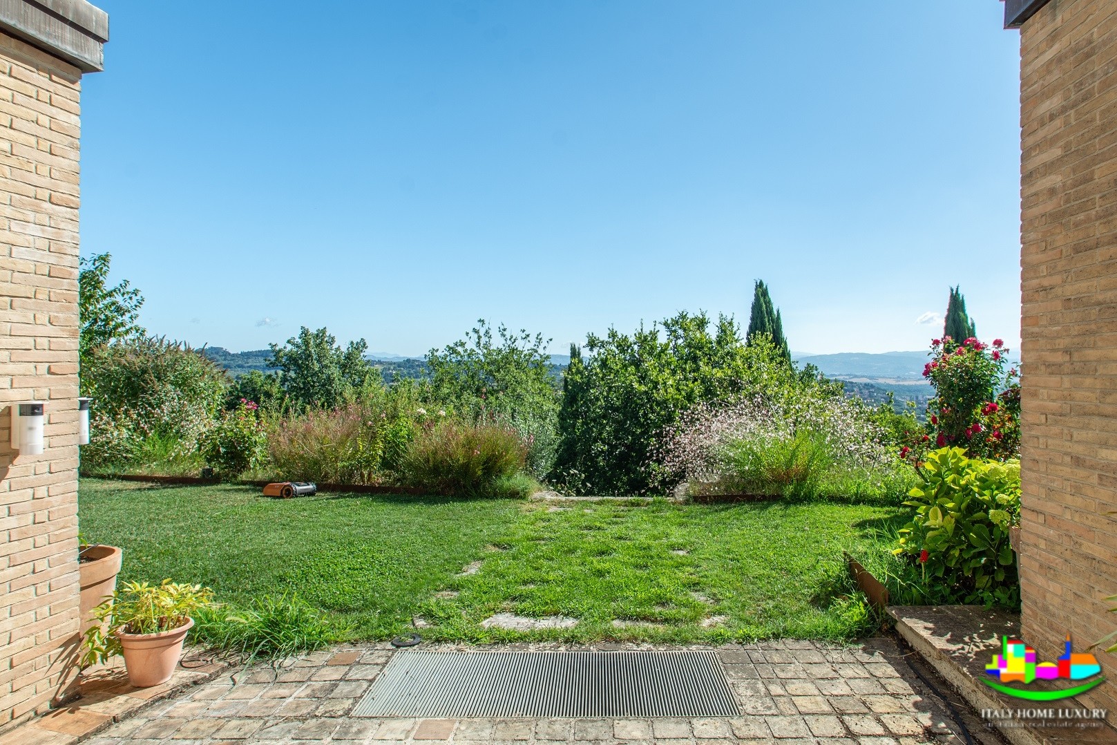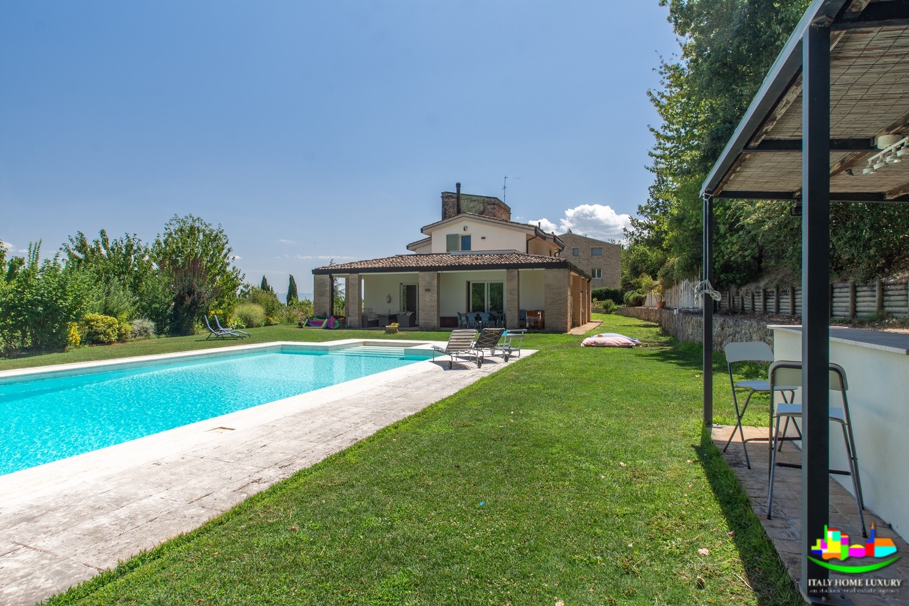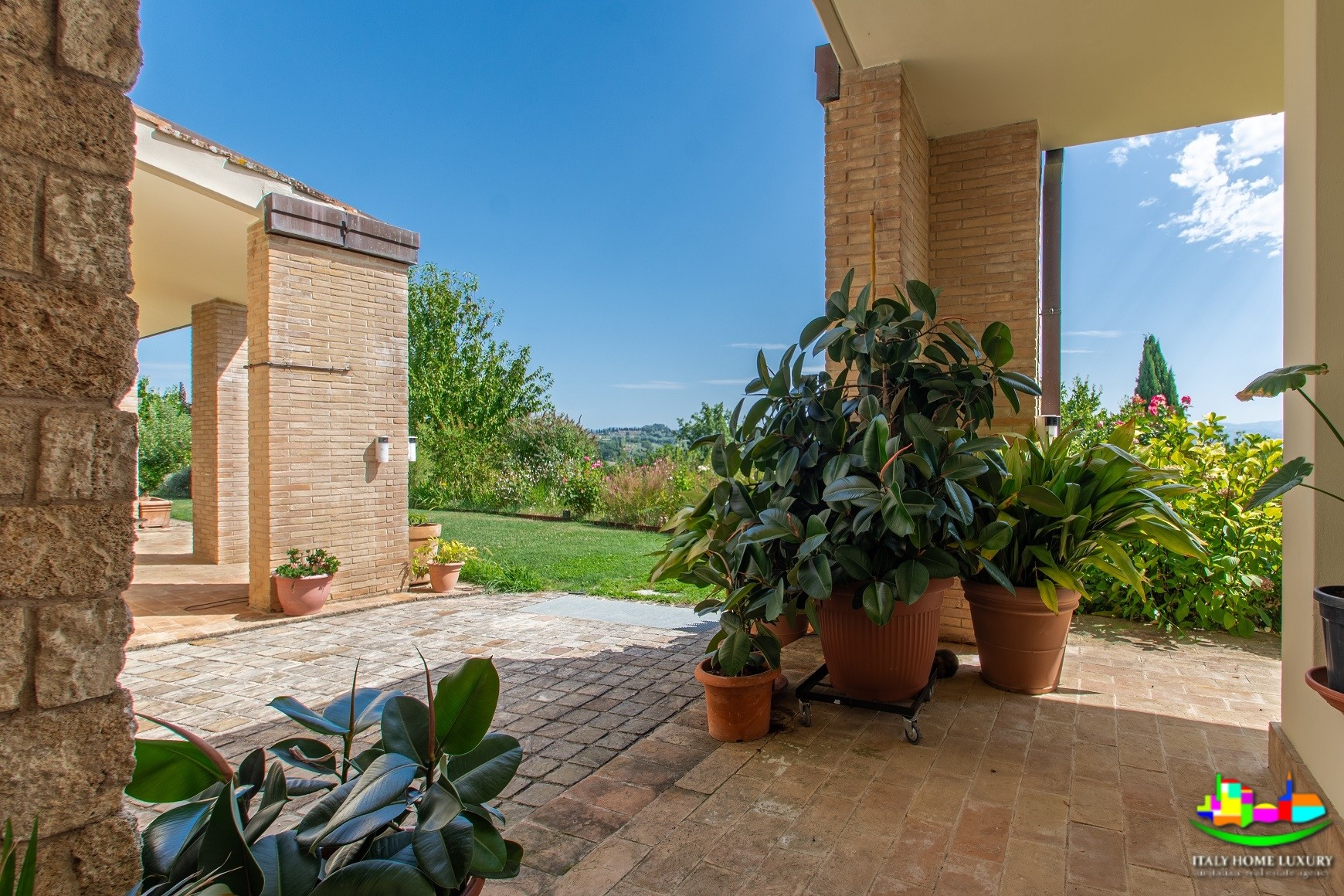 Gelegen in een rustige omgeving van Perugia, combineert dit landhuis historische charme met modern wooncomfort. Het middelpunt van het pand is een middeleeuwse duiventoren van travertin, aangevuld met twee vleugels met grote ramen en klassieke zadeldaken.