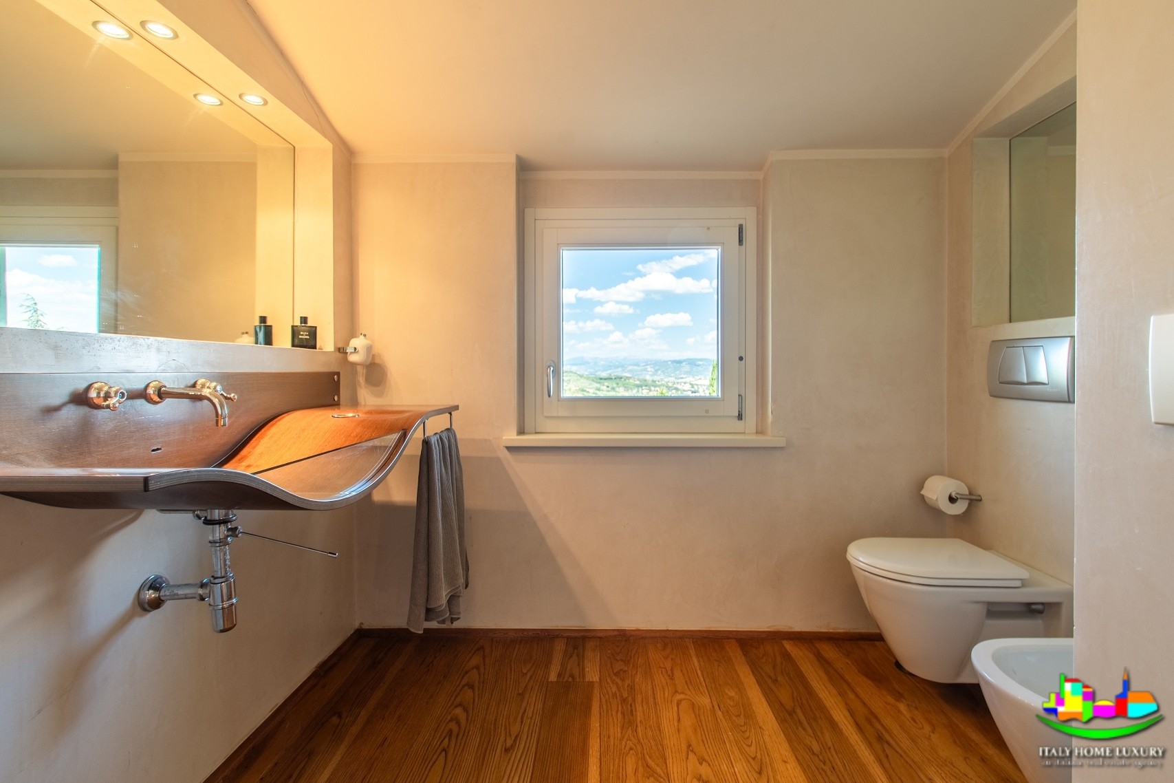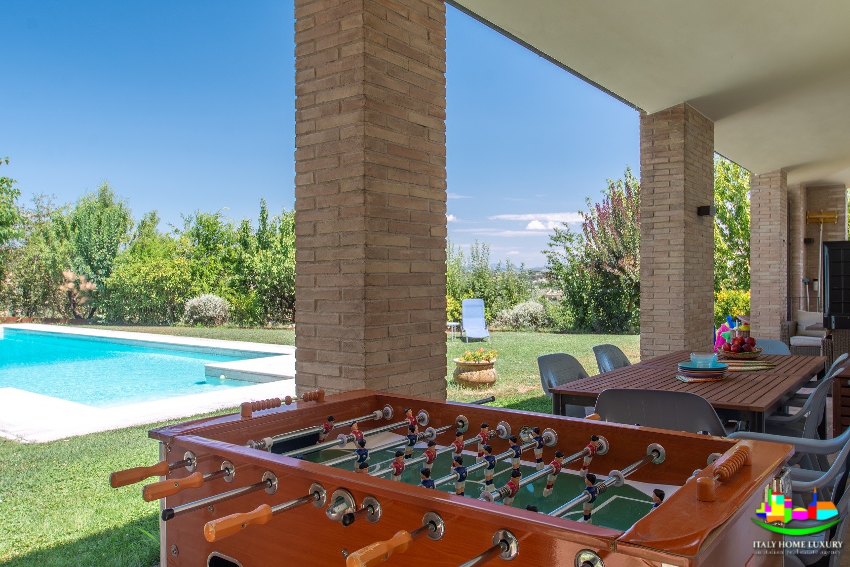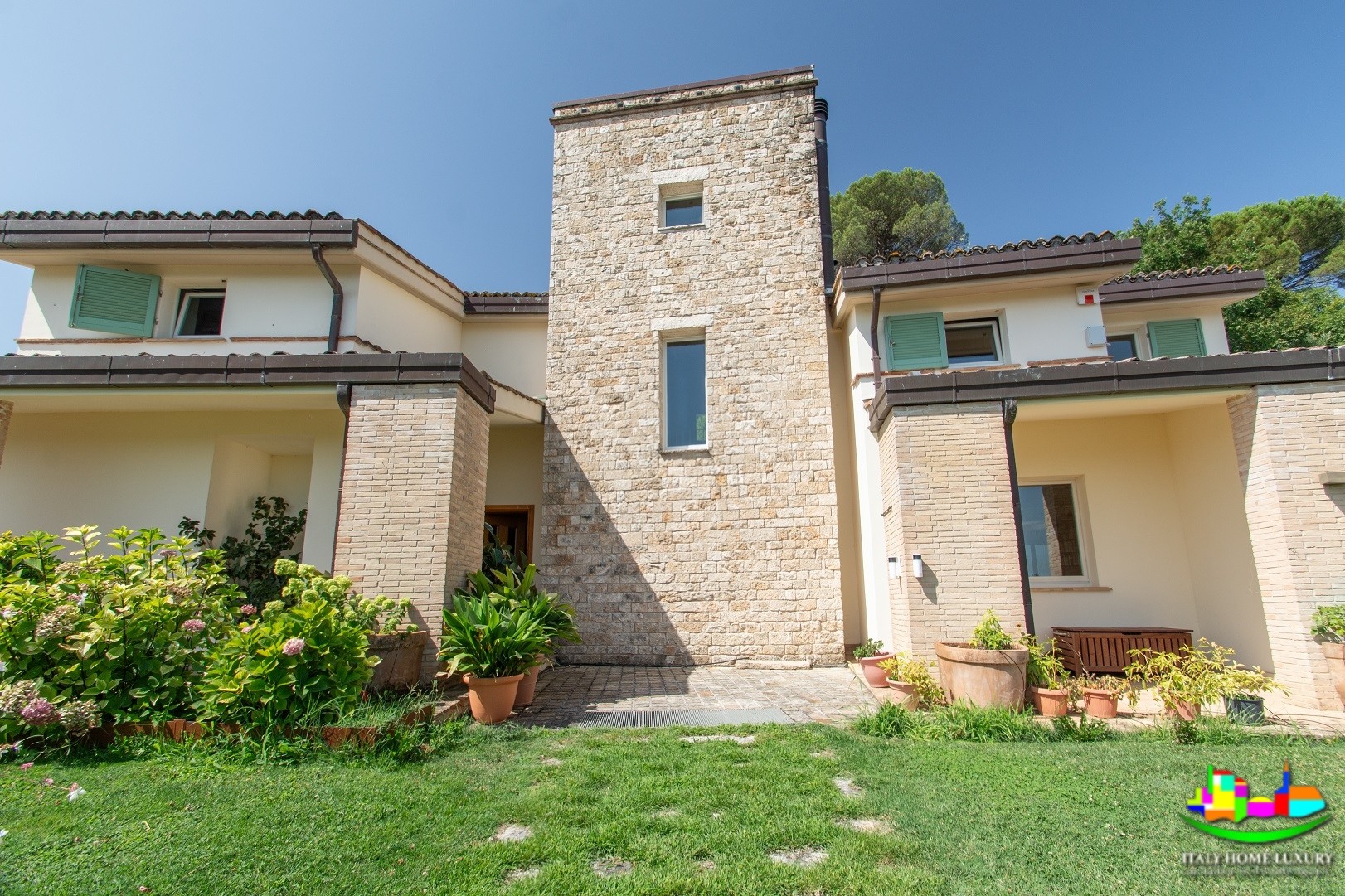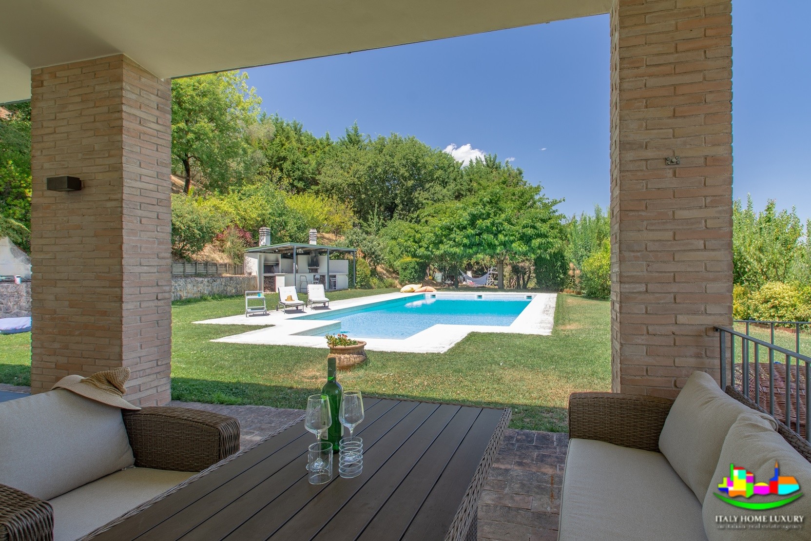 Gelegen in een rustige omgeving van Perugia, combineert dit landhuis historische charme met modern wooncomfort. Het middelpunt van het pand is een middeleeuwse duiventoren van travertin, aangevuld met twee vleugels met grote ramen en klassieke zadeldaken.