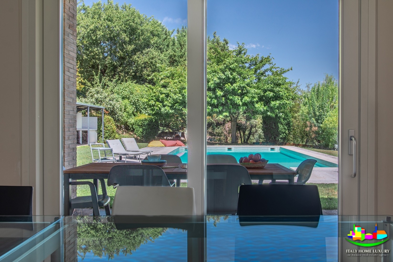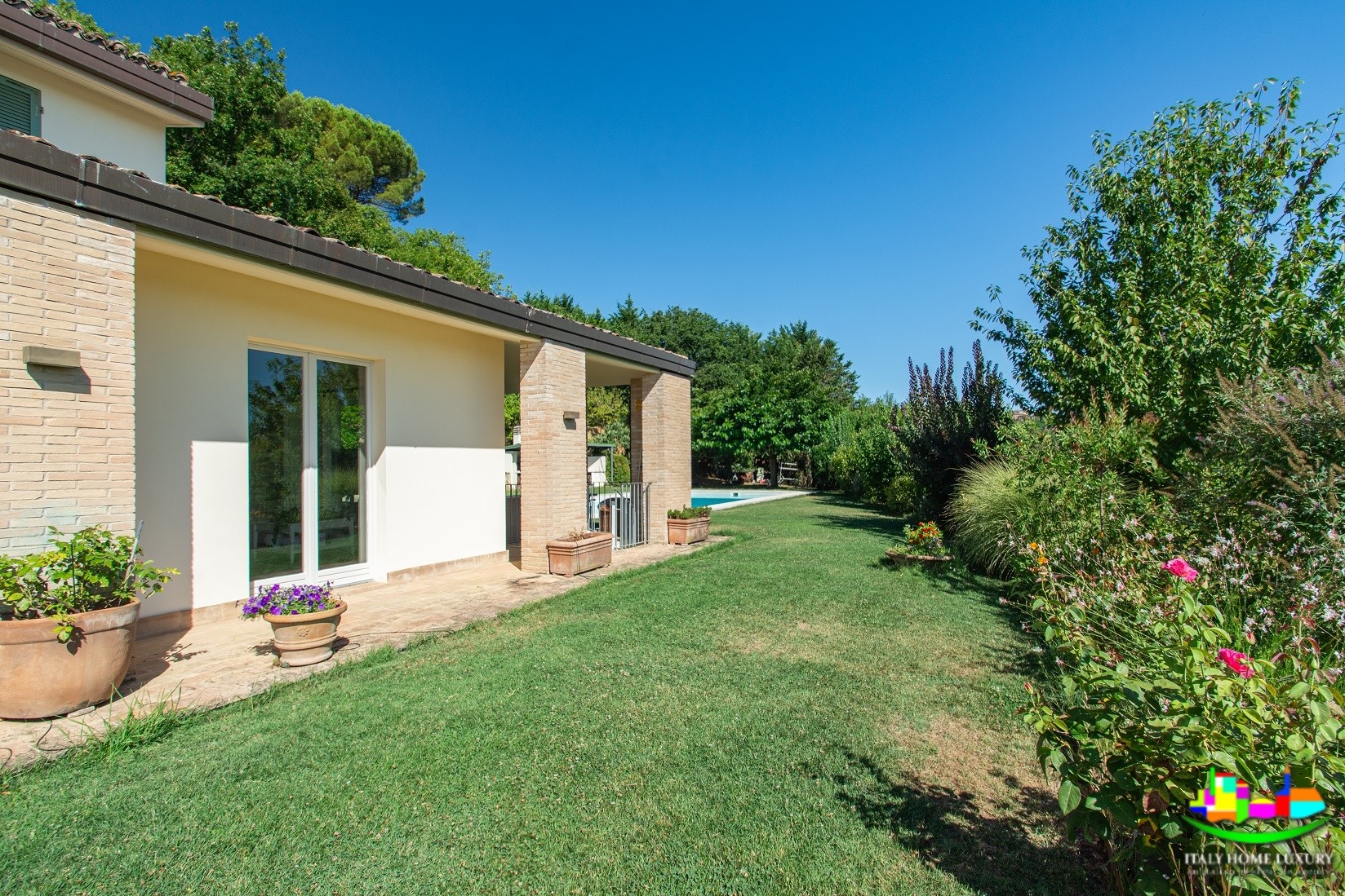 Een arcade met terracottakolommen omlijst het gebouw en leidt naar het ruime zwembad aan de noordzijde. Aan de zuidzijde ligt een terras met uitzicht op de tuin, beplant met rozen, hortensia’s en een dichte jasmijnhaag, die veel privacy biedt.