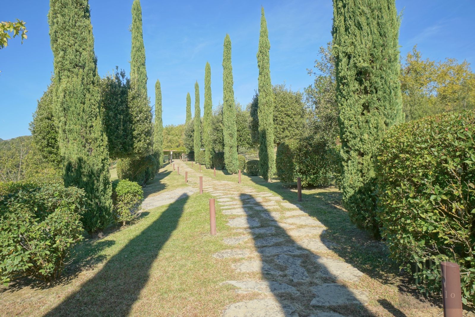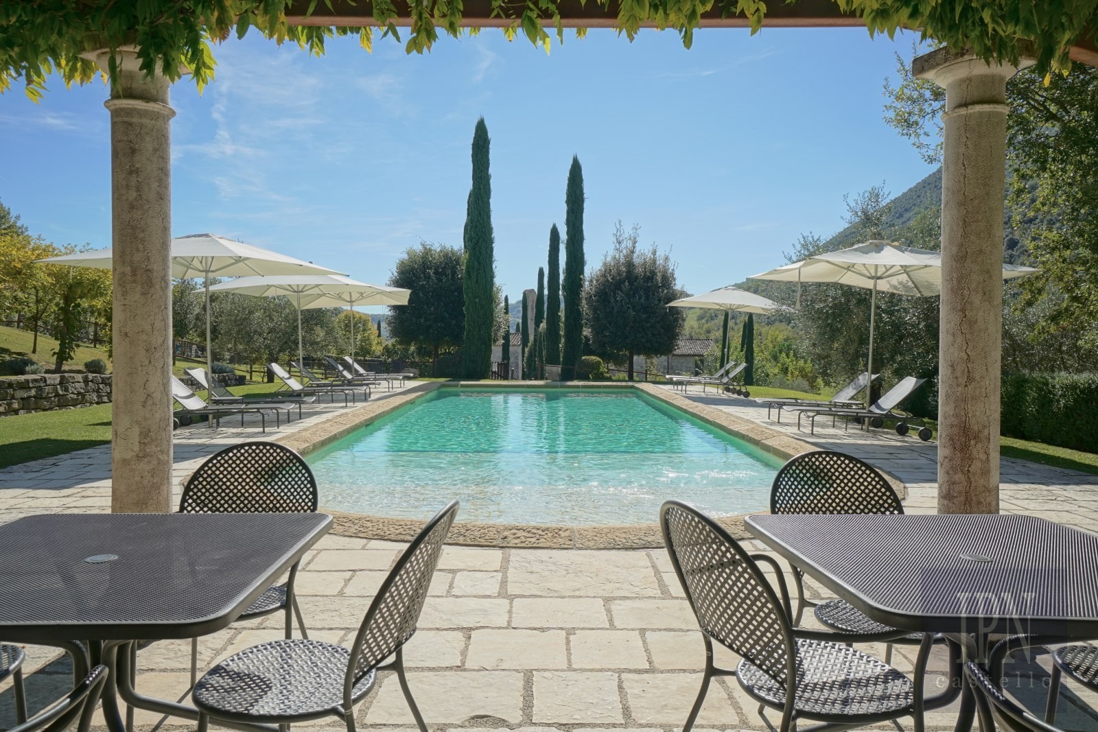 Het buitenterrein van 3,77 ha omvat een truffelbos van 2,7 ha, aangelegde tuinen met lavendel, rozemarijn en eeuwenoude olijfbomen, stenen terrassen en overdekte eetruimtes. Een kleine vijver met fontein en een moestuin completeren het geheel. Het zwembad van 15 x 5,5 m is omgeven door gazons en uitgerust met poolhouse, buitendouche en pergola.
