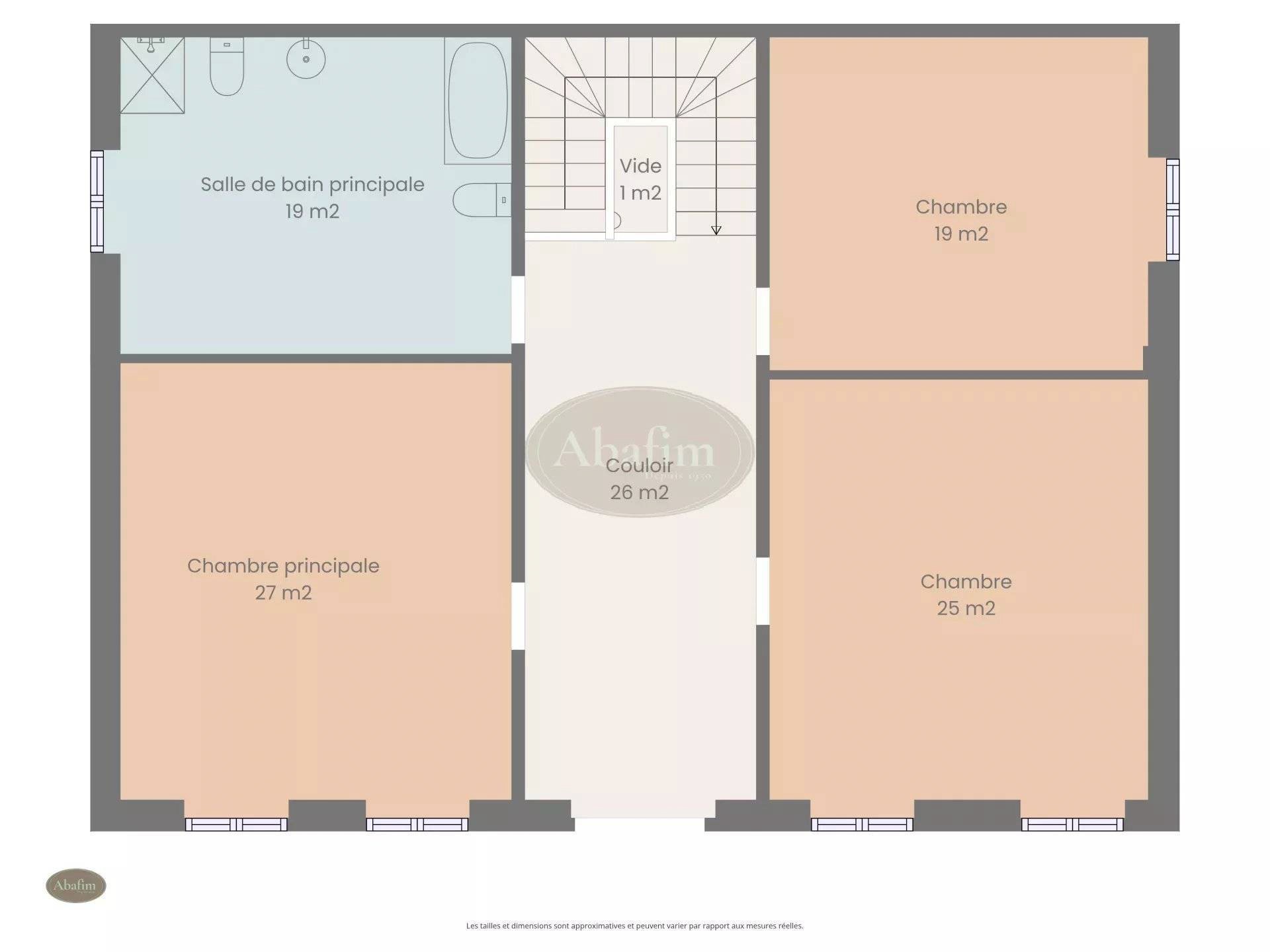 Op de eerste verdieping bevinden zich vier grote kamers van ongeveer 20 m² elk, bestaande uit drie slaapkamers en een ruime badkamer met douche en ligbad.