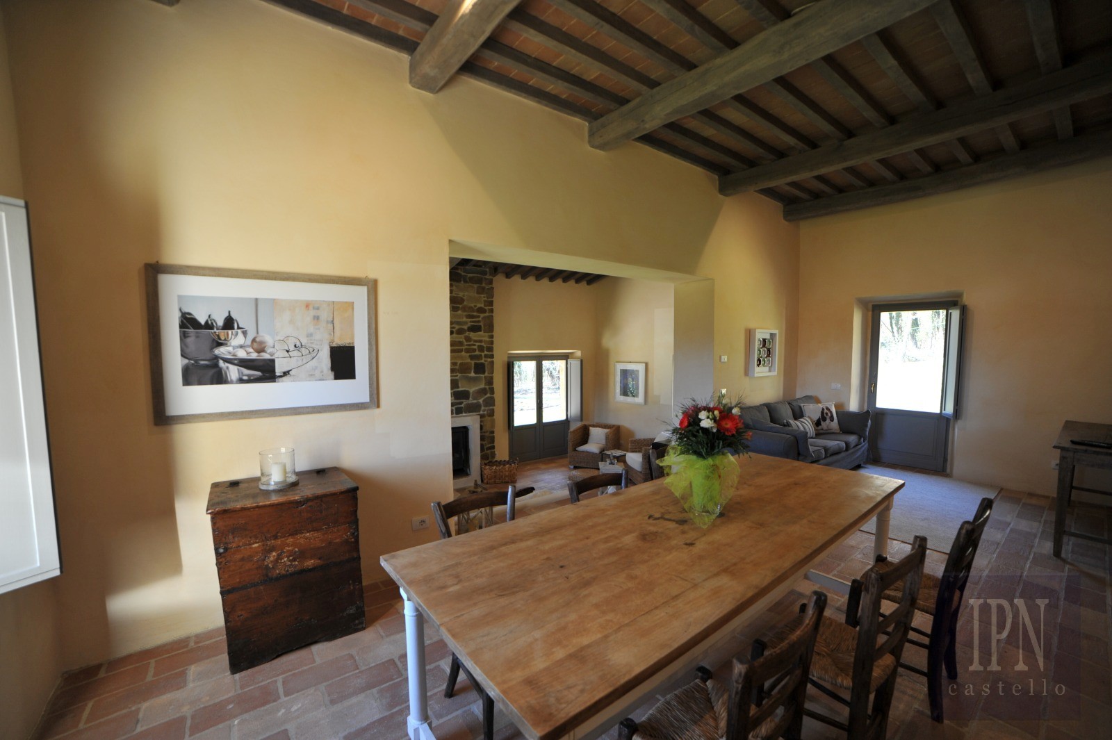 Het huis is ruim en karaktervol, verdeeld over twee verdiepingen. Op de begane grond strekt de woonruimte zich uit over drie niveaus, wat zowel vloeiendheid als persoonlijkheid aan de ruimte geeft. Op het bovenste niveau bevindt zich de volledig uitgeruste keuken, die uitkomt op een pergola met blauwe regen en een grote tafel – ideaal voor lange lunches of diners buiten. Enkele treden lager bevindt zich de ruime eetkamer, met daaronder een comfortabele woonkamer met open haard. Vanaf hier leiden twee dubbele deuren naar een grote, weerbestendige overdekte pergola met uitzicht op het zwembad – perfect voor ontspannen avonden of als tweede eetruimte buiten.