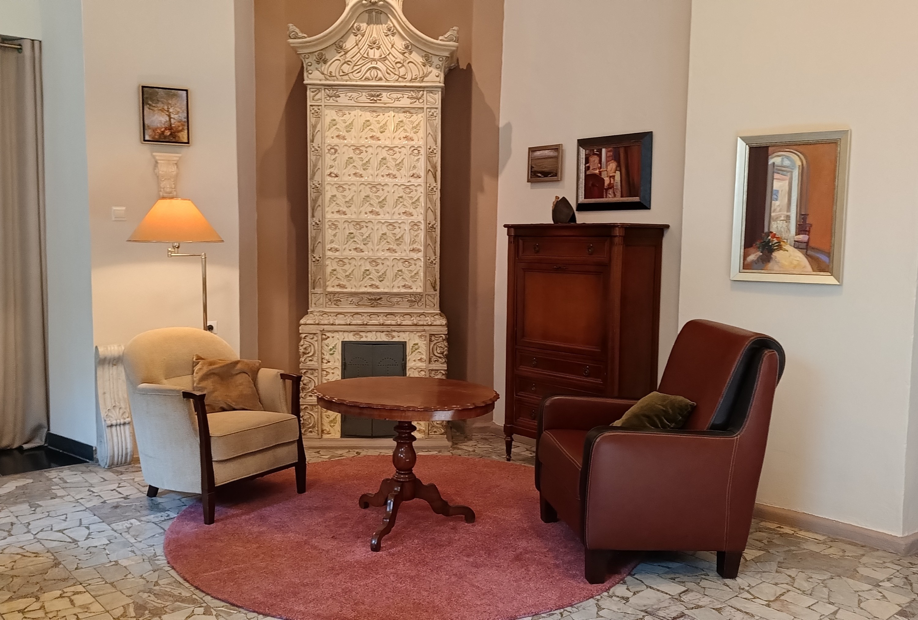 In het kasteel zijn twee originele tegelkachels in zeer goede staat uit het einde van de 19e eeuw bewaard gebleven. Ze bevinden zich in de ovale hal, die vroeger door een koepel werd bekroond. In deze zaal is er een uitgang naar het oosten naar het terras met uitzicht op het landschapspark. Tijdens de tot nu toe uitgevoerde restauraties heeft het paleis een deel van zijn oorspronkelijke karakter teruggekregen.