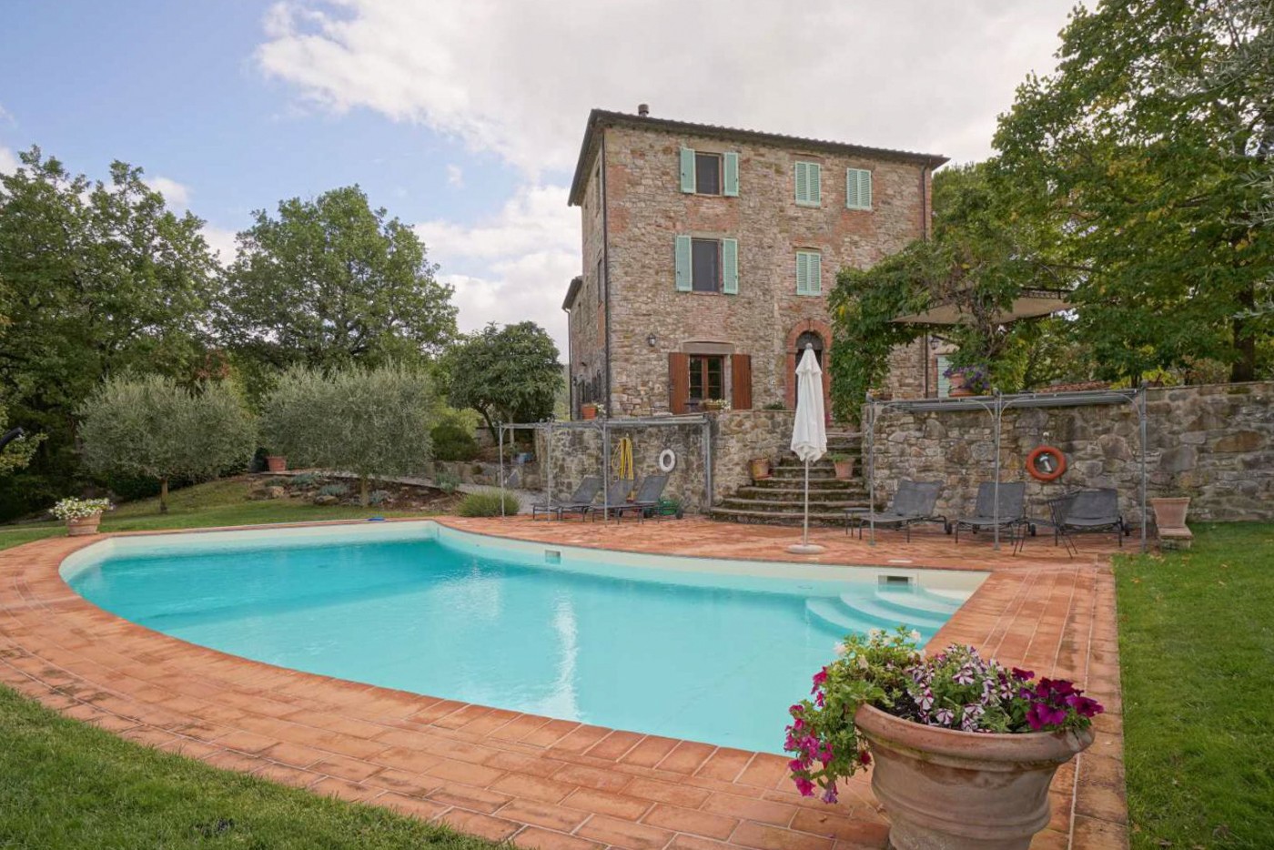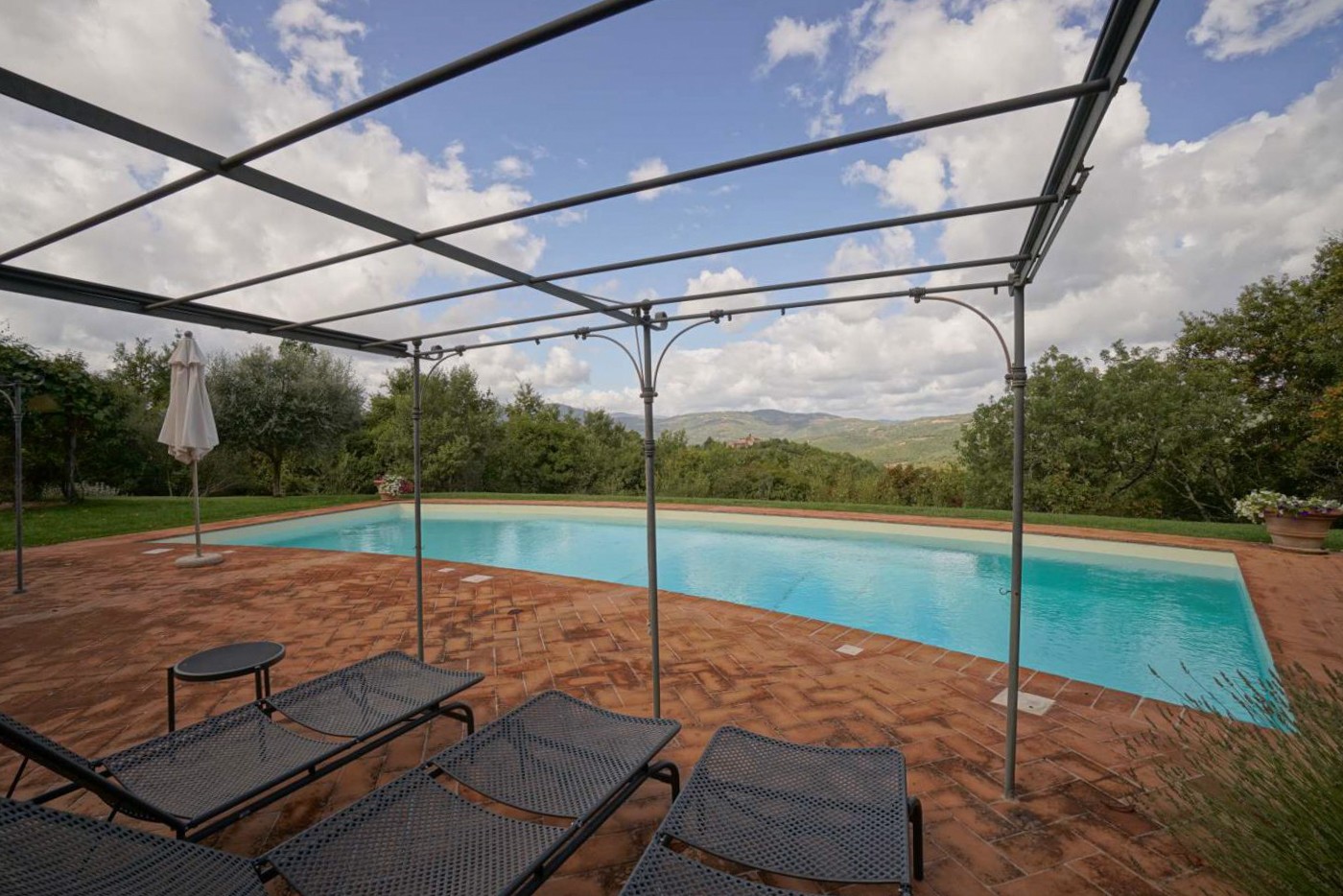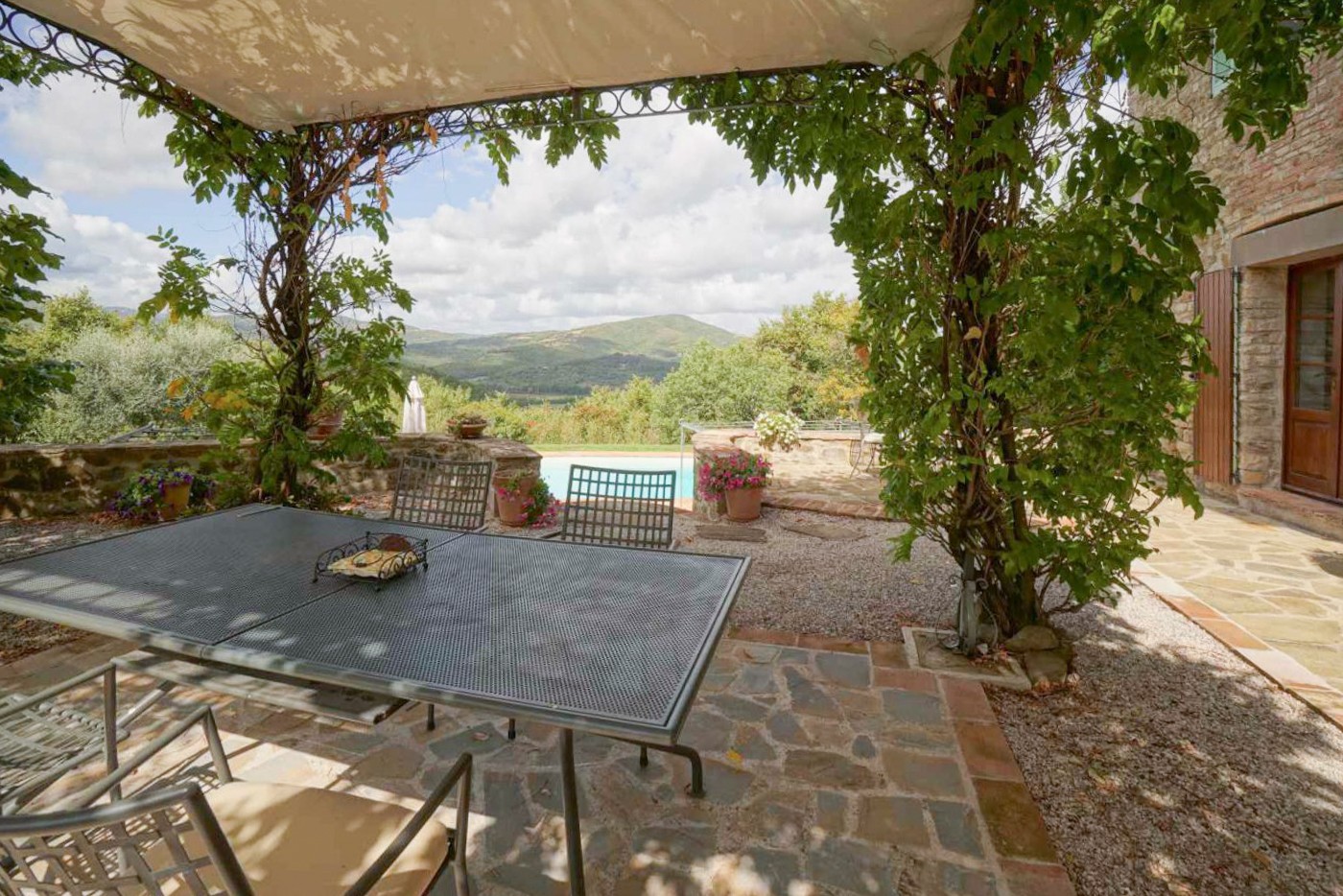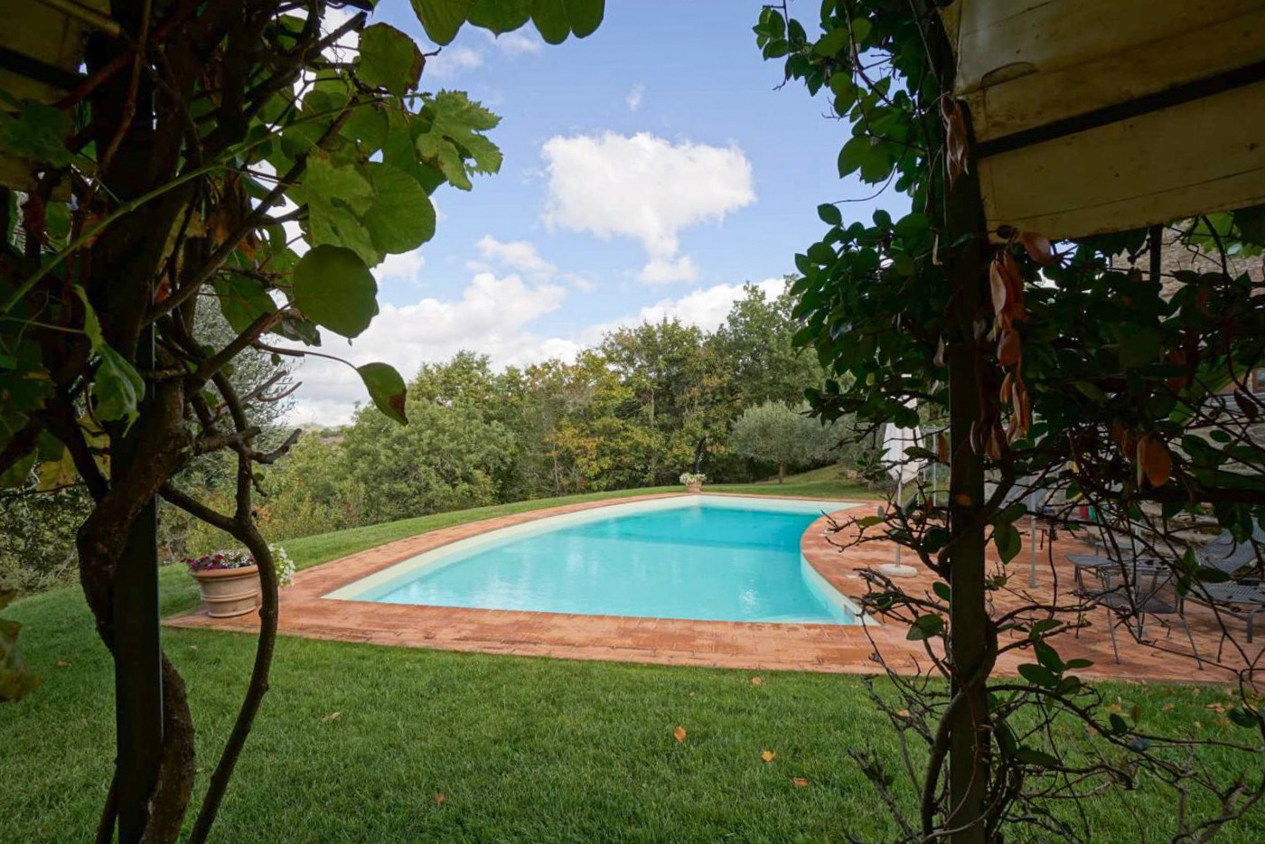 Vanuit de eetkamer is er toegang tot de achtertuin, waar een gebogen zwembad een prachtig panoramisch uitzicht biedt over de Niccone-vallei. De tegels rond het zwembad zijn vernieuwd en vergroot, waardoor er meer ruimte is om te ontspannen.