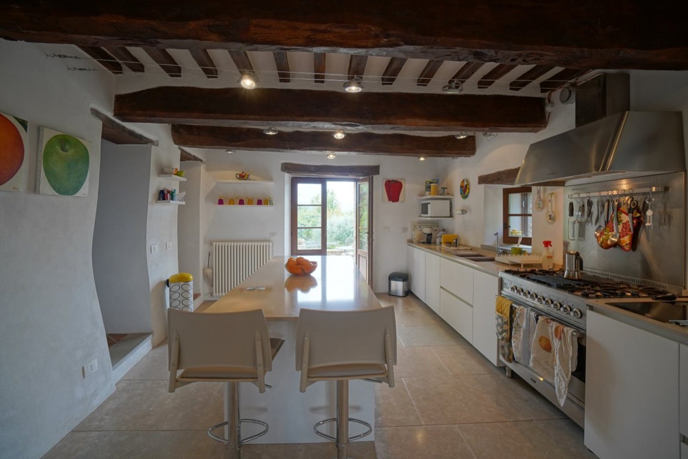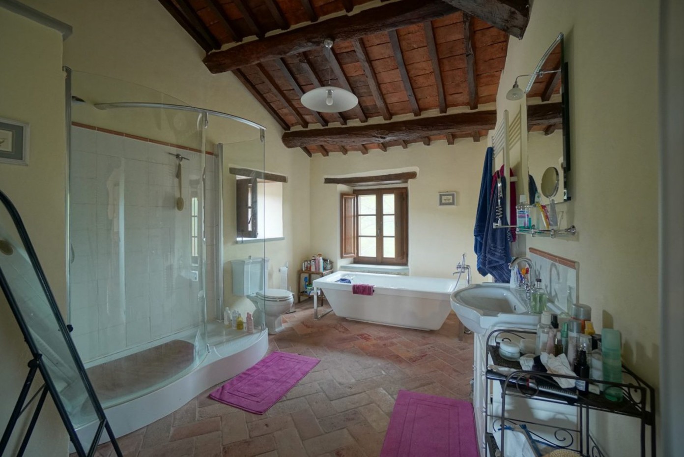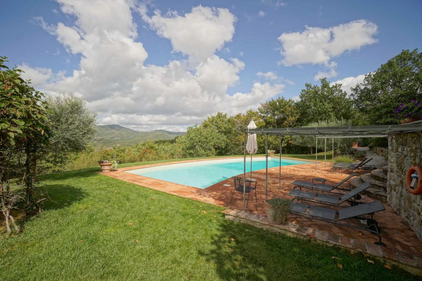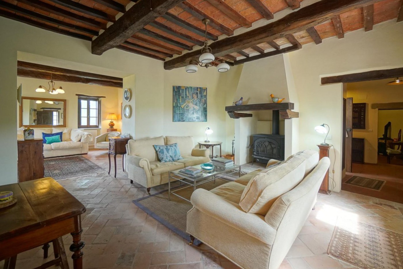 Vanuit de eetkamer is er toegang tot de achtertuin, waar een gebogen zwembad een prachtig panoramisch uitzicht biedt over de Niccone-vallei. De tegels rond het zwembad zijn vernieuwd en vergroot, waardoor er meer ruimte is om te ontspannen.