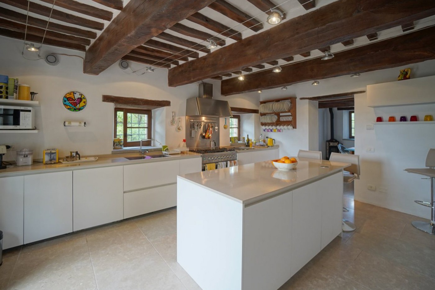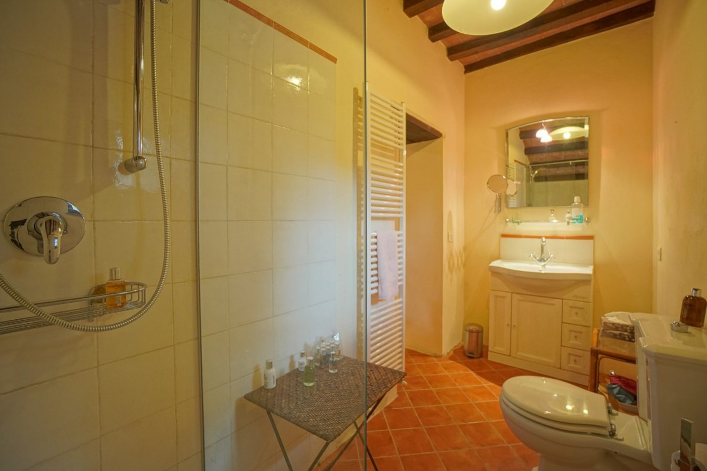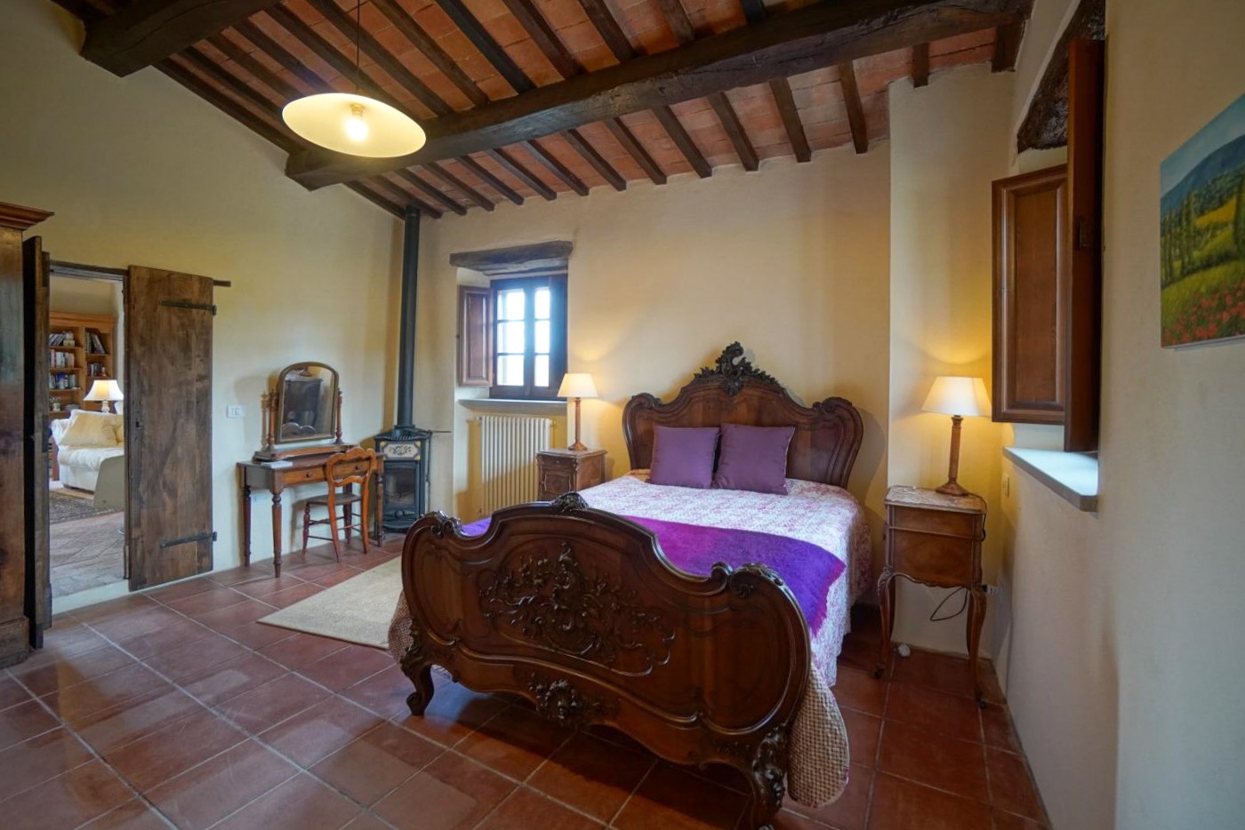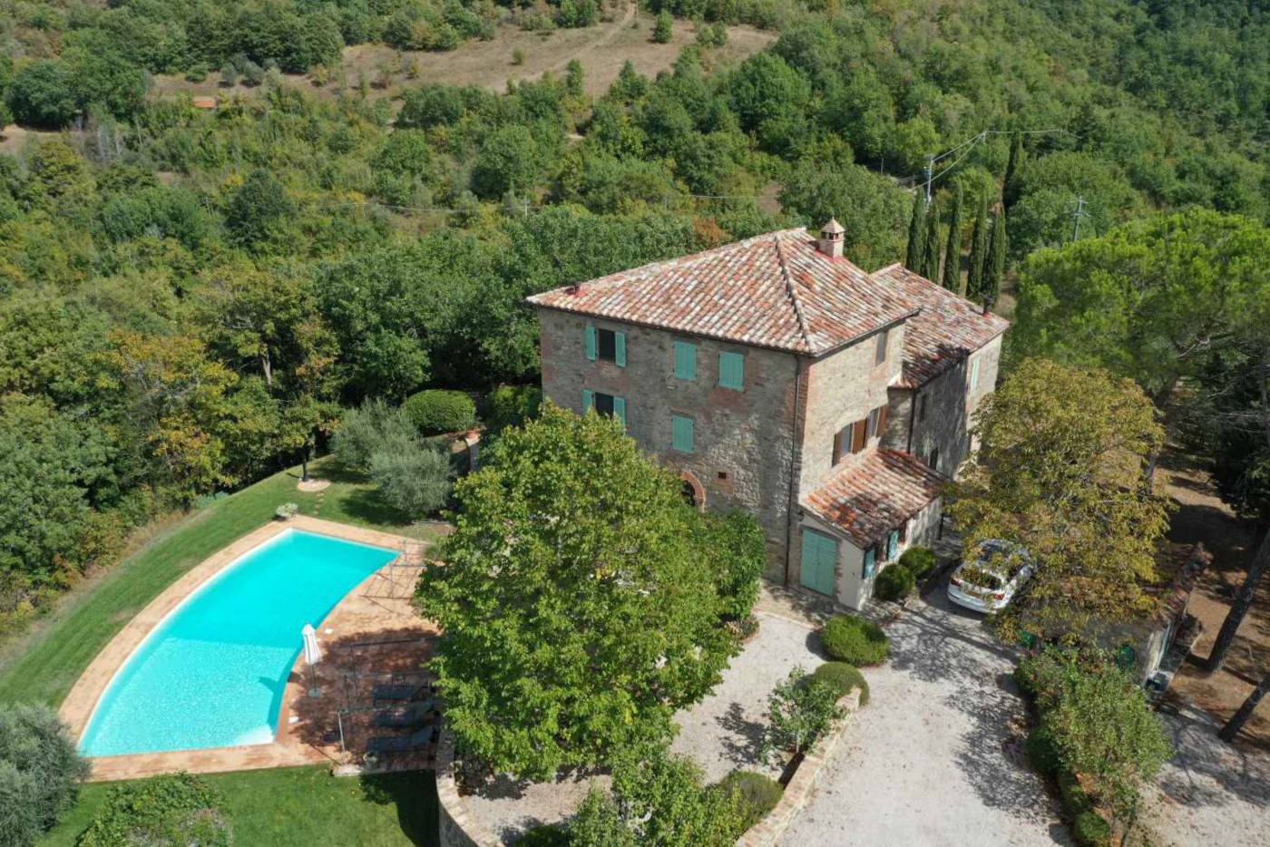 Vanuit de eetkamer is er toegang tot de achtertuin, waar een gebogen zwembad een prachtig panoramisch uitzicht biedt over de Niccone-vallei. De tegels rond het zwembad zijn vernieuwd en vergroot, waardoor er meer ruimte is om te ontspannen.