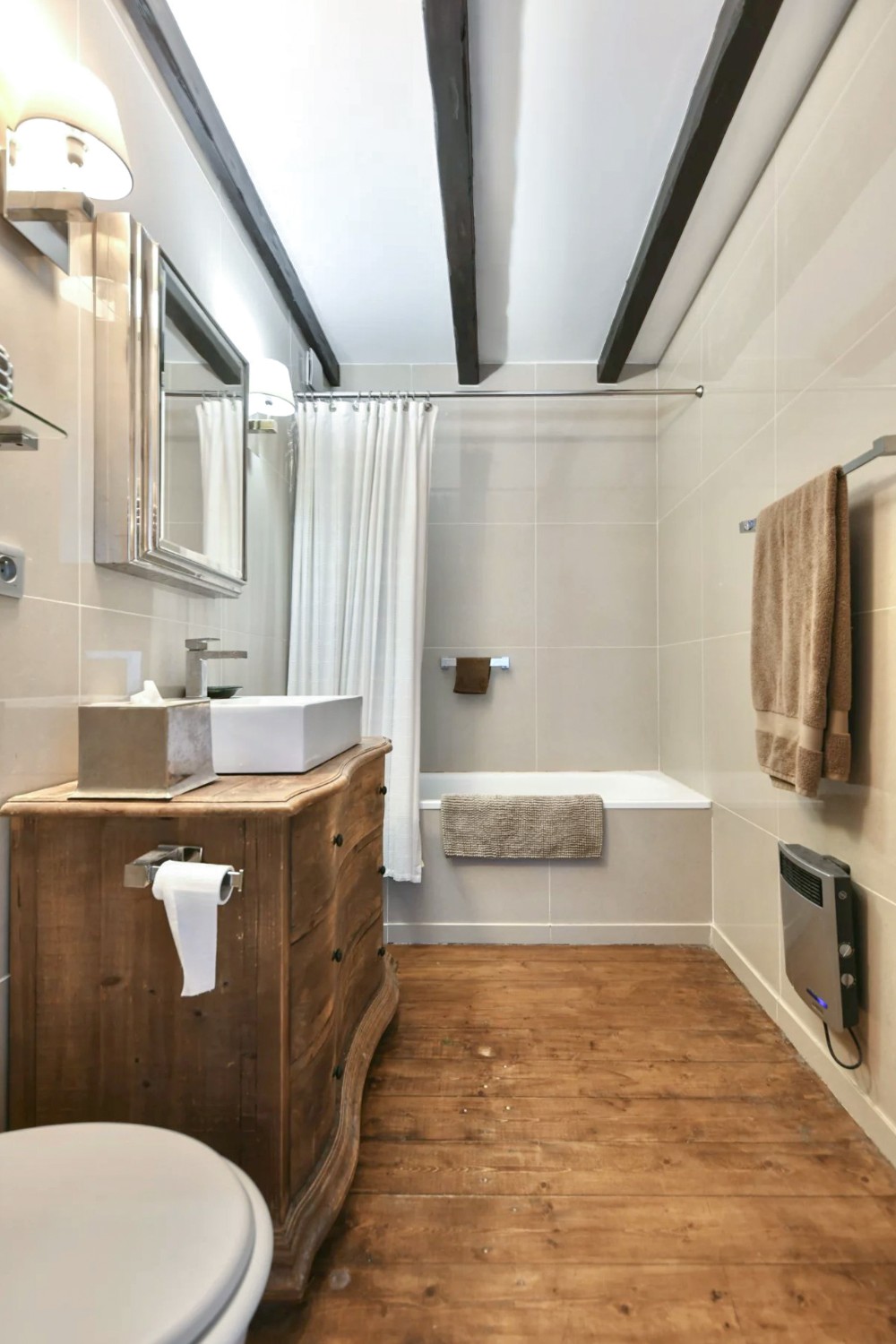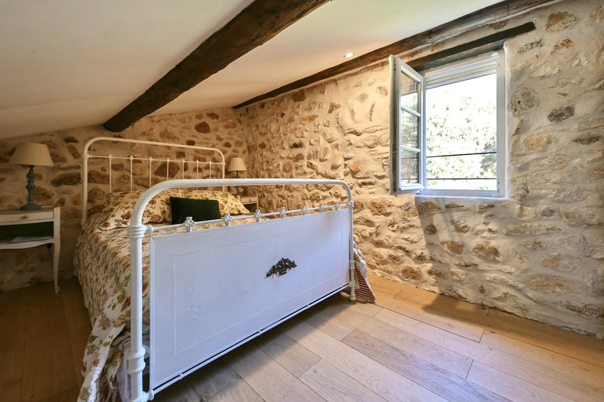 Op de eerste verdieping, links van de overloop, ligt een ruime slaapkamer met uitzicht op de tuin en zichtbare houten balken. Aan de andere kant bevinden zich een tweede slaapkamer en een elegant badkamer met wastafel, ligbad en toilet.