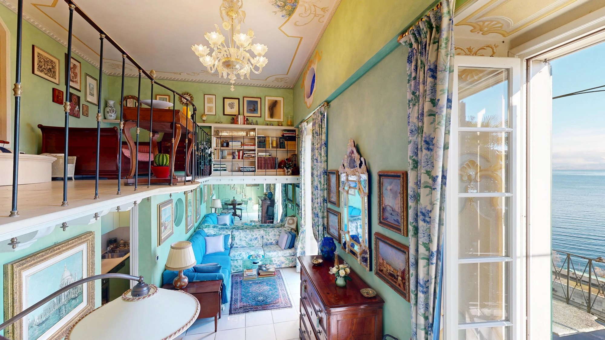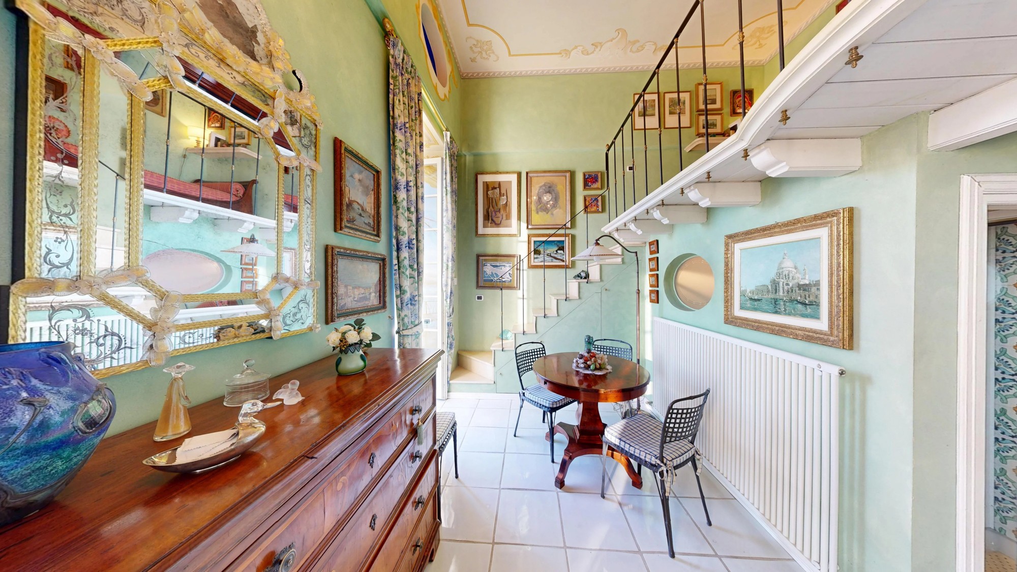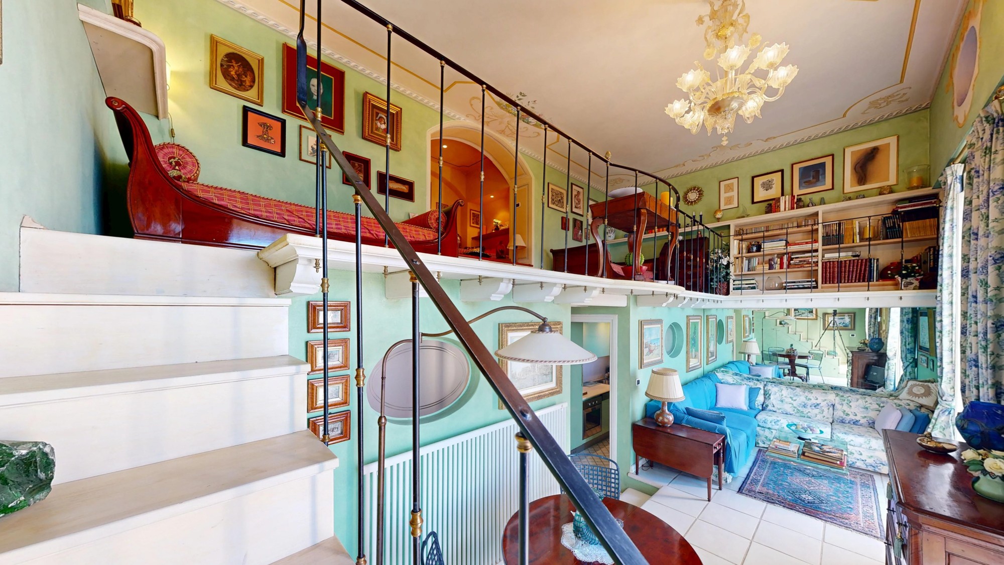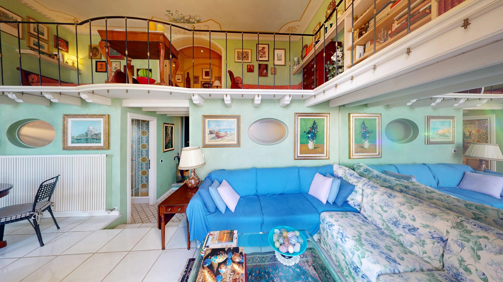 De woonruimte op de begane grond opent zich naar een groot terras met een prachtig uitzicht op het meer. Deze verdieping omvat ook een kitchenette en een badkamer met Vietri-tegels. Op de mezzanine bevindt zich de slaapruimte met een ingebouwd bed en een op maat gemaakte boekenkast. Pastelgekleurde fresco’s en Venetiaanse stucdecoraties kenmerken het interieur.