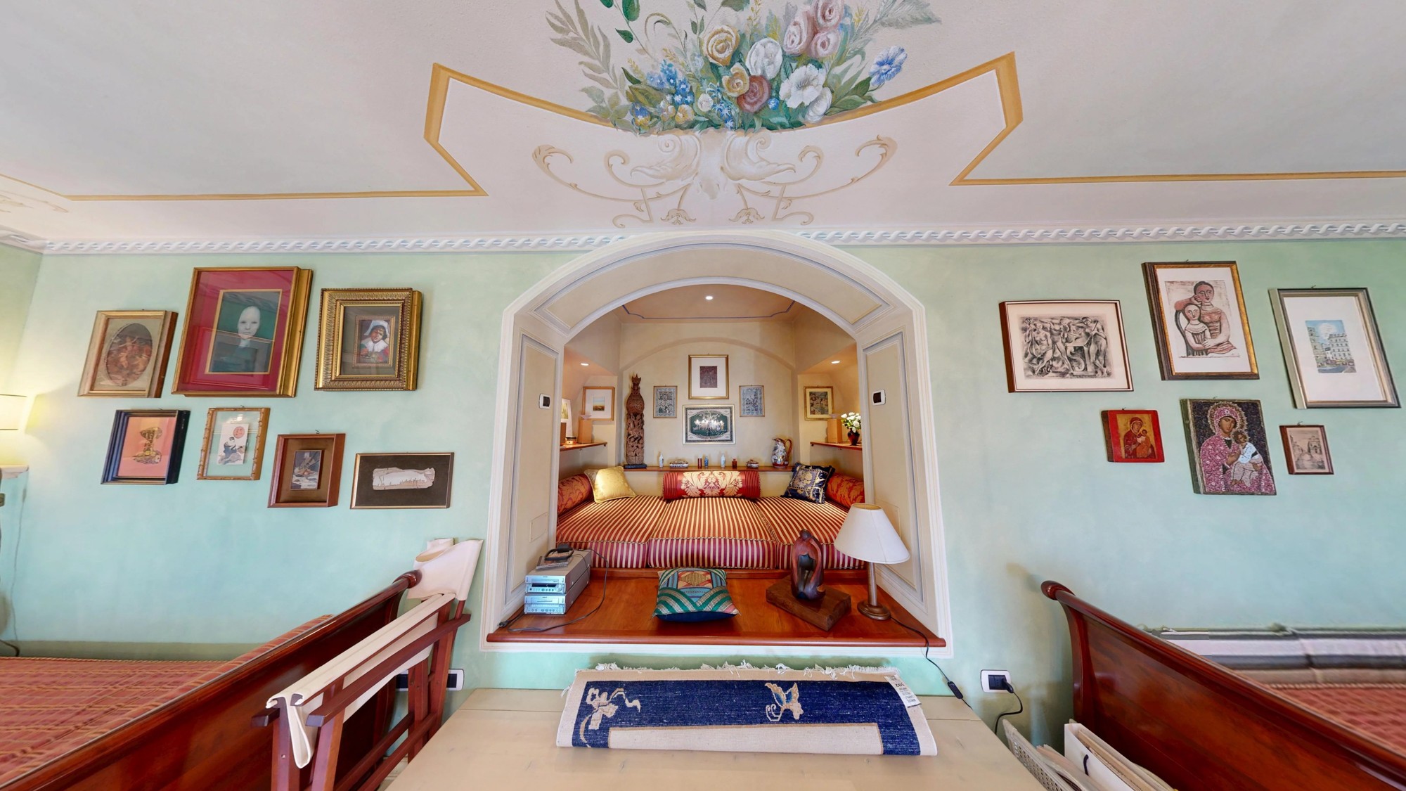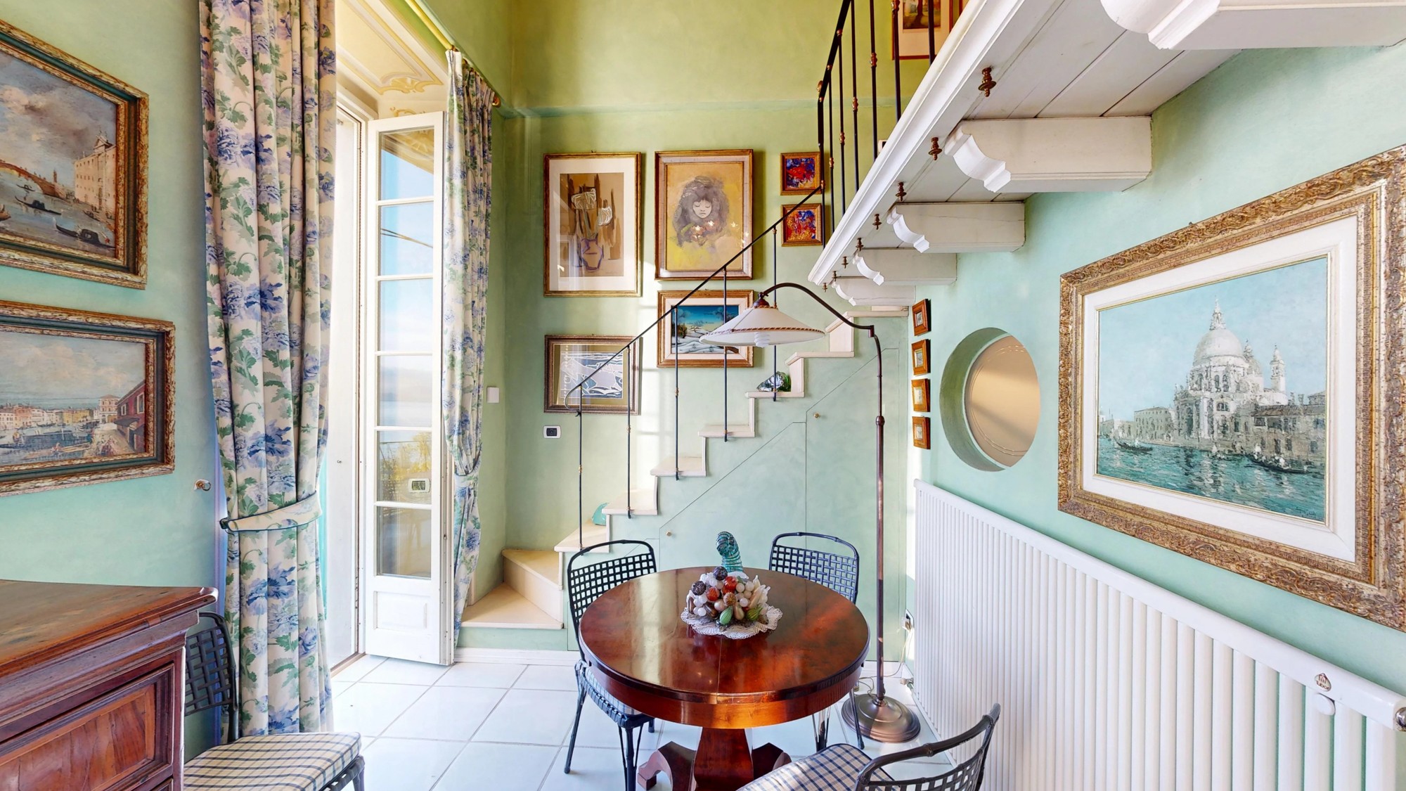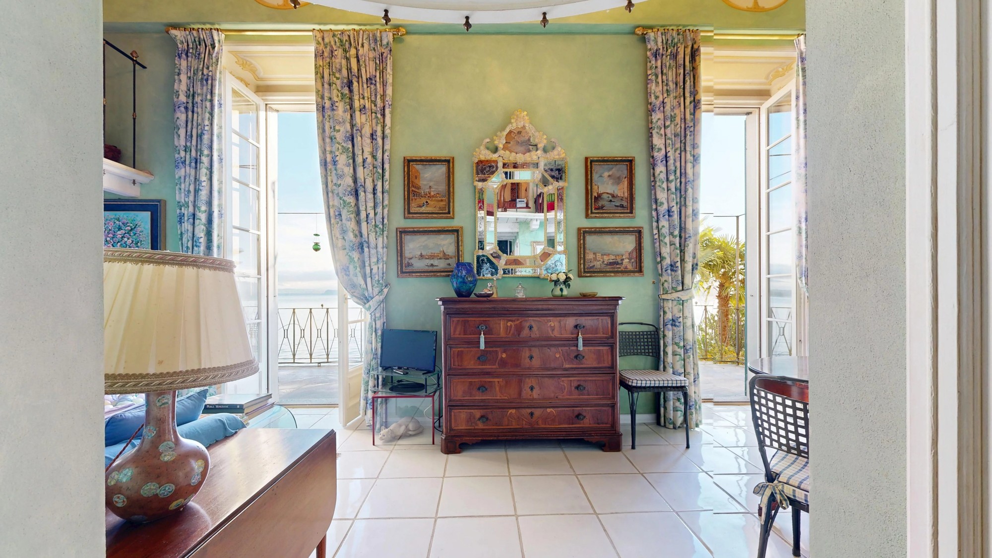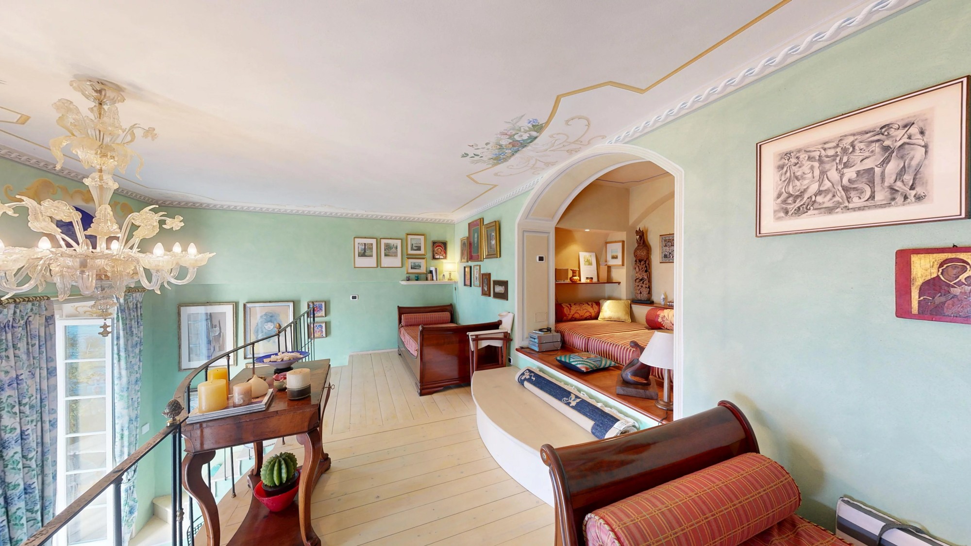 De woonruimte op de begane grond opent zich naar een groot terras met een prachtig uitzicht op het meer. Deze verdieping omvat ook een kitchenette en een badkamer met Vietri-tegels. Op de mezzanine bevindt zich de slaapruimte met een ingebouwd bed en een op maat gemaakte boekenkast. Pastelgekleurde fresco’s en Venetiaanse stucdecoraties kenmerken het interieur.