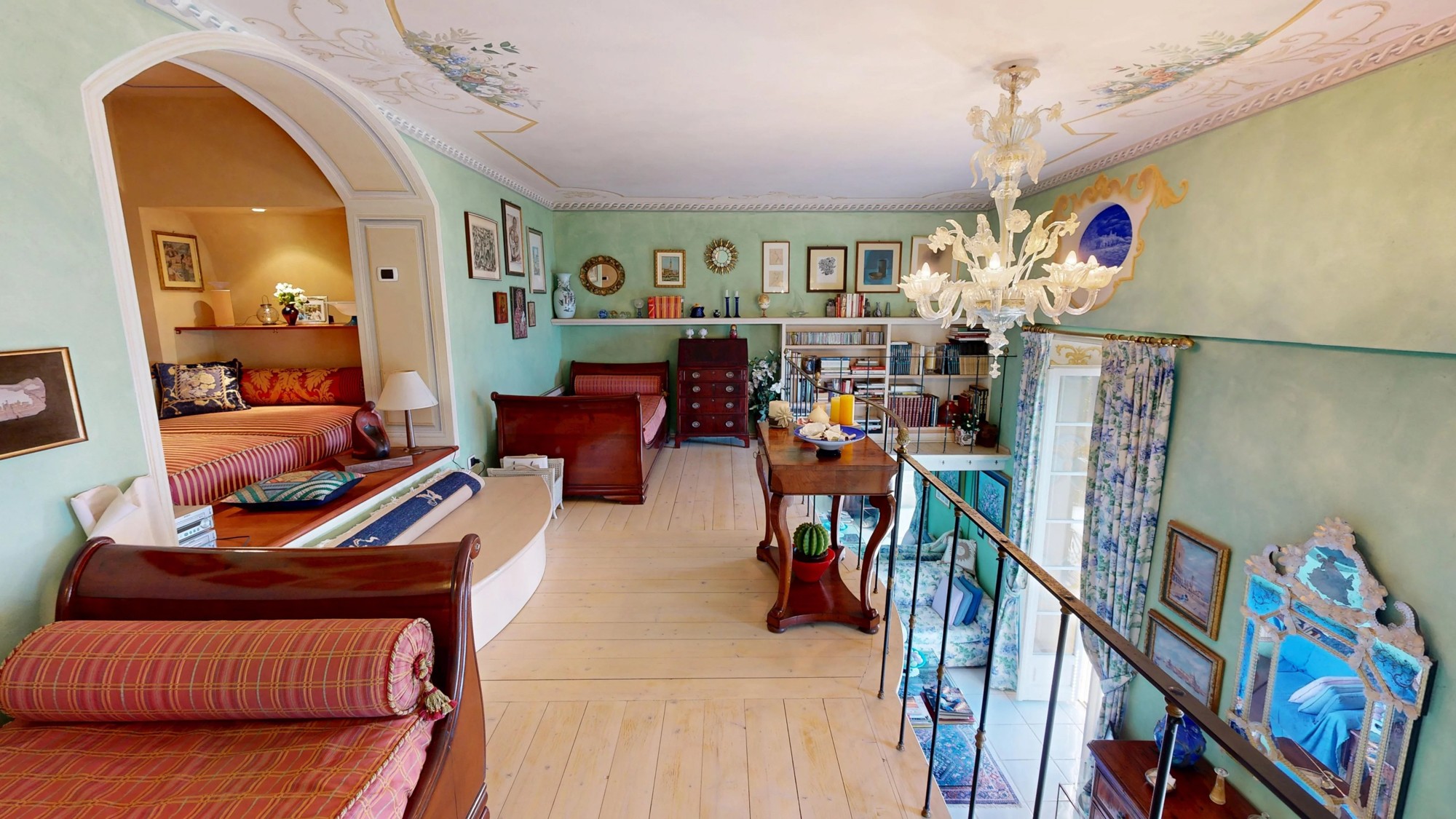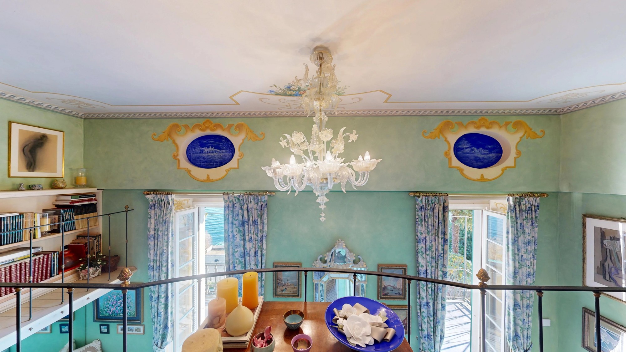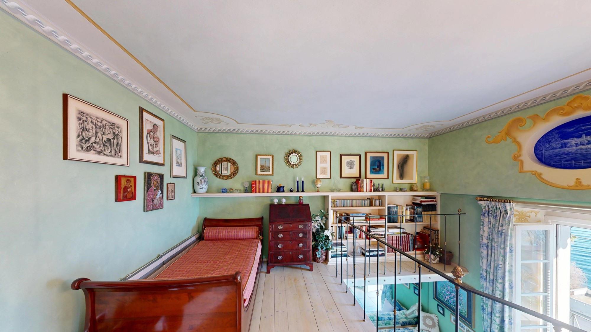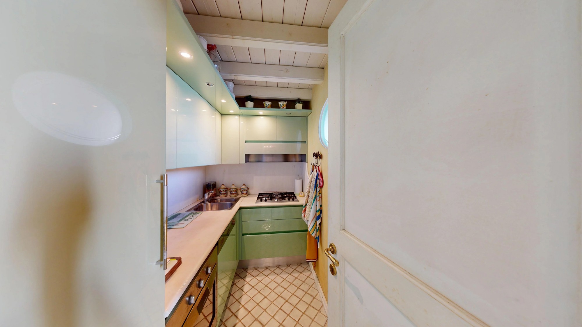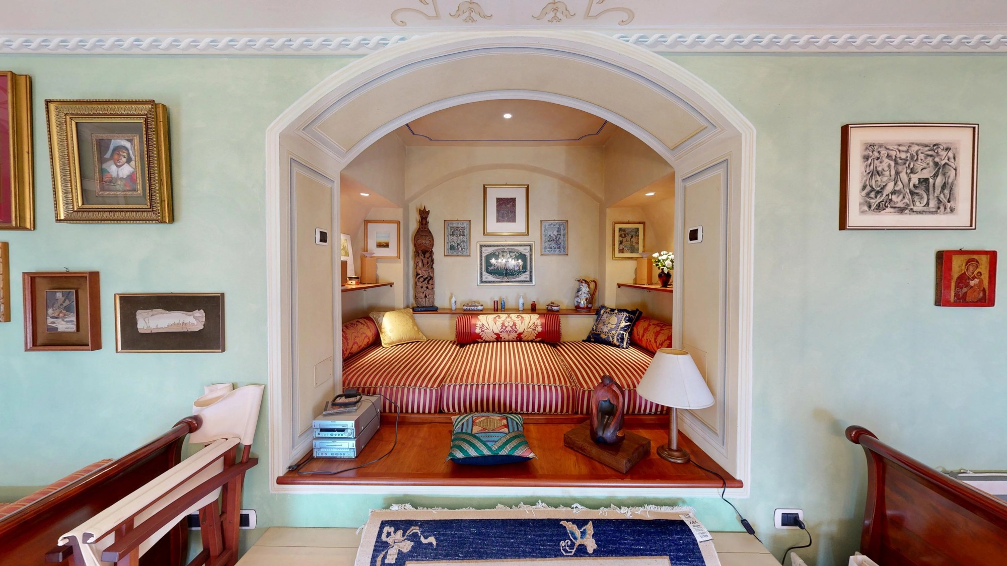 De woonruimte op de begane grond opent zich naar een groot terras met een prachtig uitzicht op het meer. Deze verdieping omvat ook een kitchenette en een badkamer met Vietri-tegels. Op de mezzanine bevindt zich de slaapruimte met een ingebouwd bed en een op maat gemaakte boekenkast. Pastelgekleurde fresco’s en Venetiaanse stucdecoraties kenmerken het interieur.