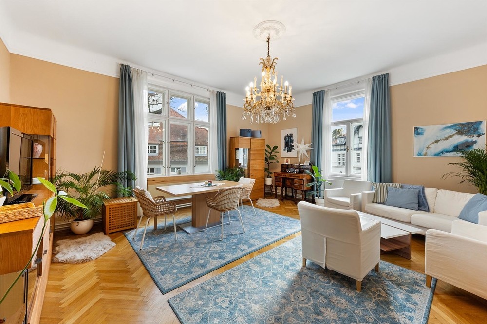 De verhoogde begane grond vormt de elegante entree van de villa. De hal weerspiegelt het historische karakter van het pand. Op ongeveer 118 m² woonoppervlakte biedt deze verdieping drie ruime kamers, een charmante keuken met directe toegang tot het terras en een salon met een elegante erker.