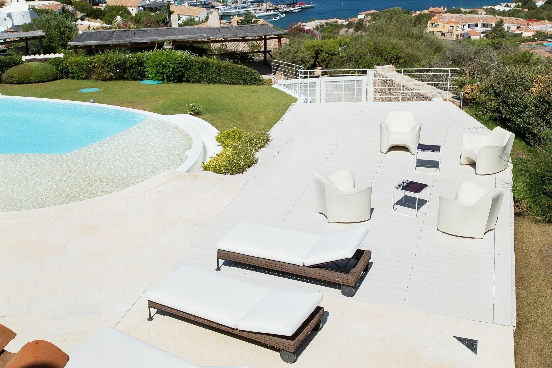 Die Lage über dem Yachthafen von Porto Cervo verbindet Nähe und Privatsphäre. Die Piazzetta ist in wenigen Minuten erreichbar, während die Villa selbst Ruhe und Abgeschiedenheit bietet. Für Bootsbesitzer ist die Logistik ideal: Tender und Tagesboot sind sofort verfügbar, anschließend können Sie auf der Terrasse entspannen oder ein Bad im Pool genießen.