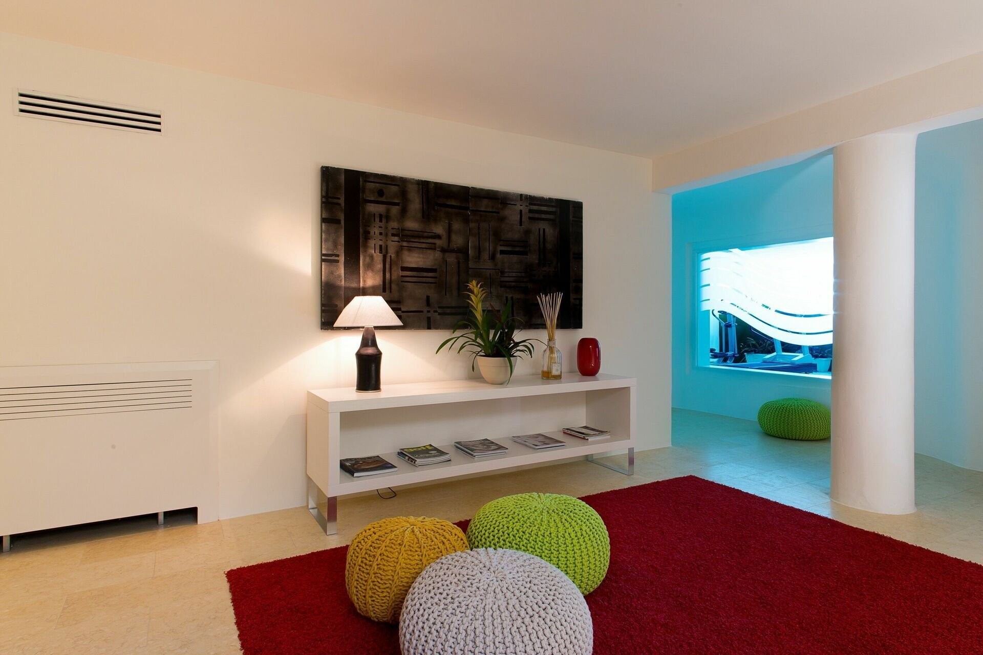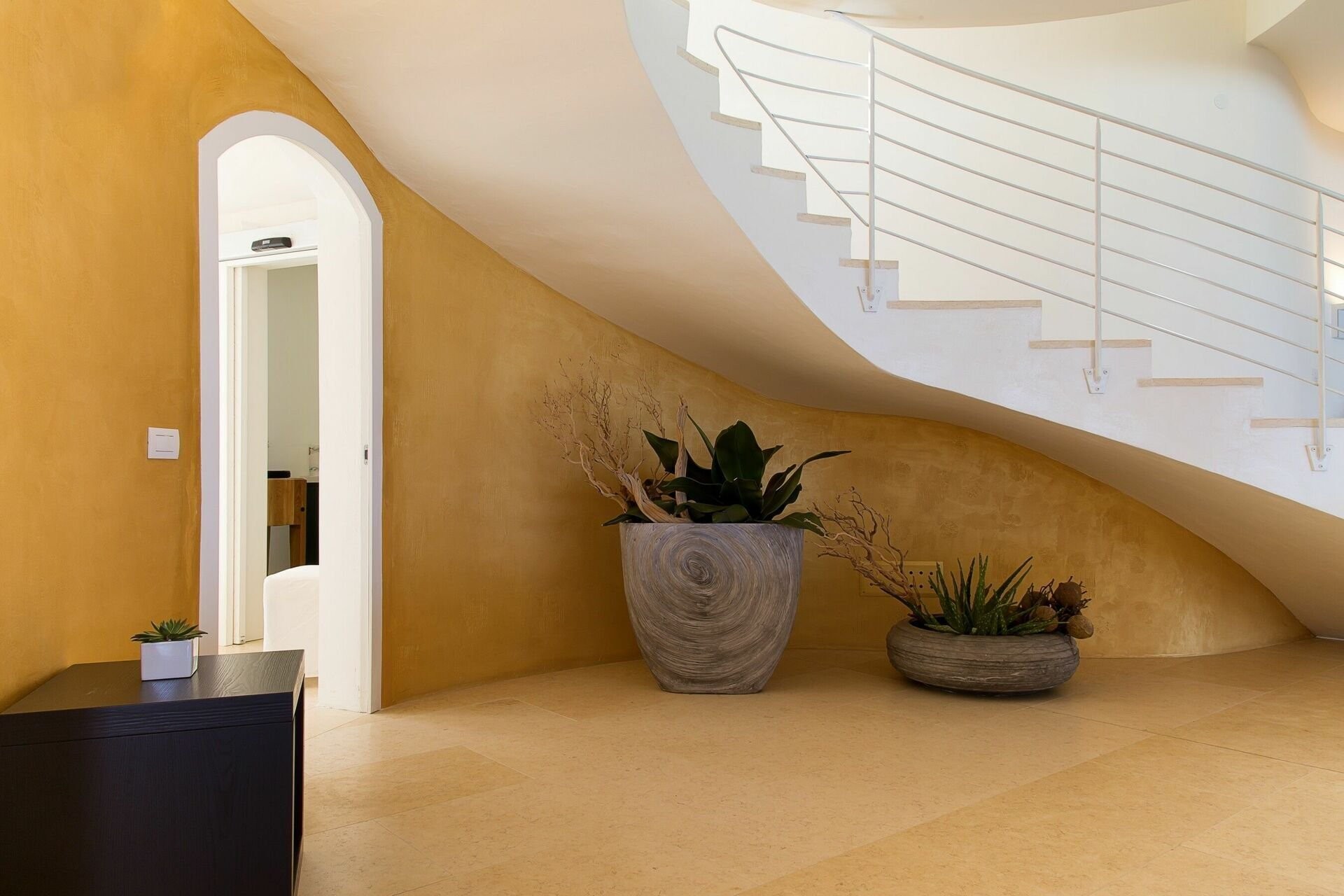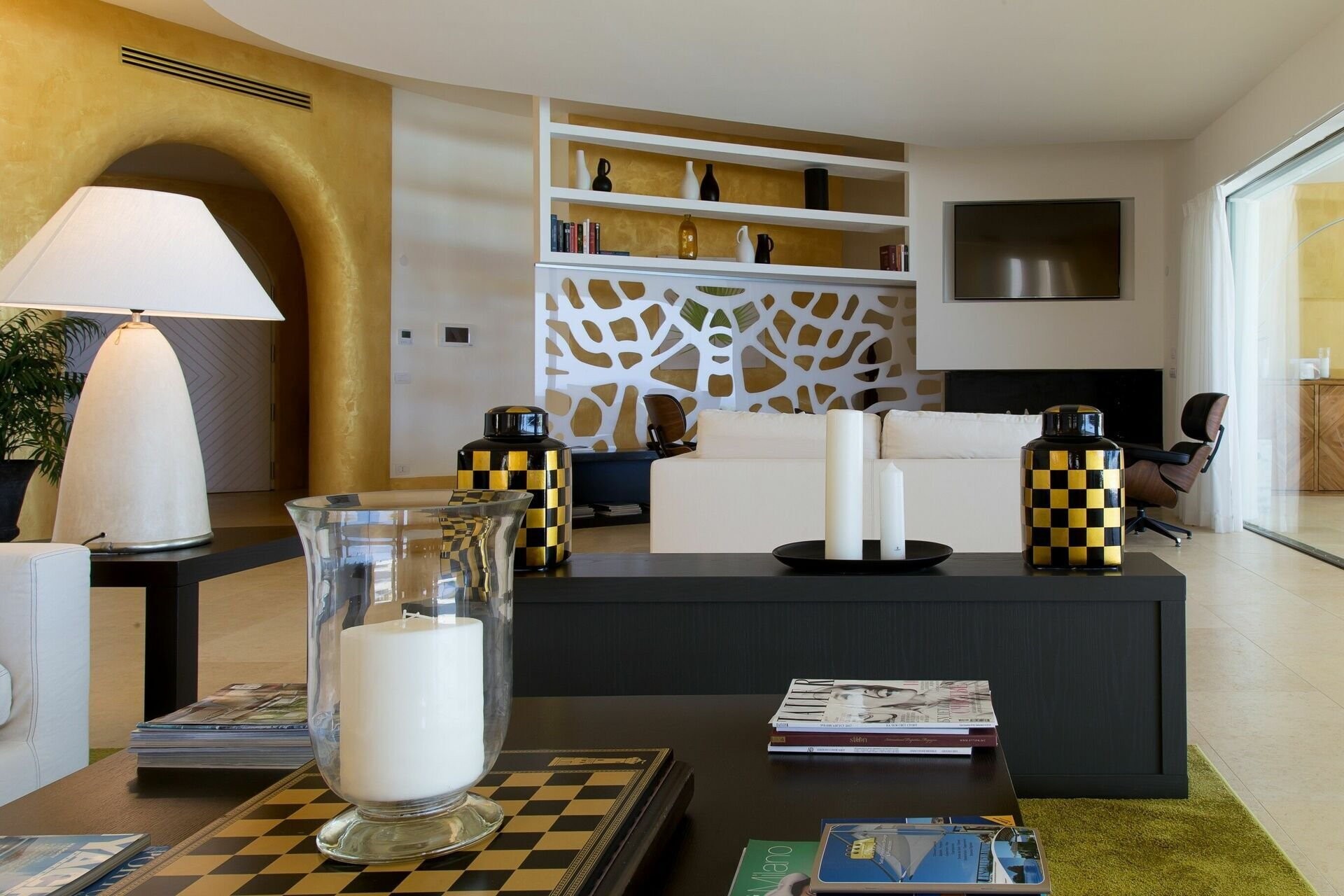 Die Architektur ist klar und minimalistisch, mit großzügigen Räumen und fließendem Übergang zwischen Innen- und Außenbereichen. Der zentrale Wohnbereich umfasst etwa 200 m² und öffnet sich zu einer überdachten Terrasse ähnlicher Größe. Von hier aus lassen sich die Bucht, die Yachten im Hafen und die nahegelegene Piazzetta mit Restaurants und Boutiquen überblicken.