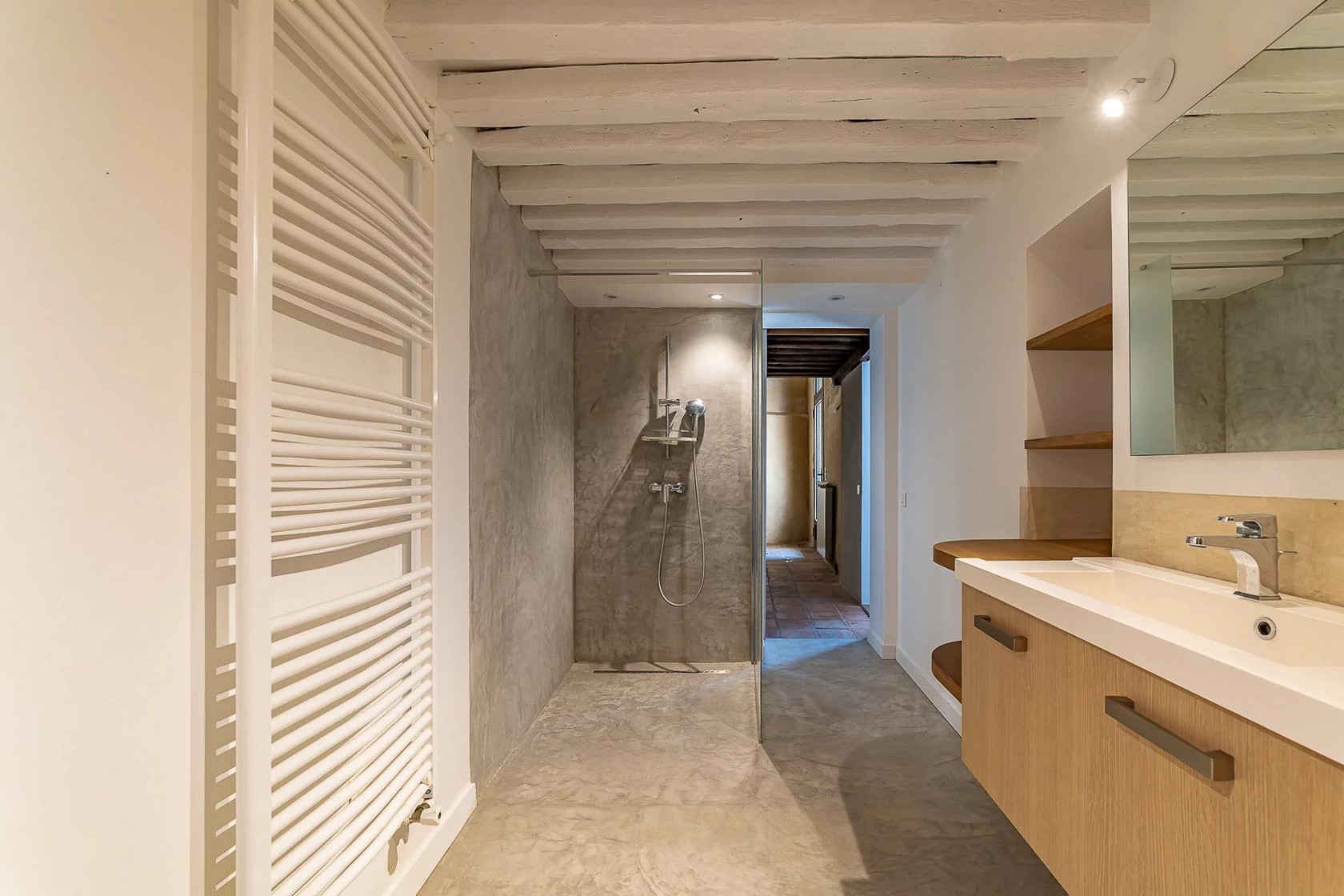 De hoofdslaapkamer kijkt uit op de tuin en beschikt over een kleedkamer en een eigen badkamer met douche. Twee extra slaapkamers maken deel uit van het appartement, waarvan één als duplex met eigen badkamer. De wasruimte maakt gebruik van een voormalige toegang vanaf een tweede straat.