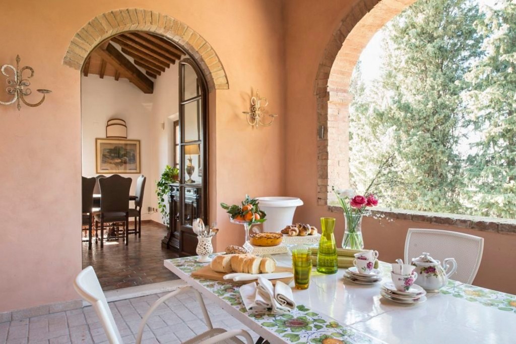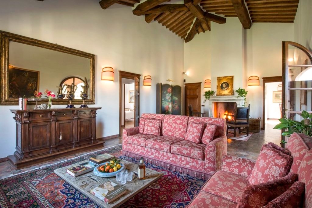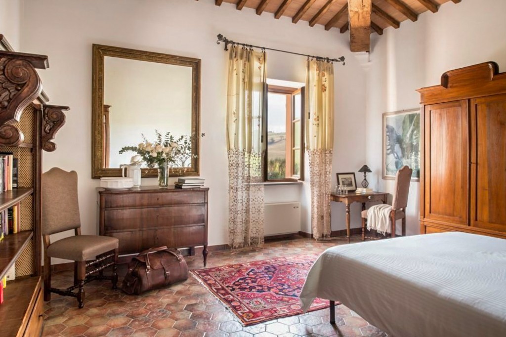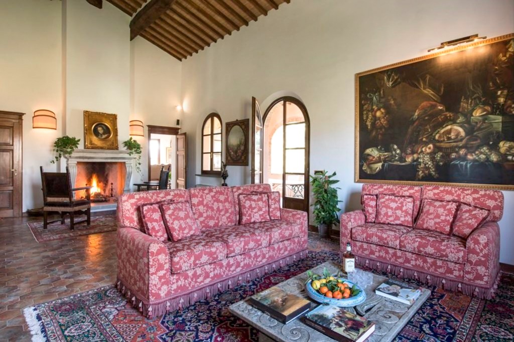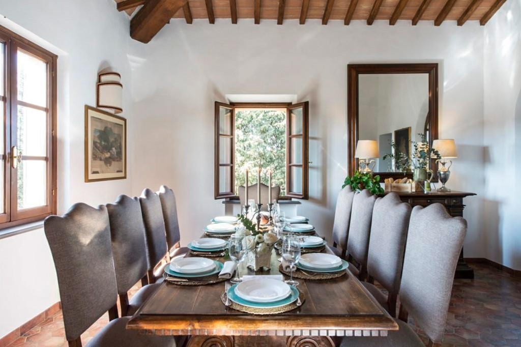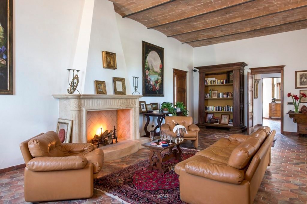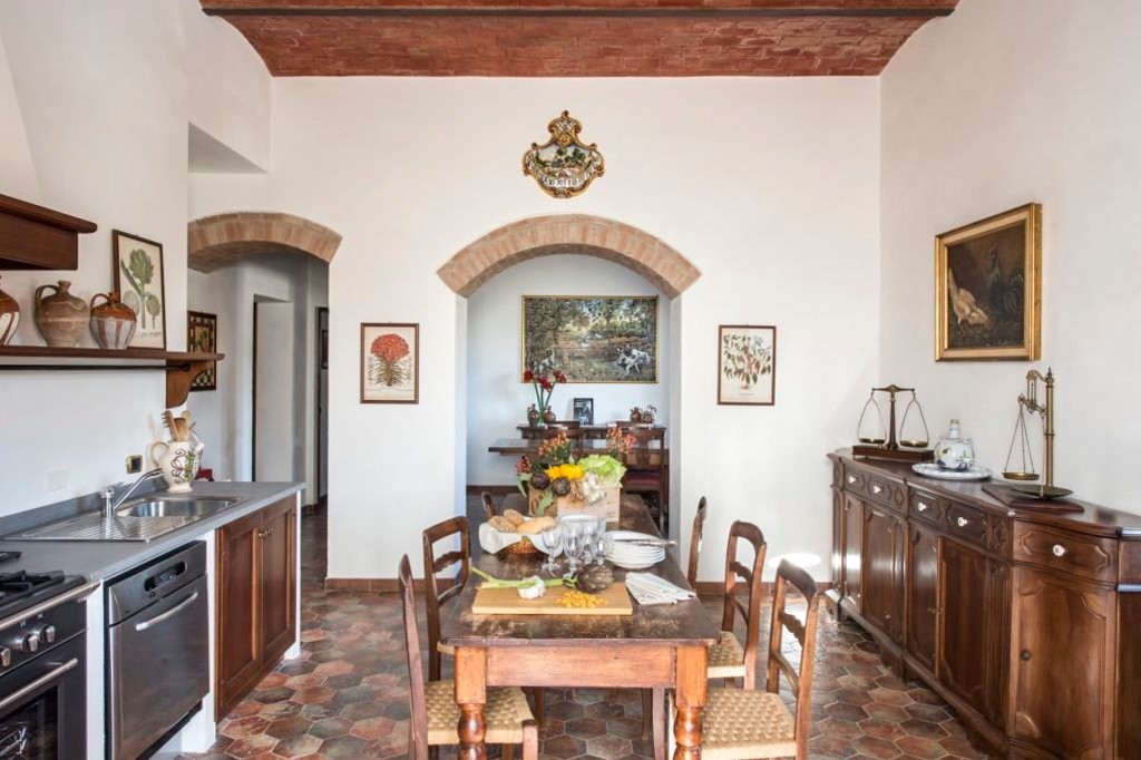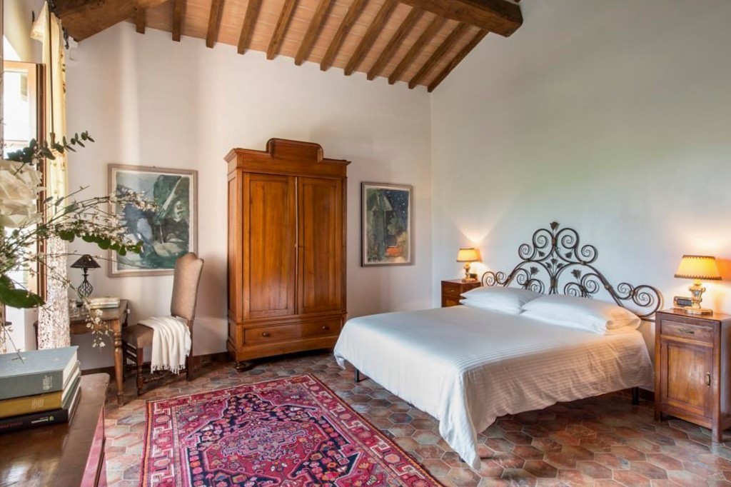 Een externe trap, kenmerkend voor Toscaanse plattelandsvilla’s, leidt naar de bovenverdieping. Hier bevinden zich een tweede woonkamer met antieke open haard, een tweede keuken met eetkamer en een ruim panoramisch terras. Drie extra slaapkamers, elk met een eigen badkamer, zijn met zorg en hoogwaardige materialen ingericht.