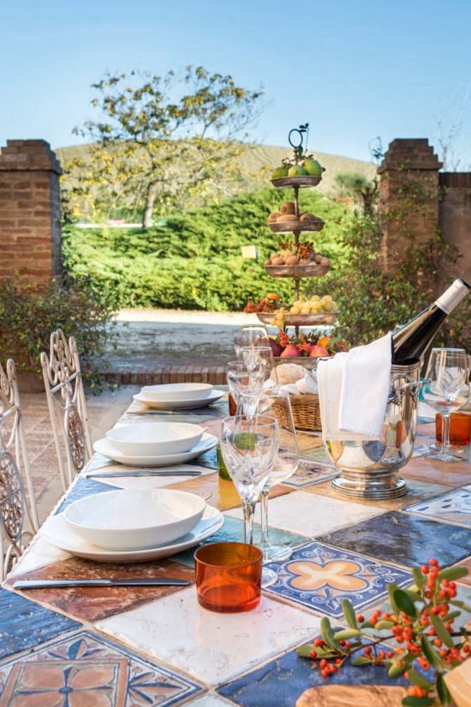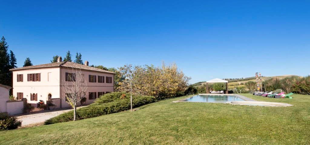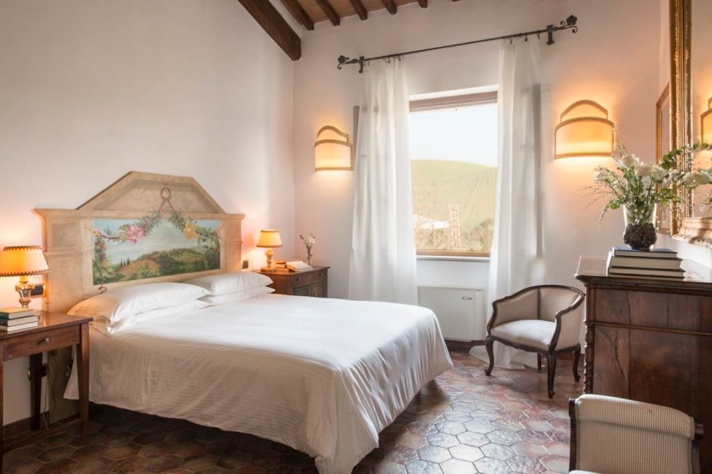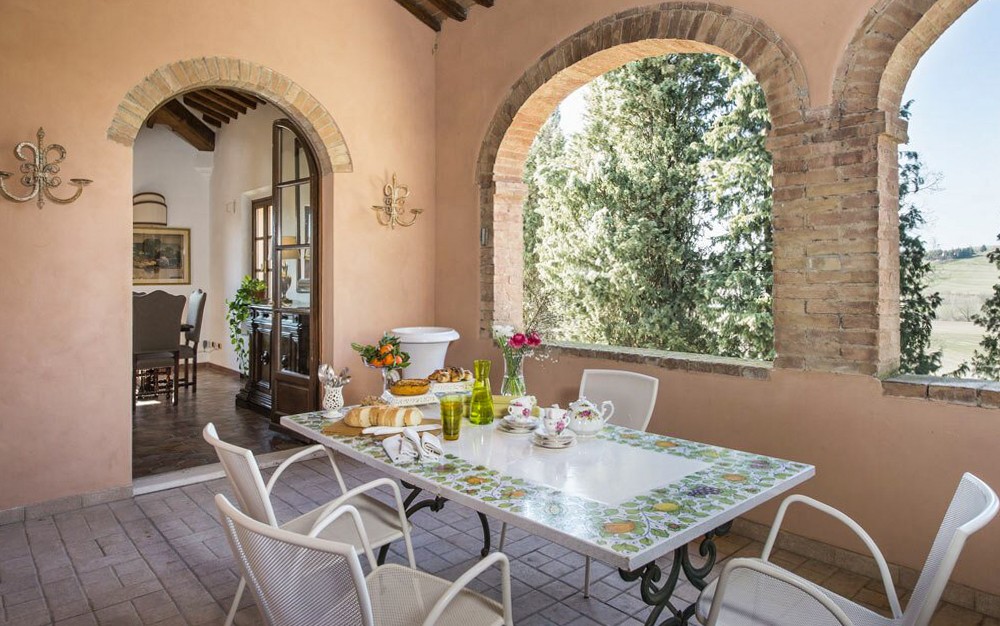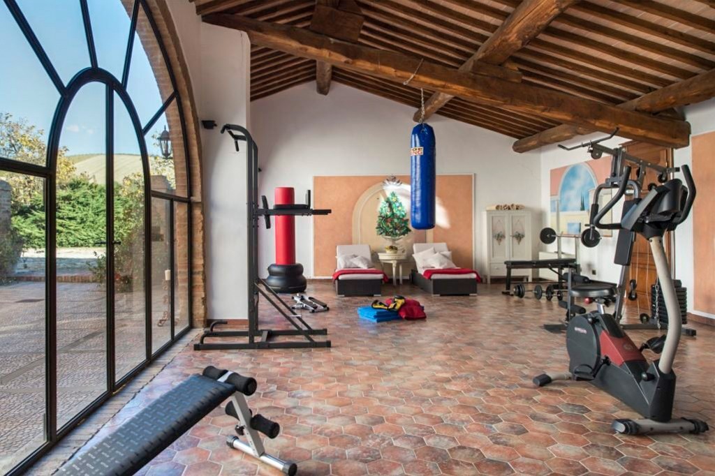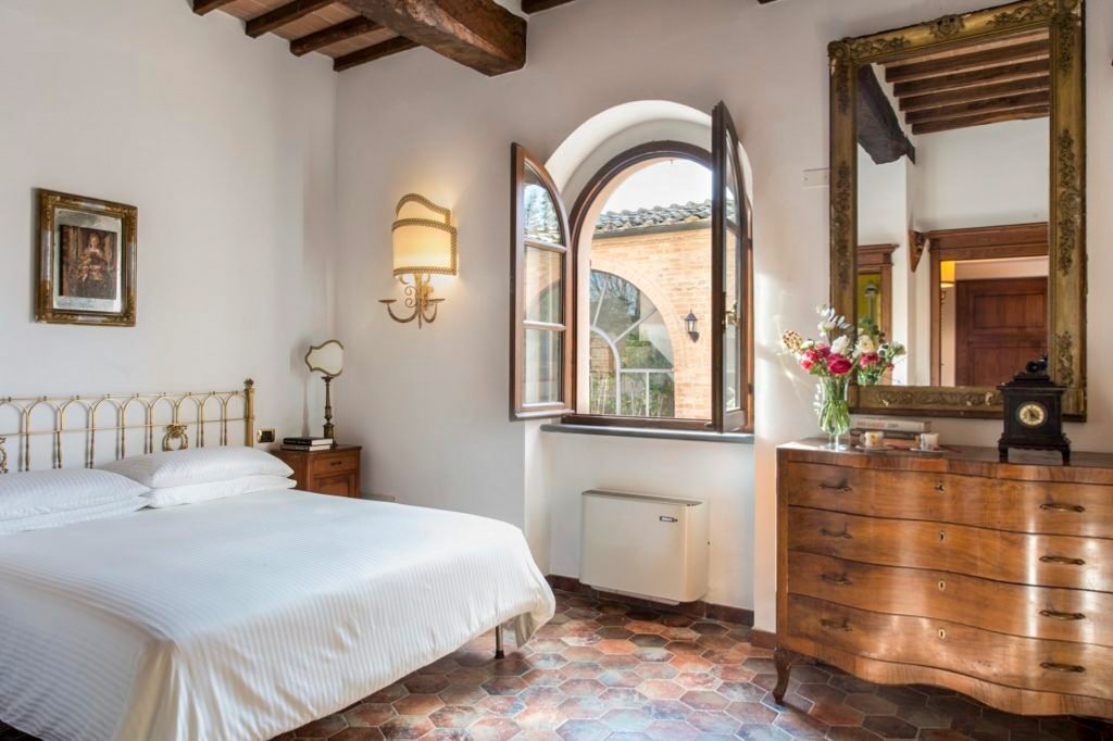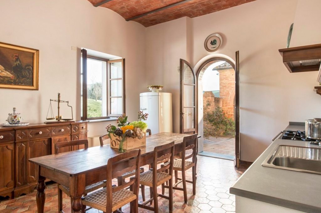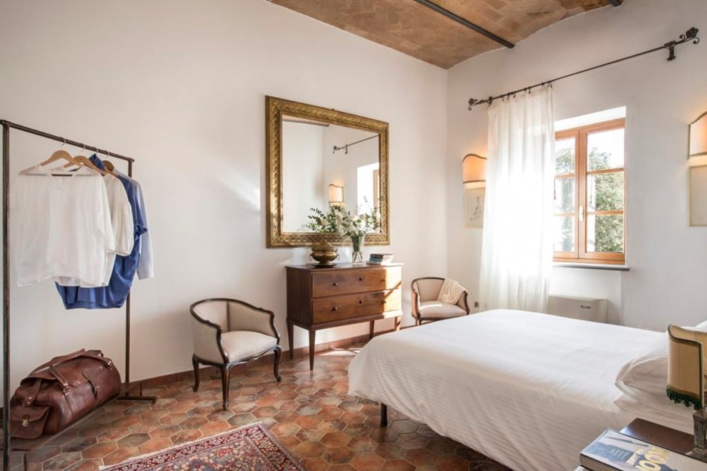 Een externe trap, kenmerkend voor Toscaanse plattelandsvilla’s, leidt naar de bovenverdieping. Hier bevinden zich een tweede woonkamer met antieke open haard, een tweede keuken met eetkamer en een ruim panoramisch terras. Drie extra slaapkamers, elk met een eigen badkamer, zijn met zorg en hoogwaardige materialen ingericht.