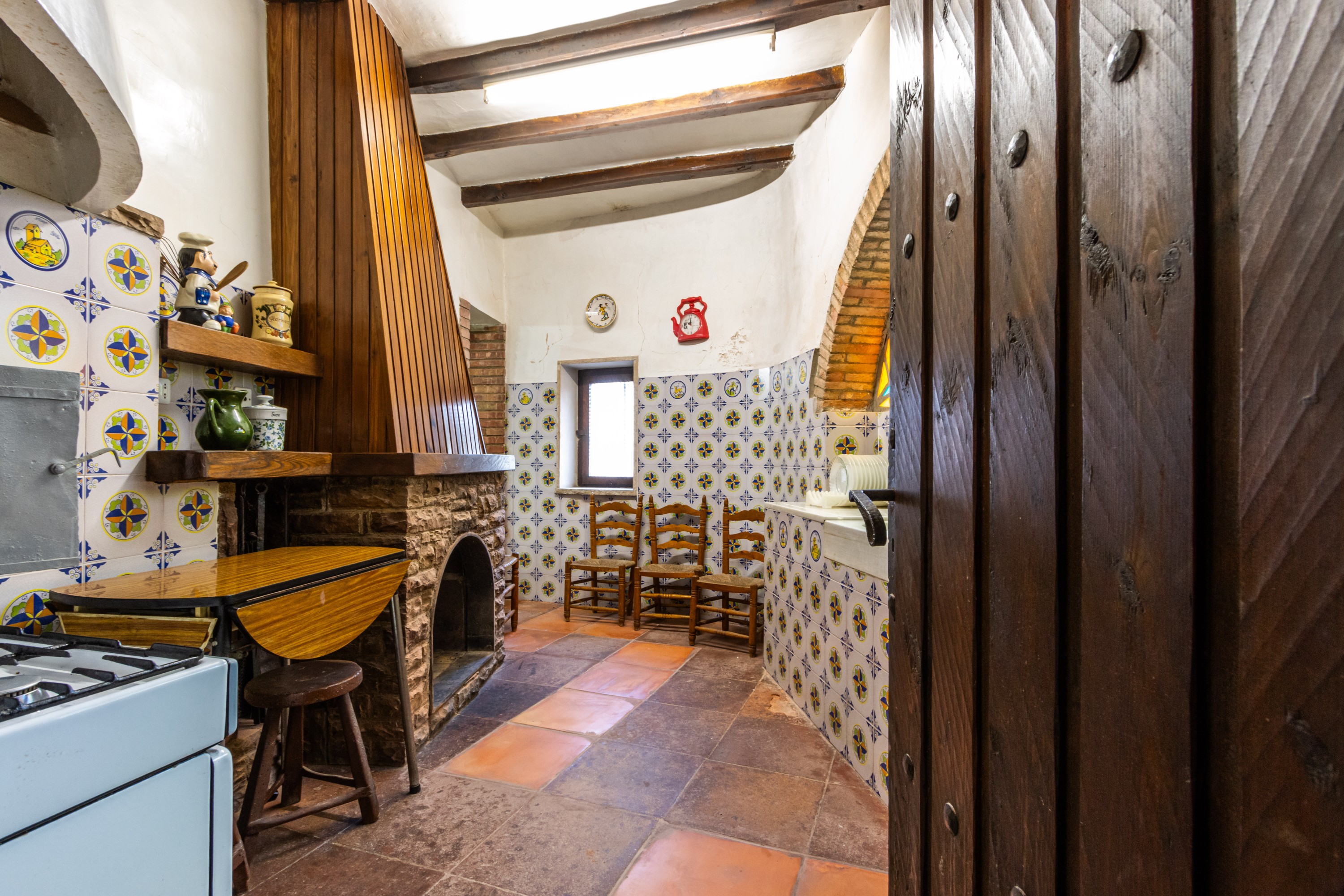 De begane grond wordt gekenmerkt door een woon- en eetkamer van 32,5 m², ideaal voor familiebijeenkomsten en gezellige momenten. De keuken van 10,10 m² is uitgerust met een open haard en een traditionele houtoven, geschikt voor koken volgens authentieke methoden. Een badkamer met douche (3,80 m²) maakt deze verdieping compleet.