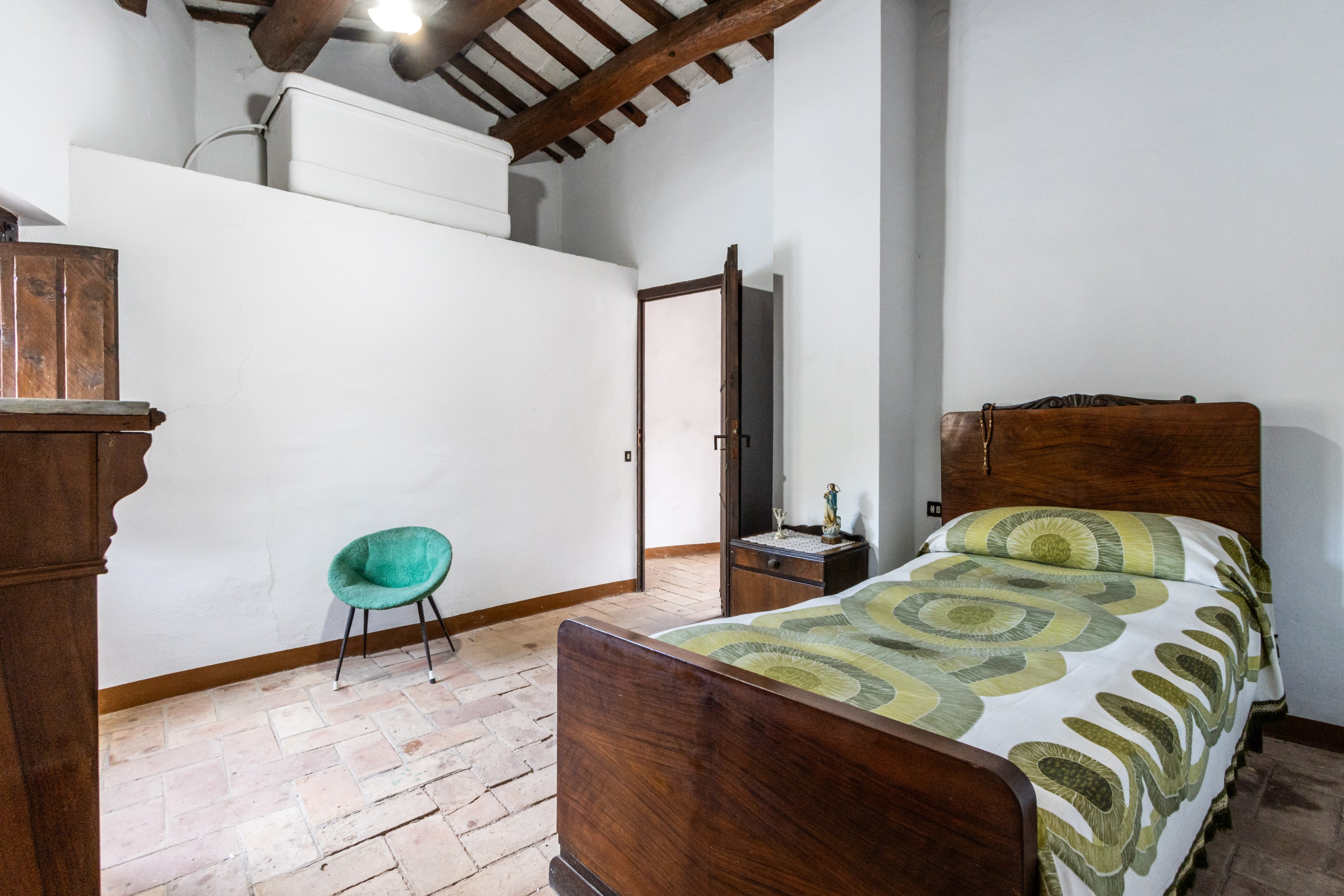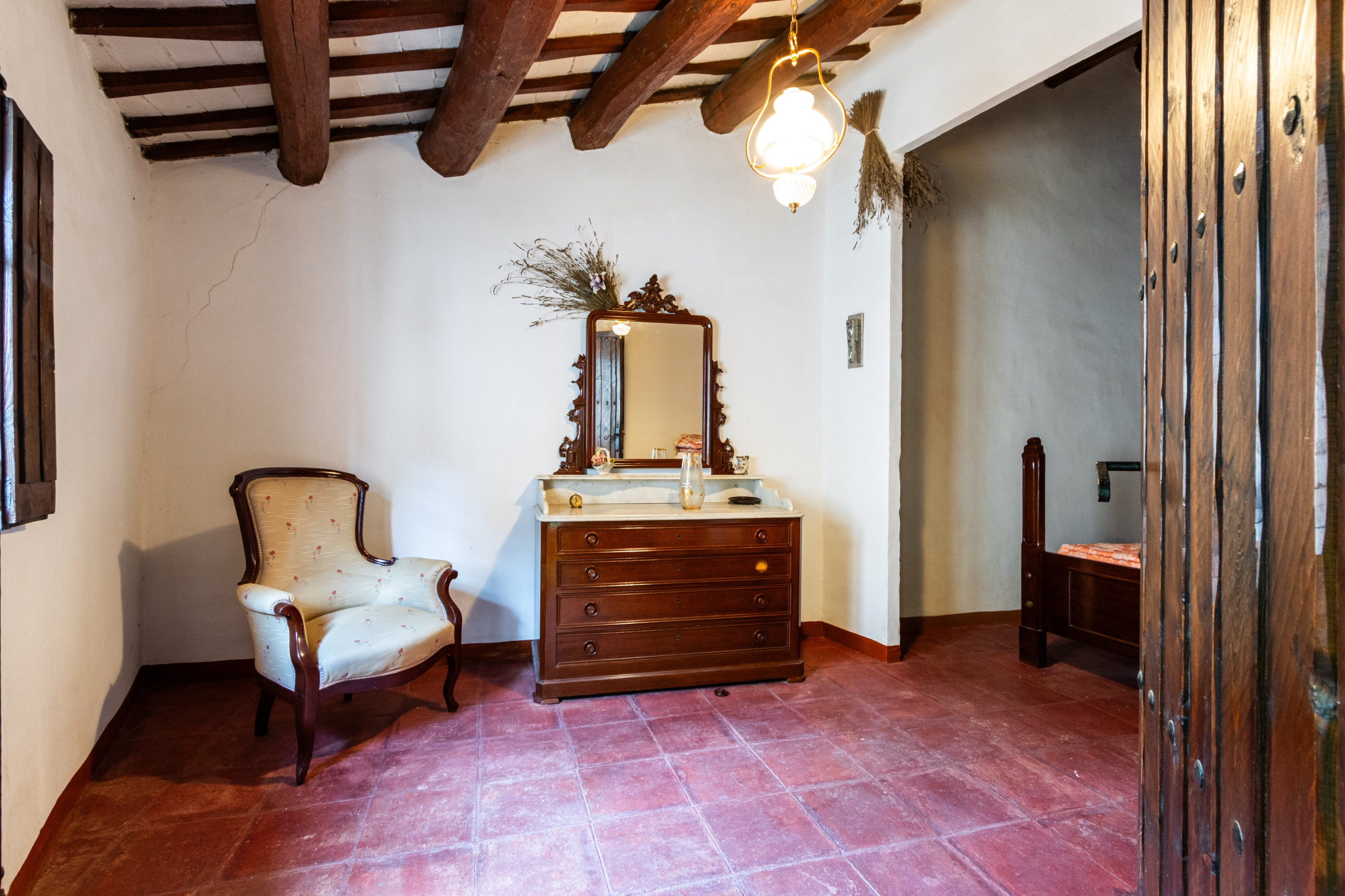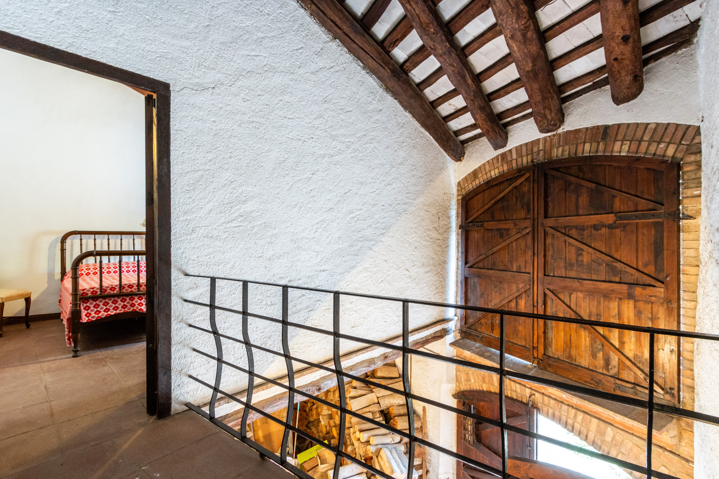 Een zorgvuldig behouden trap in massief eikenhout leidt naar de bovenverdieping, waar zich vier ruime tweepersoonsslaapkamers bevinden. De kamers zijn licht en bieden vrij uitzicht op de omliggende natuur.