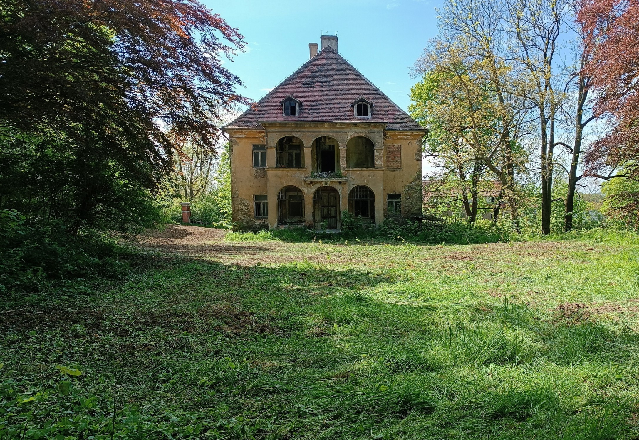 Het barokke landhuis, gebouwd in 1757 – het jaartal staat boven de poort – is een twee verdiepingen tellend gebouw met kelder, op een rechthoekige plattegrond, met een hoog zadeldak en dakkapellen. Aan de oostzijde vervolledigt een arcade-uitbouw met drie bogen op pijlers een loggia. Binnen bevindt zich een entreehal met een historische trap en vertrekken met vijf raamassen per zijgevel. De voorgevel, gericht op het noorden, opent naar een rechthoekige binnenplaats.