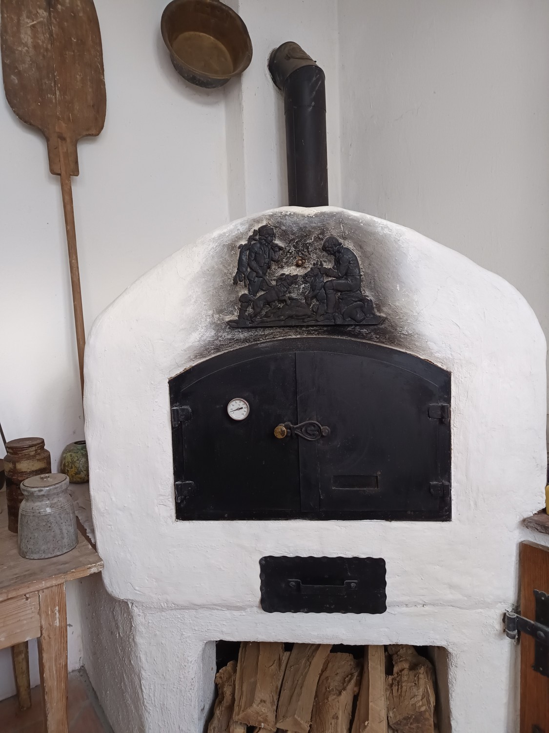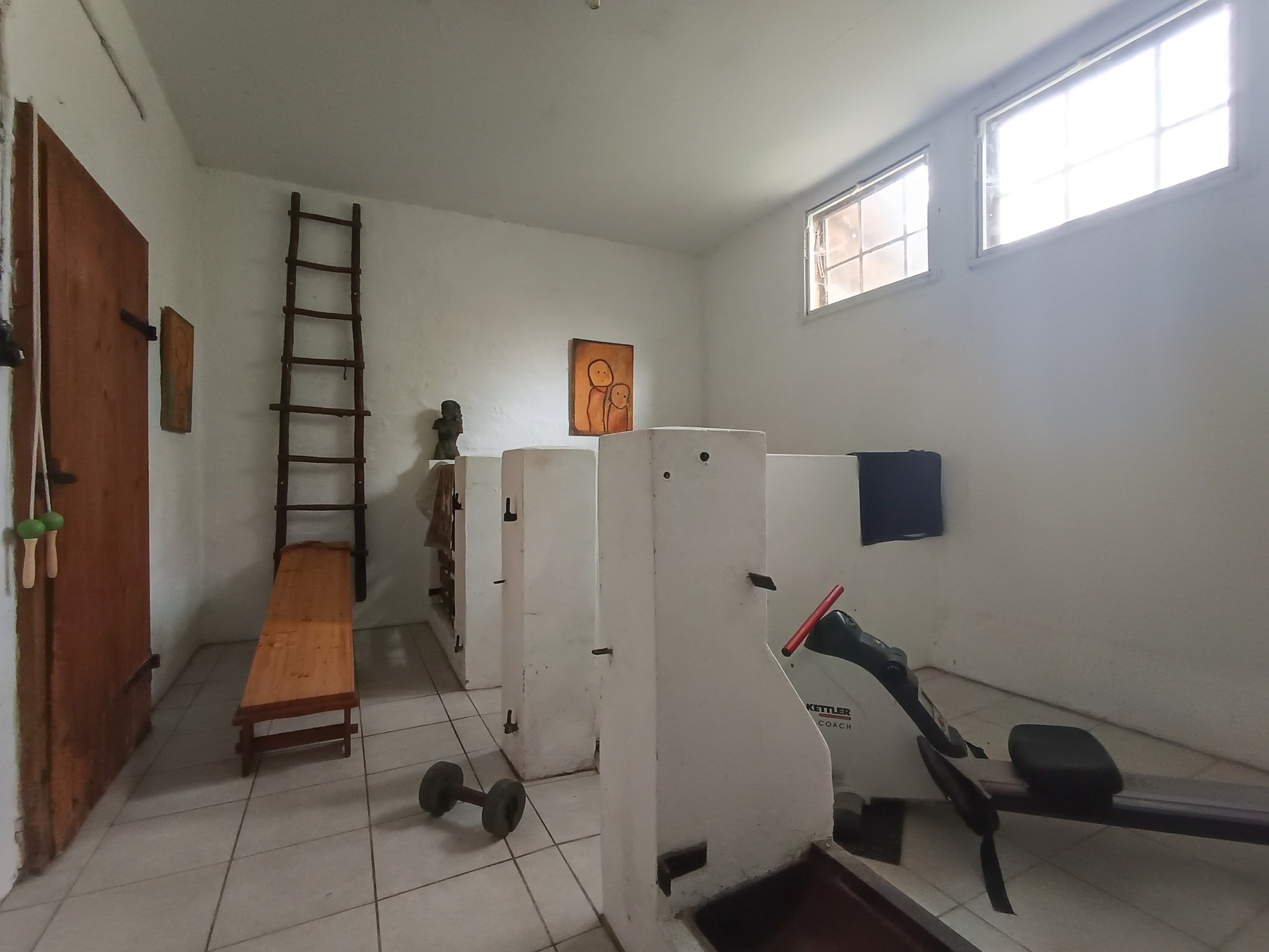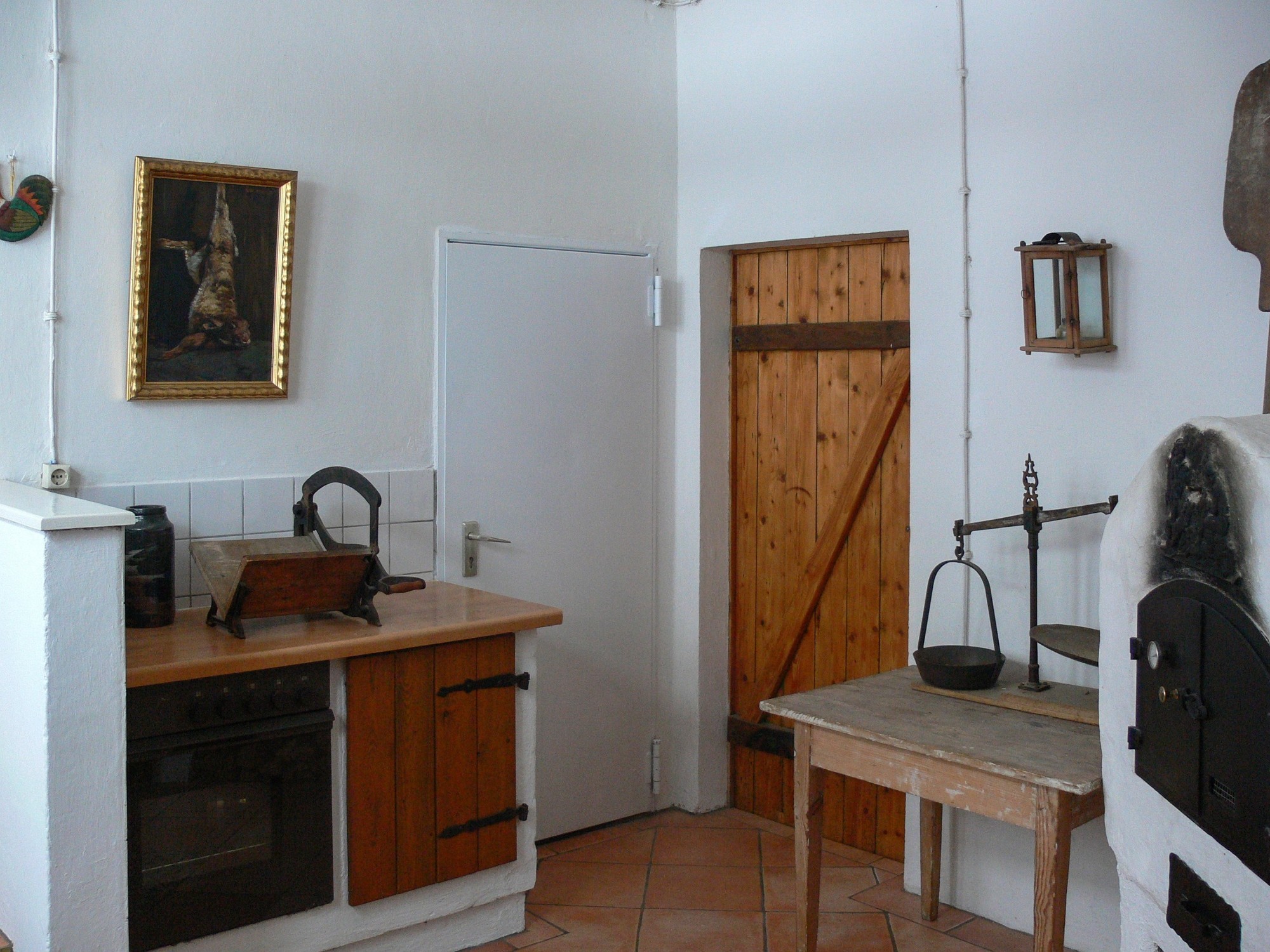 Het bedrijfsgedeelte van het gebouw omvat een werkkeuken met een gemetselde broodoven, een voormalige varkensstal die tegenwoordig als fitnessruimte wordt gebruikt en een garage.