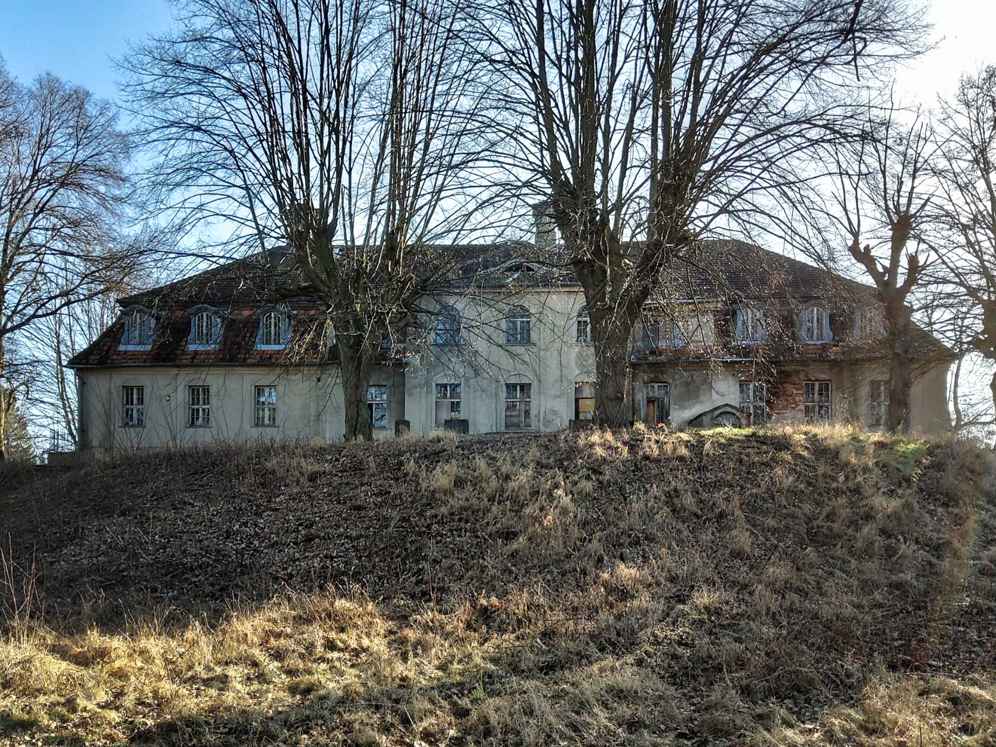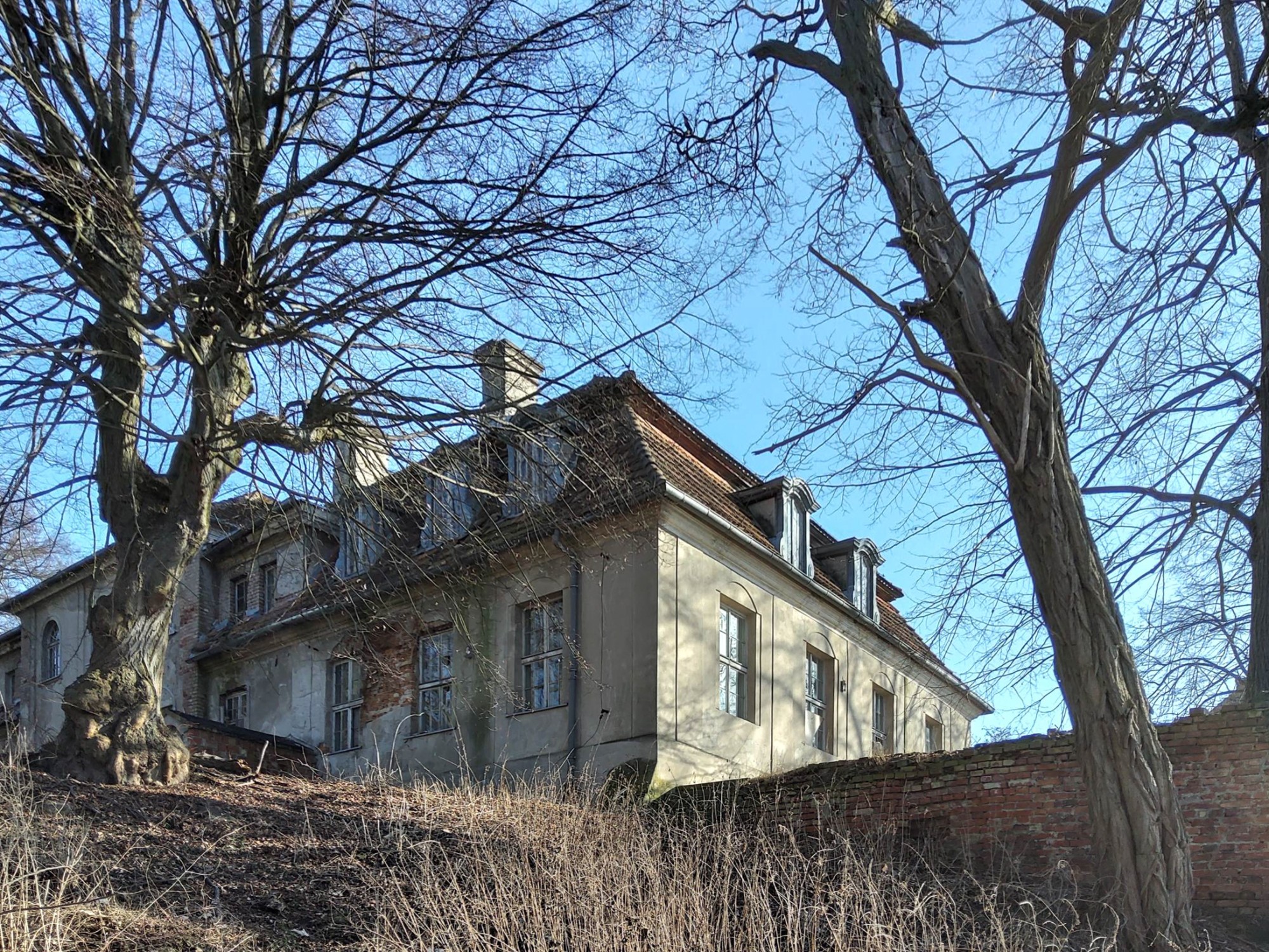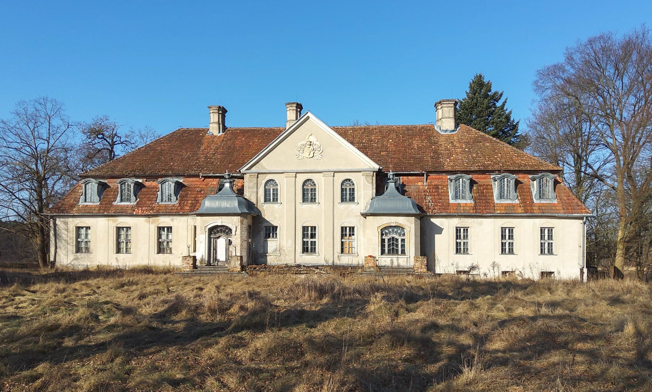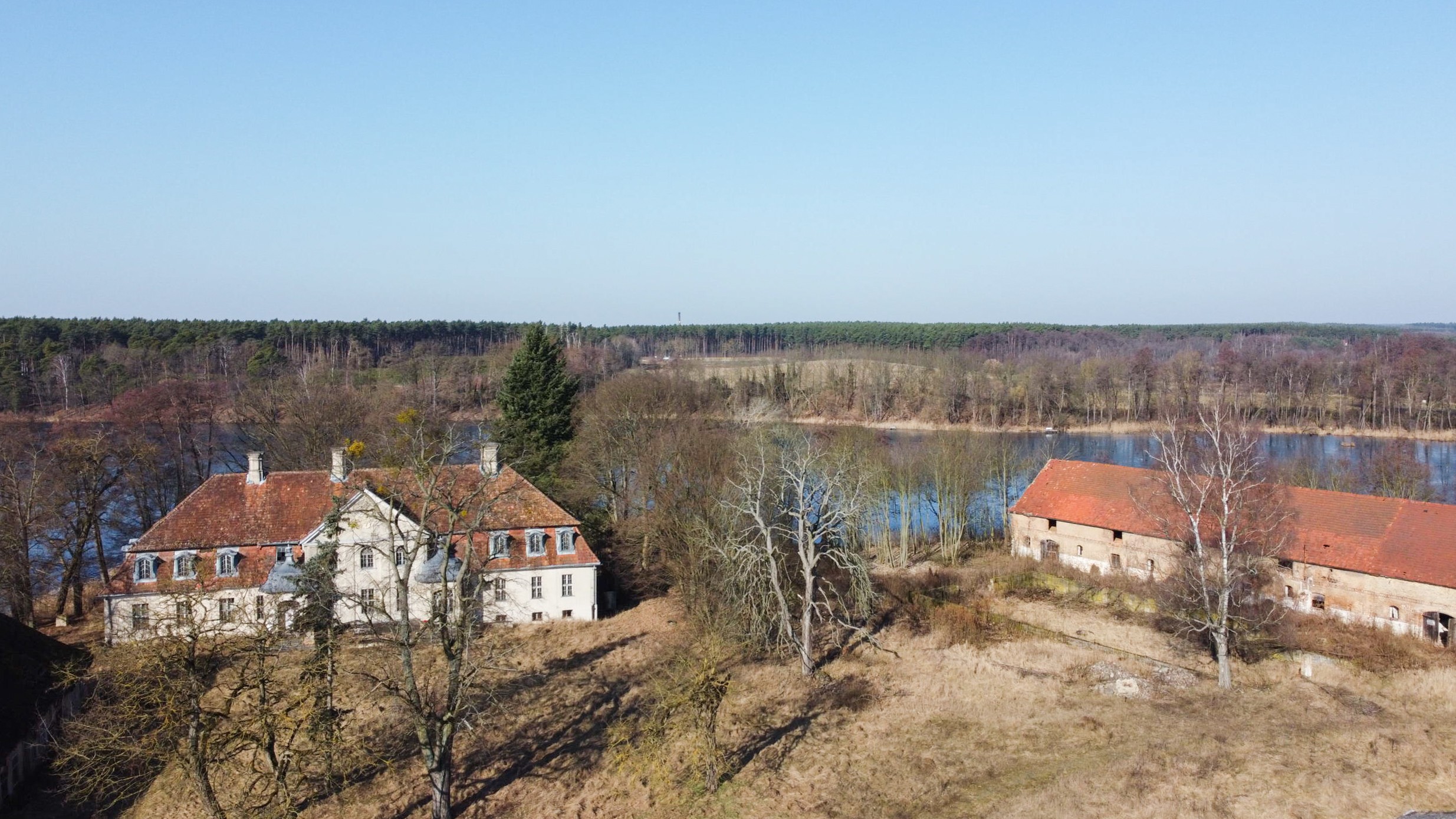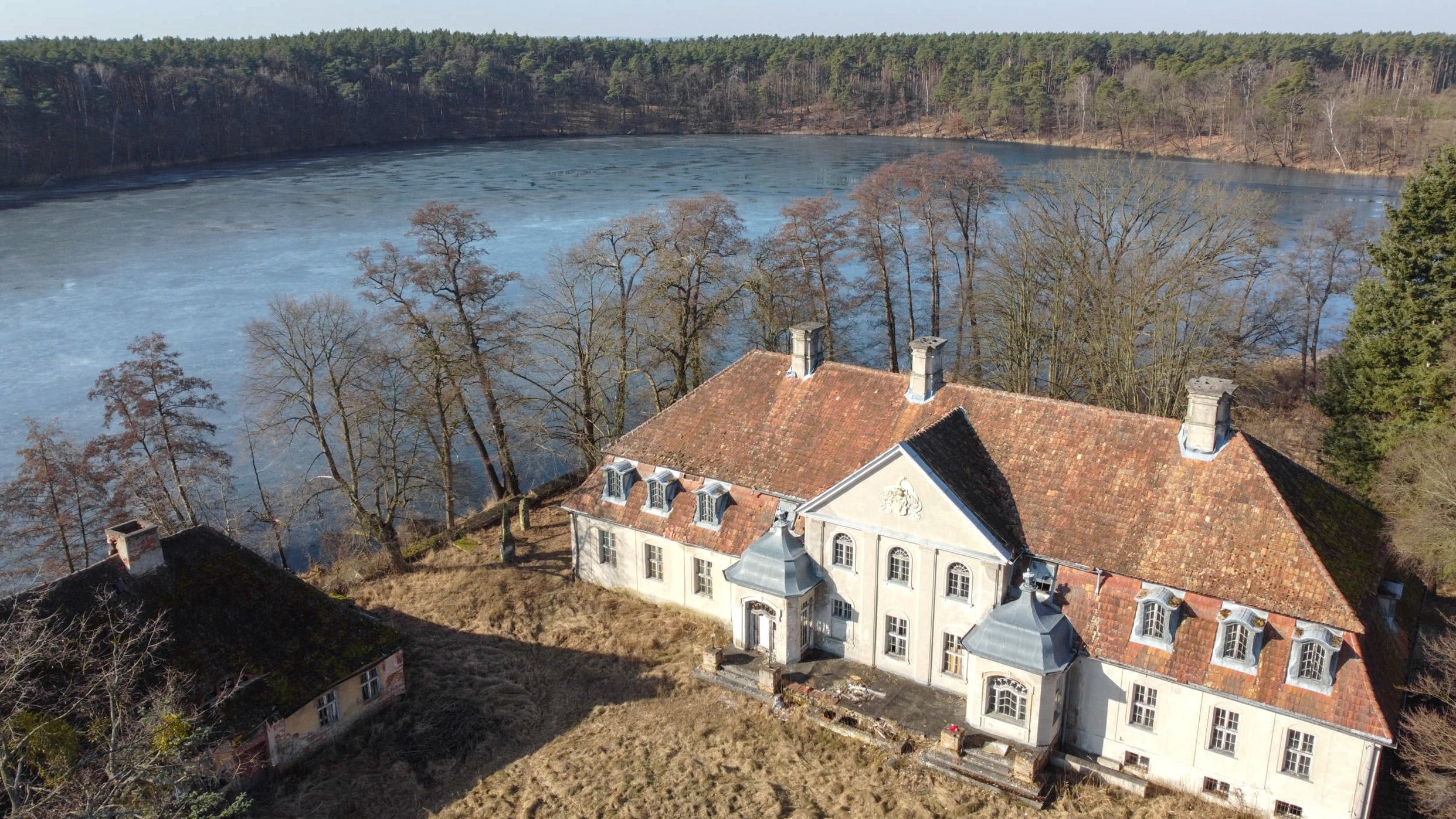 Dit historische landgoed ligt op een privé-eiland van ongeveer 30.000 m² in de provincie Lubusz, direct aan een meer en omgeven door een historisch park met eeuwenoude eiken en beuken. De oorsprong gaat terug tot de 13e eeuw, waarbij verschillende bouwperiodes zichtbaar zijn, waaronder gotische gewelven en een barok portaal. In de jaren 1980 zijn plafonds en trappen vernieuwd in beton. Sindsdien verkeren de interieurs in ruwbouwstaat en zijn volledig te renoveren.