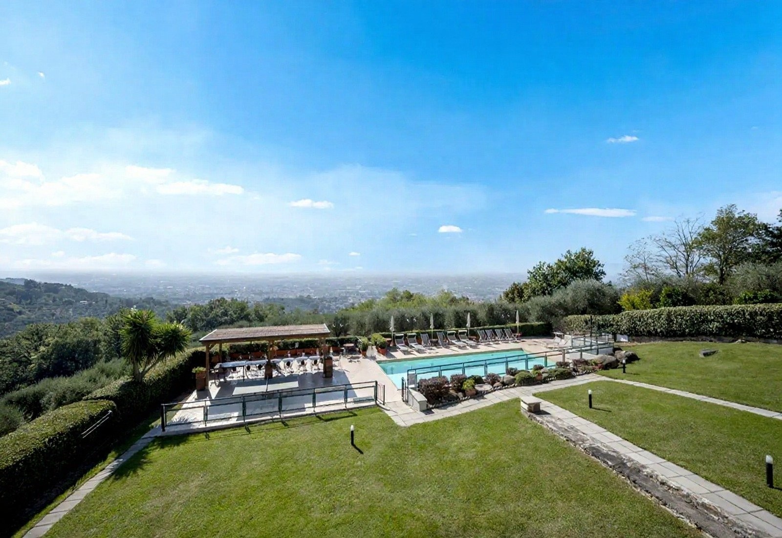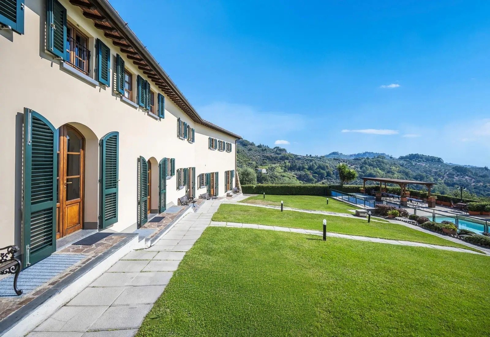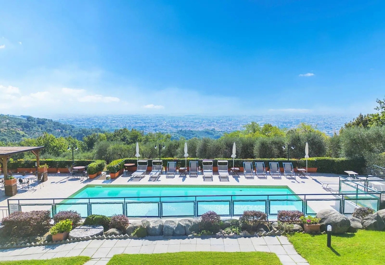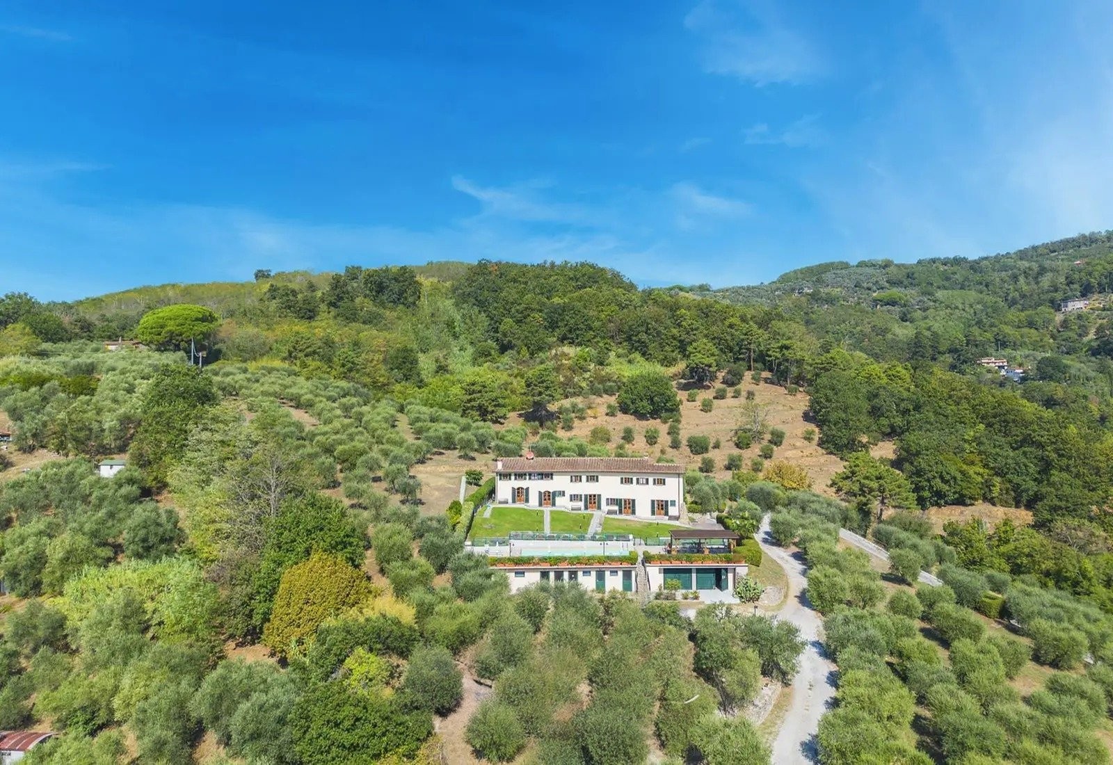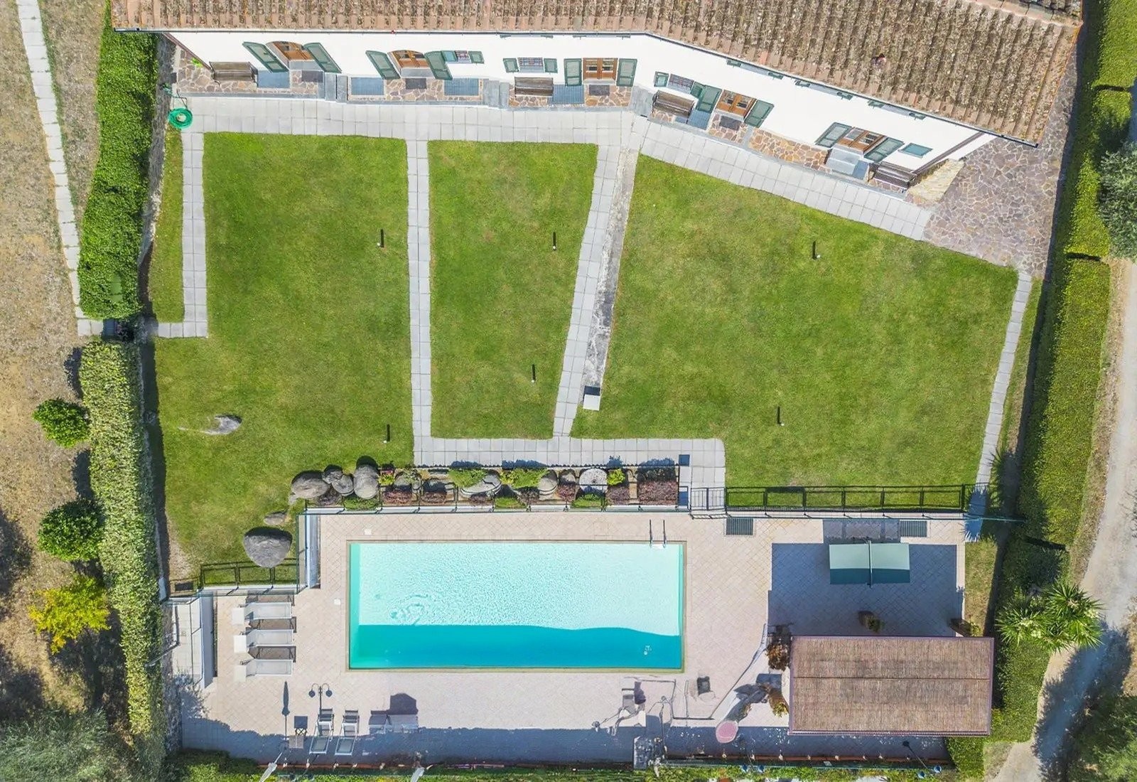 Het terrein behoudt een functioneel agrarisch karakter en biedt tegelijkertijd recreatieve en sportfaciliteiten. Het zwembad meet 5,5 × 12 meter en heeft een solariumterras met uitzicht over de vallei en Montecatini Terme. Daarnaast zijn er sportvelden voor volleybal, voetbal, basketbal en badminton, een overdekt paviljoen met barbecue en een vuurplaats. De indeling maakt het mogelijk dat de recreatieve voorzieningen onafhankelijk van de woonruimtes functioneren, met optimale natuurlijke ventilatie en panoramisch uitzicht dankzij de ligging en hoogte van het terrein.