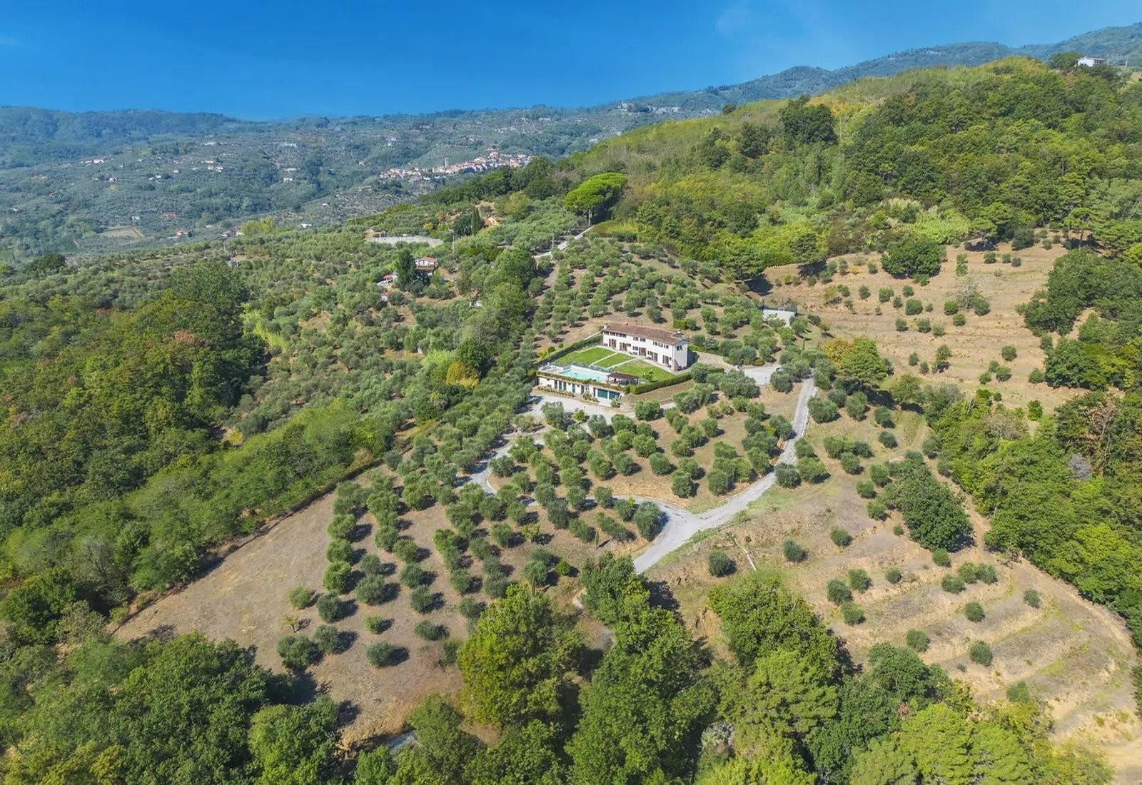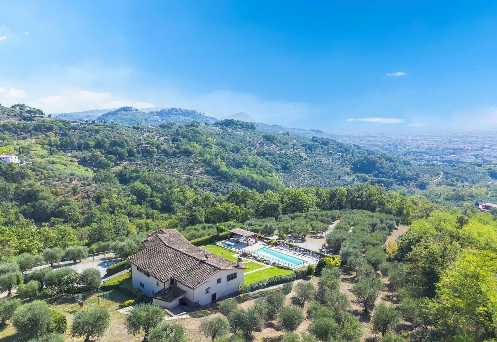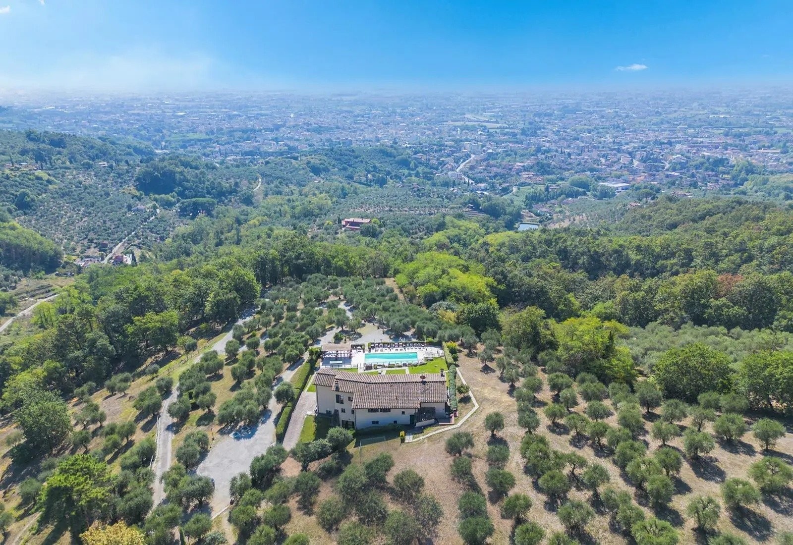 Montecatini Terme ligt aan de voet van het landgoed en staat bekend om zijn thermale baden uit de Belle Époque en art-nouveau architectuur. De stad biedt lokale voorzieningen en treinverbindingen. Florence ligt op 50 km, Lucca op 35 km, Pistoia op 15 km en Pisa op 60 km. De luchthaven van Florence (Peretola) ligt op 55 km en de internationale luchthaven van Pisa op 65 km. De villa combineert privacy, dankzij het privétoegang en de topografie, met gemakkelijke aansluiting op het netwerk van Toscaanse heuveldorpen.