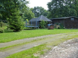 twee bijgebouwen, waaronder een voormalige garage en een kleiner gebouw met barbecueplaats.