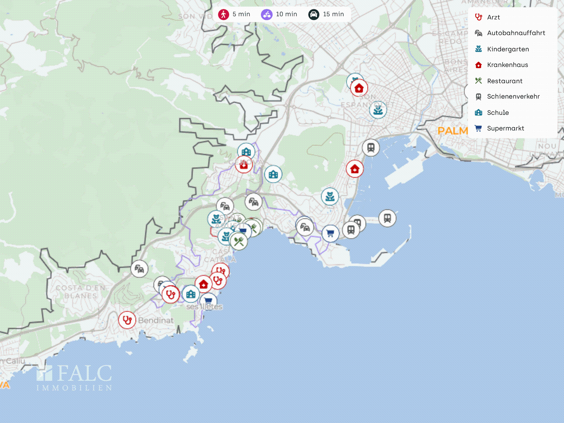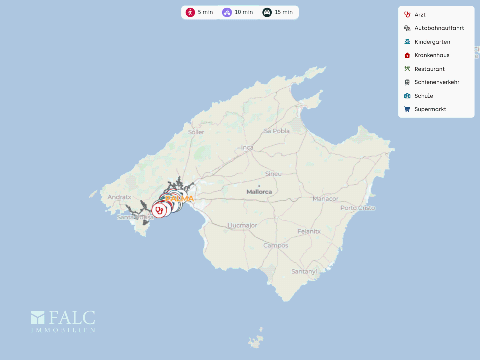 Medische voorzieningen zijn in de omgeving aanwezig. Klinieken zoals Clínica Juaneda en Clínica Rotger zijn met de auto bereikbaar.