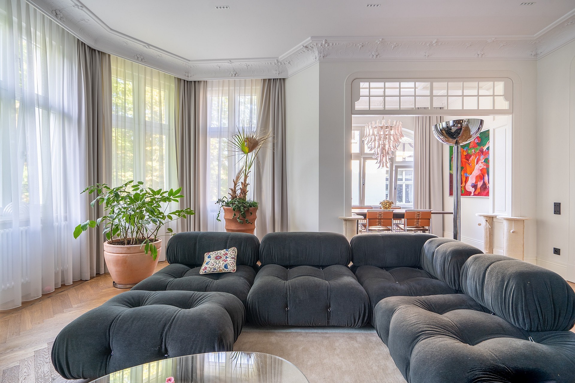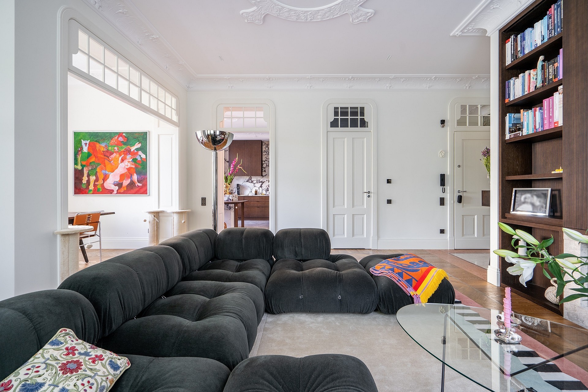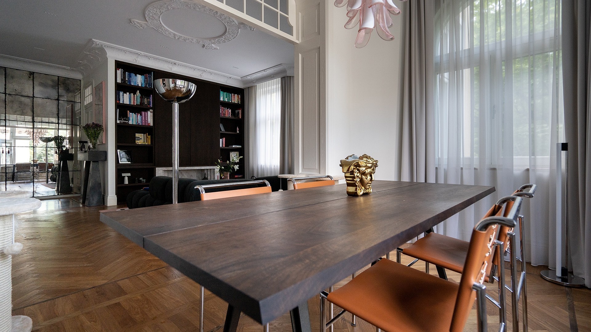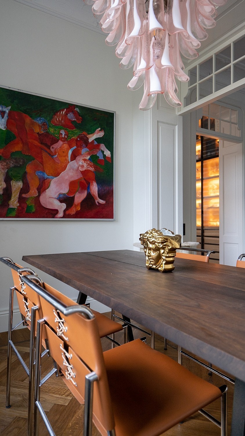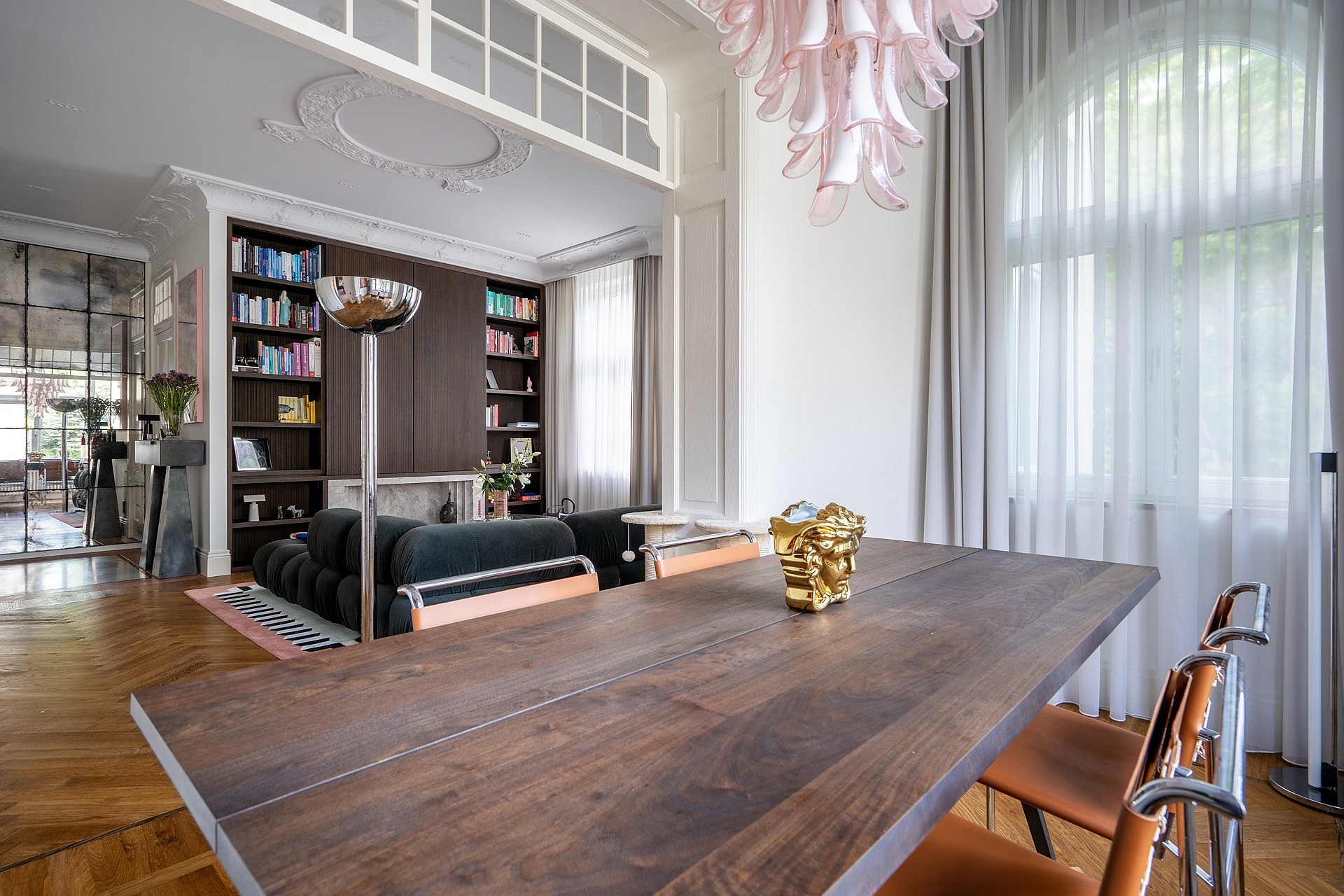Originele eikenhouten visgraatparket, sierlijsten aan muren en plafonds, op maat gemaakte meubels. Plafondhoogte meer dan drie meter. Grote ramen zorgen voor veel daglicht.