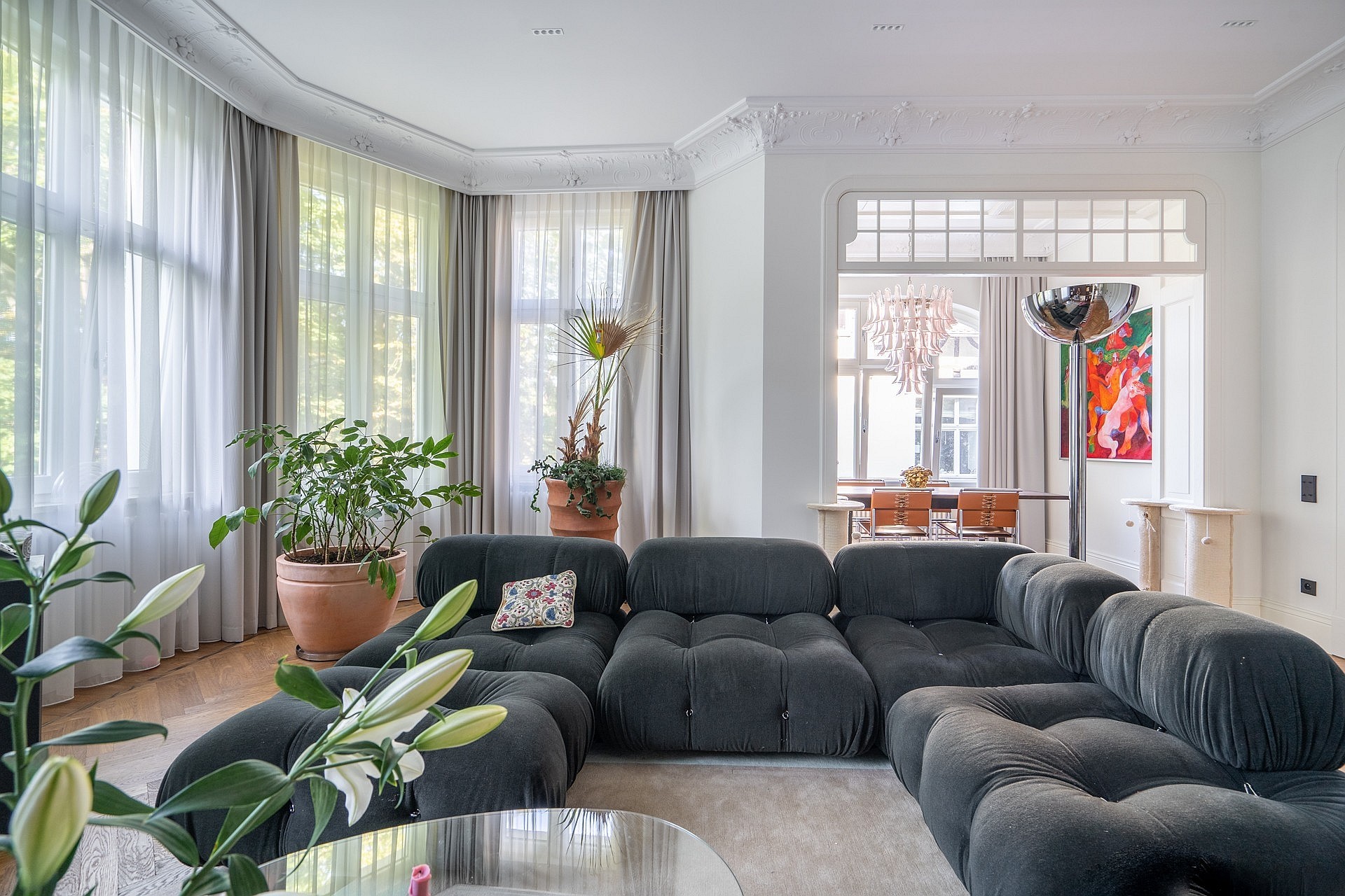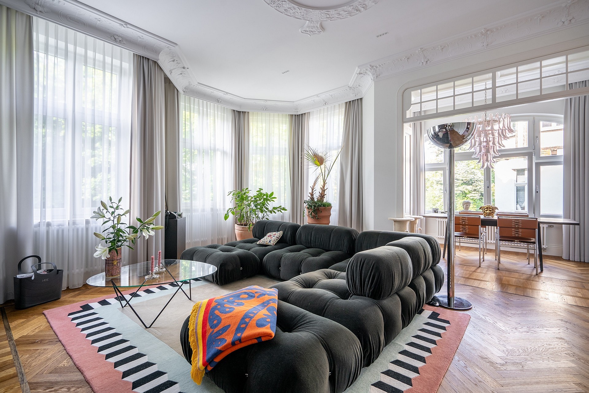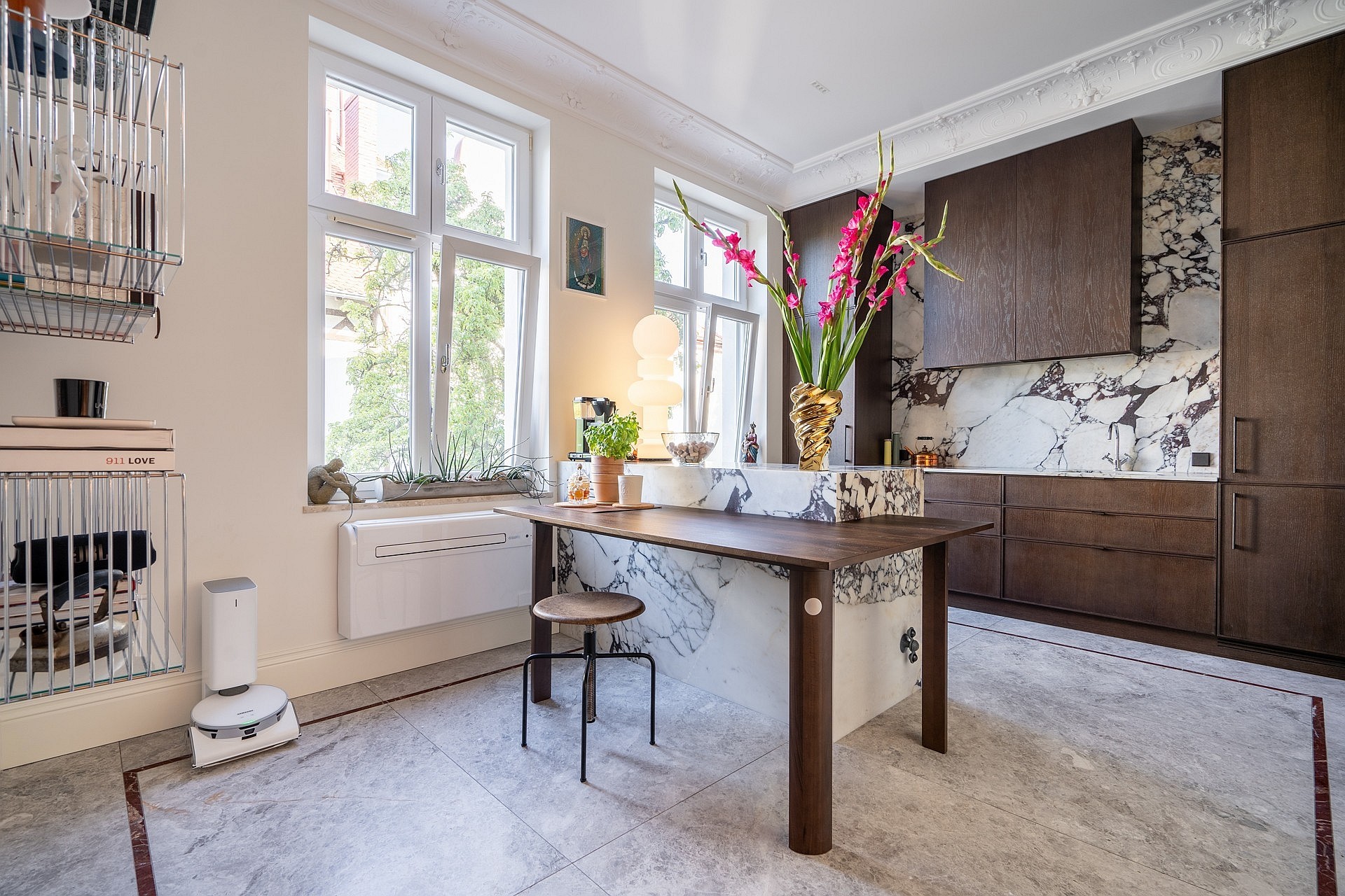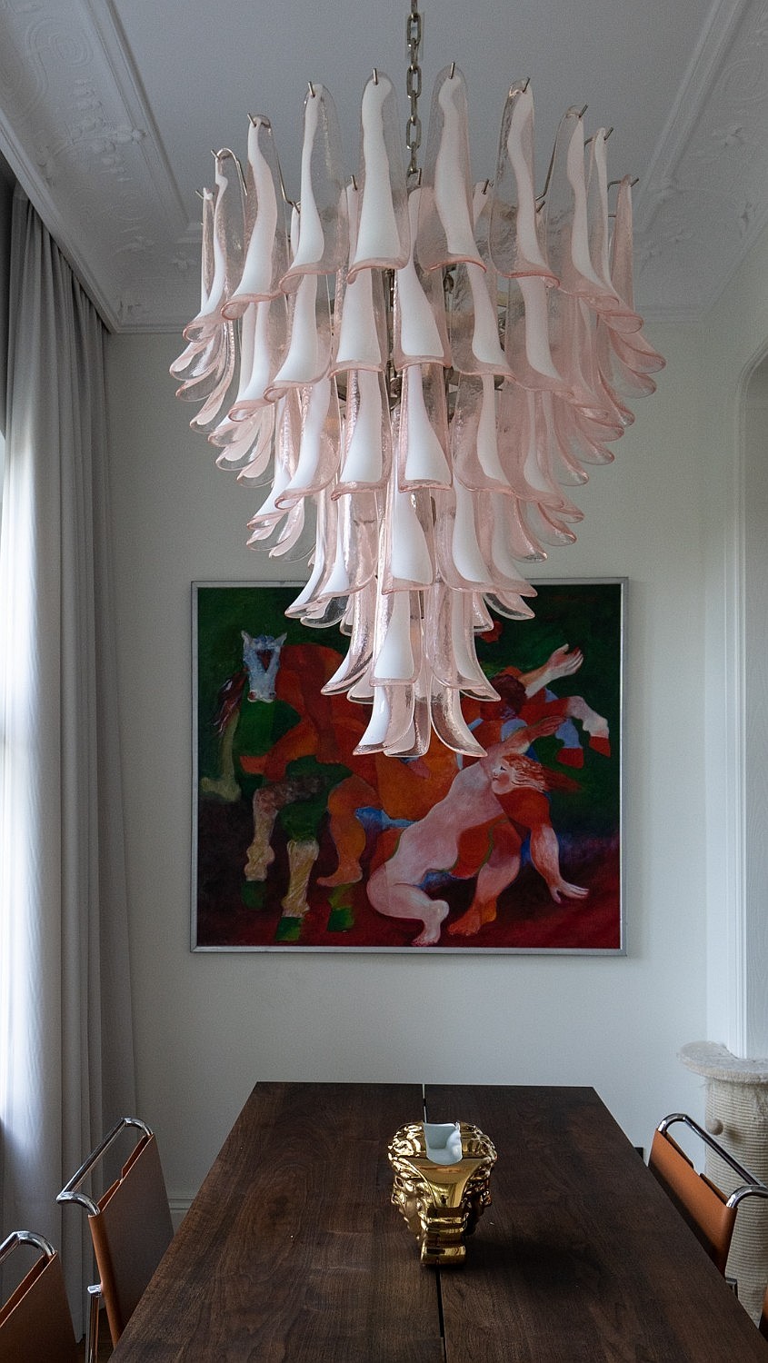 Originele eikenhouten visgraatparket, sierlijsten aan muren en plafonds, op maat gemaakte meubels. Plafondhoogte meer dan drie meter. Grote ramen zorgen voor veel daglicht.