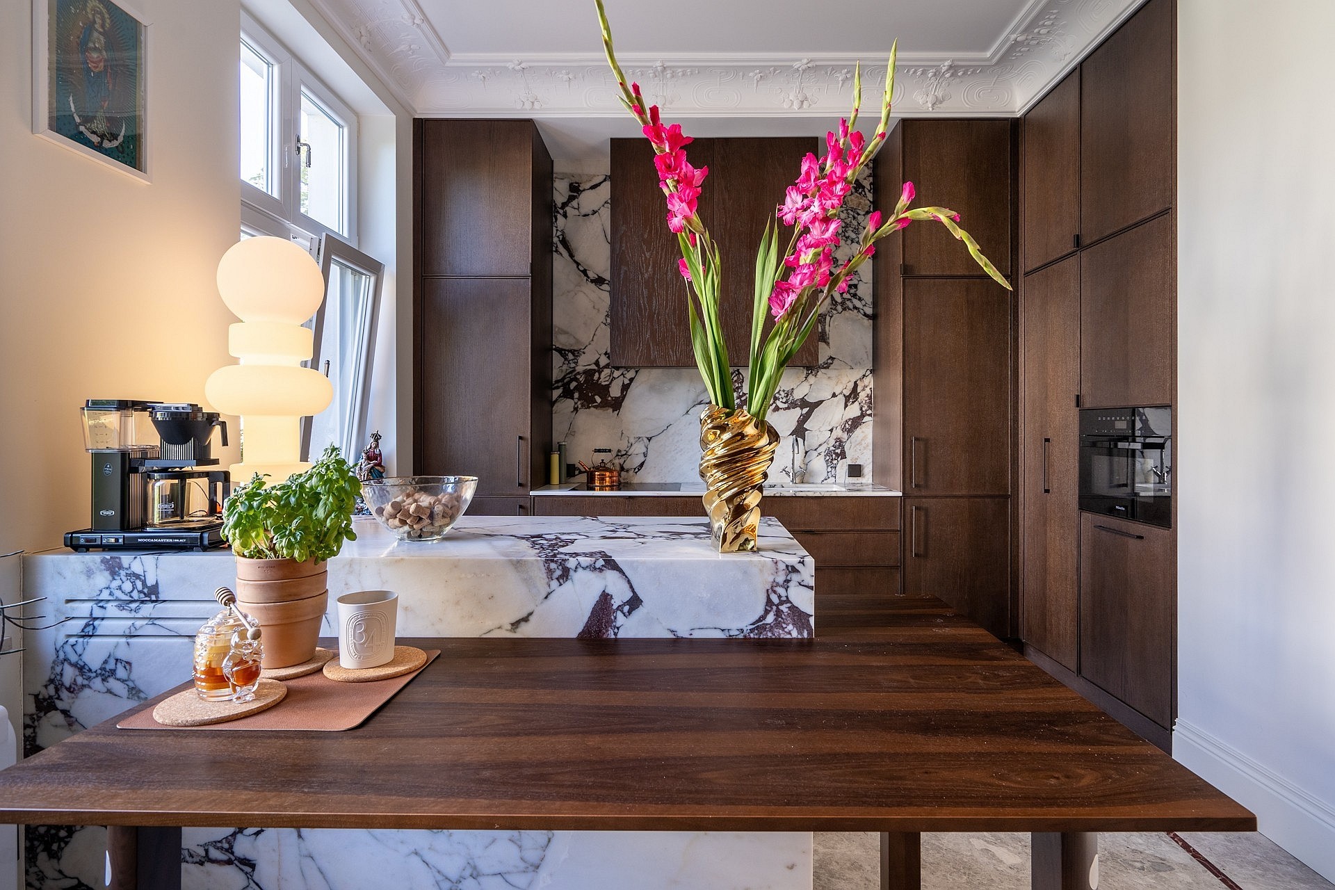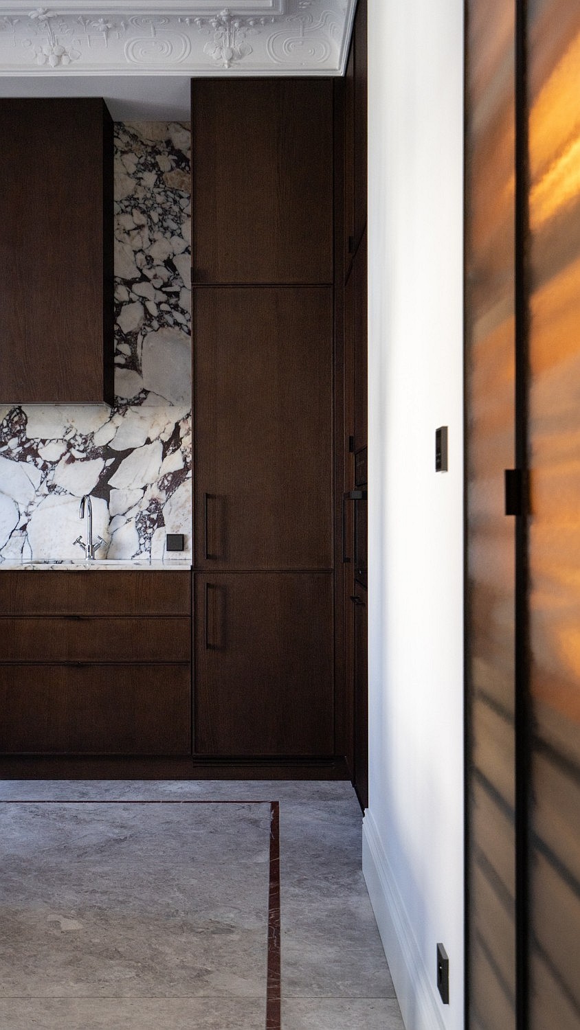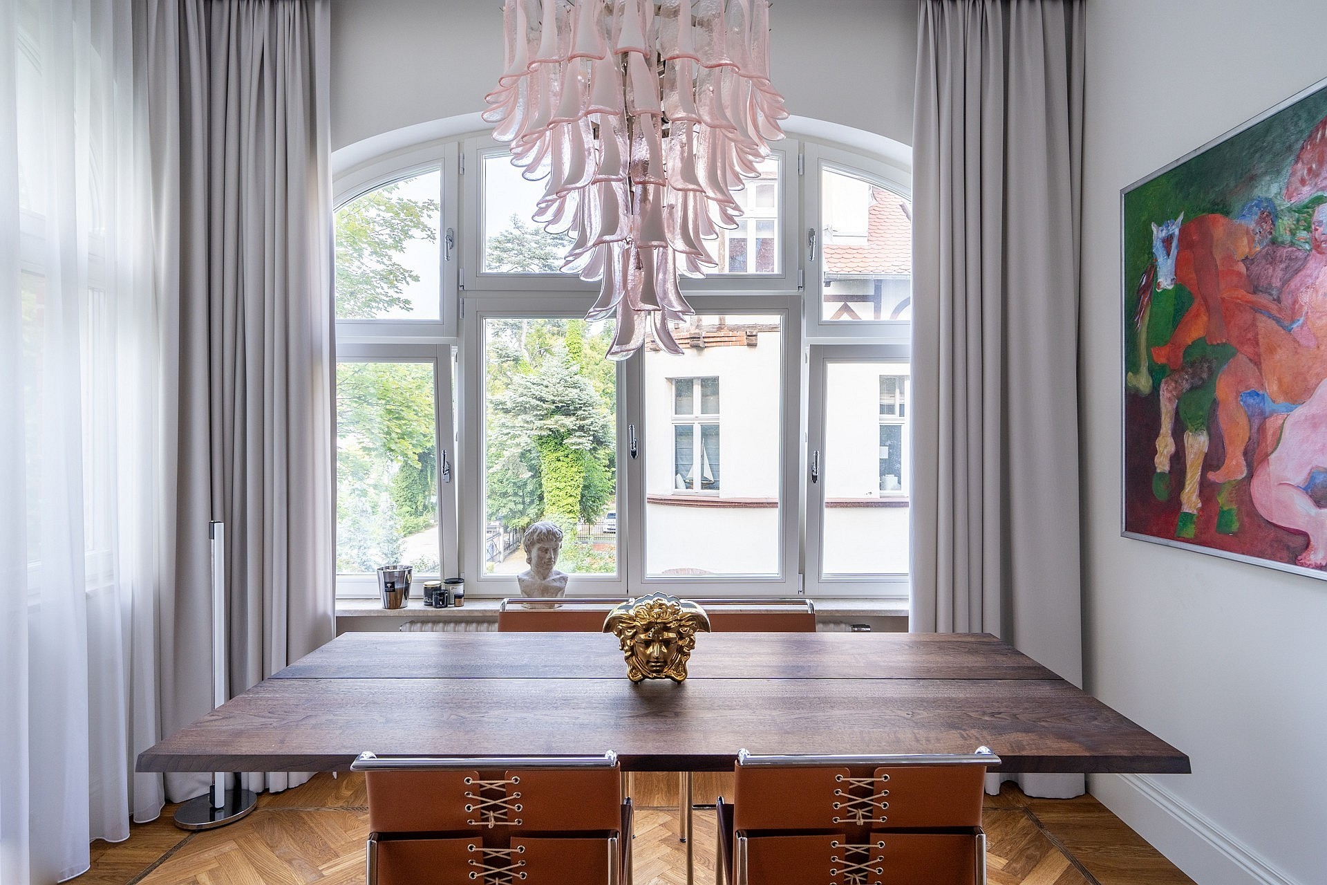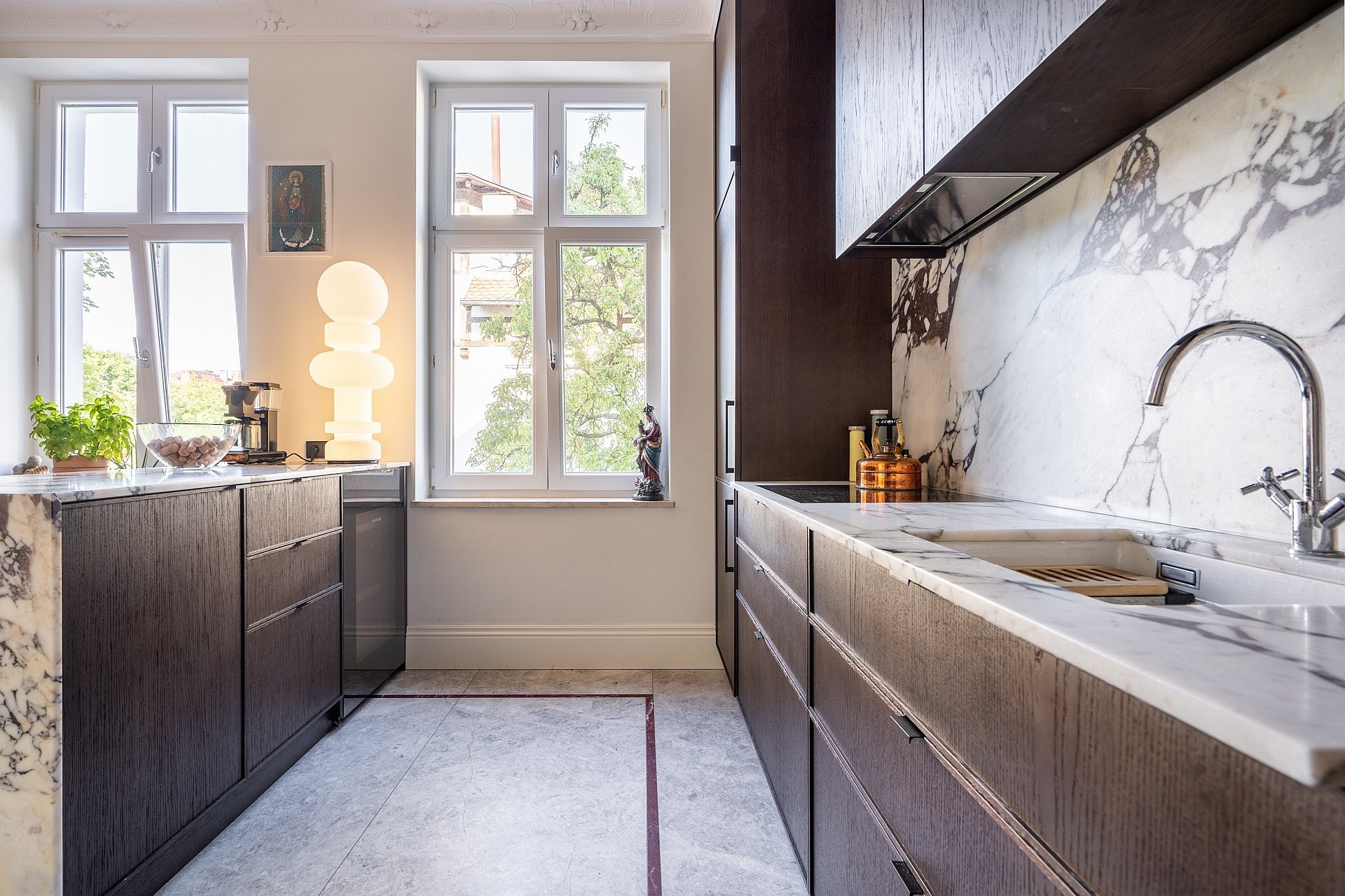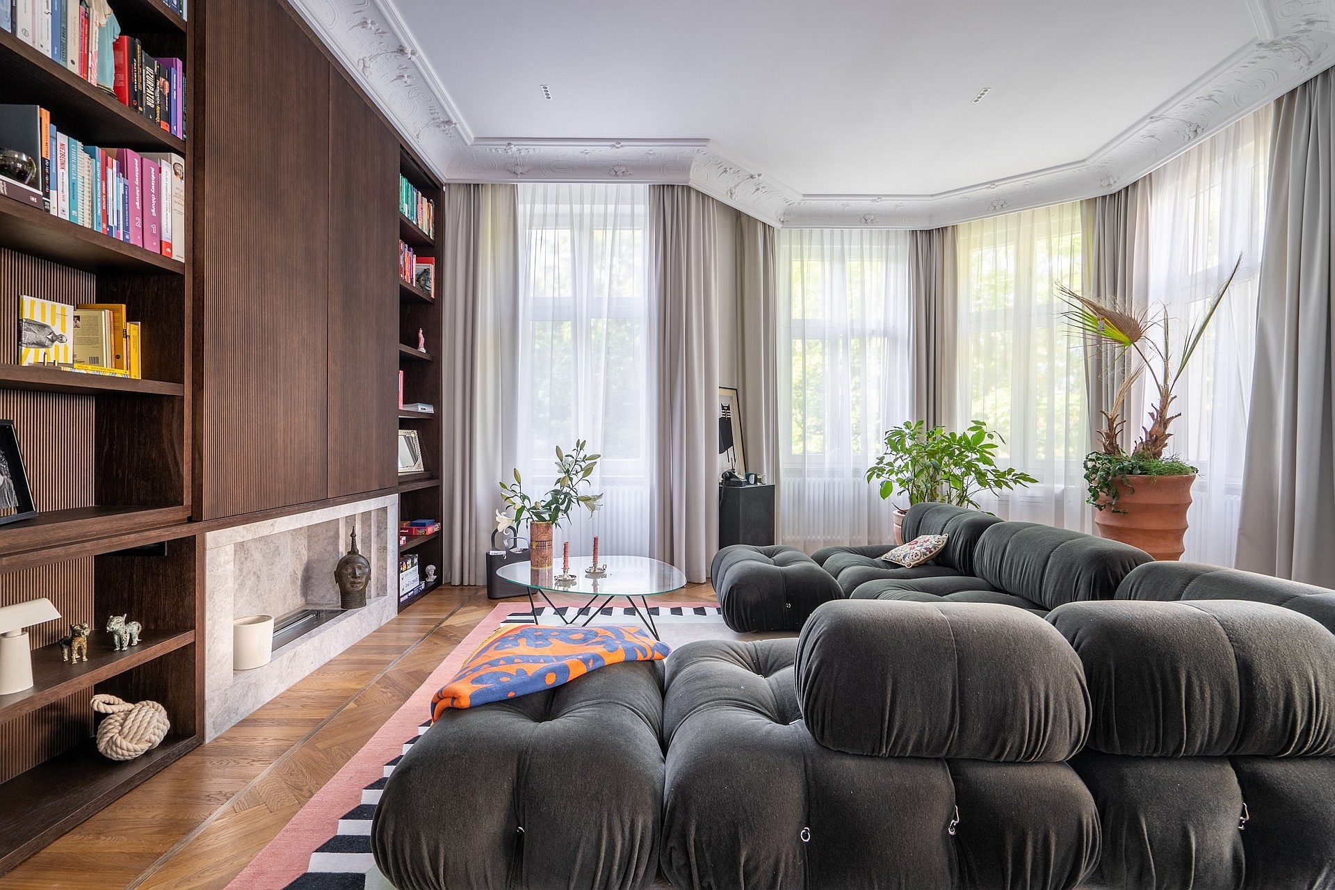 Originele eikenhouten visgraatparket, sierlijsten aan muren en plafonds, op maat gemaakte meubels. Plafondhoogte meer dan drie meter. Grote ramen zorgen voor veel daglicht.