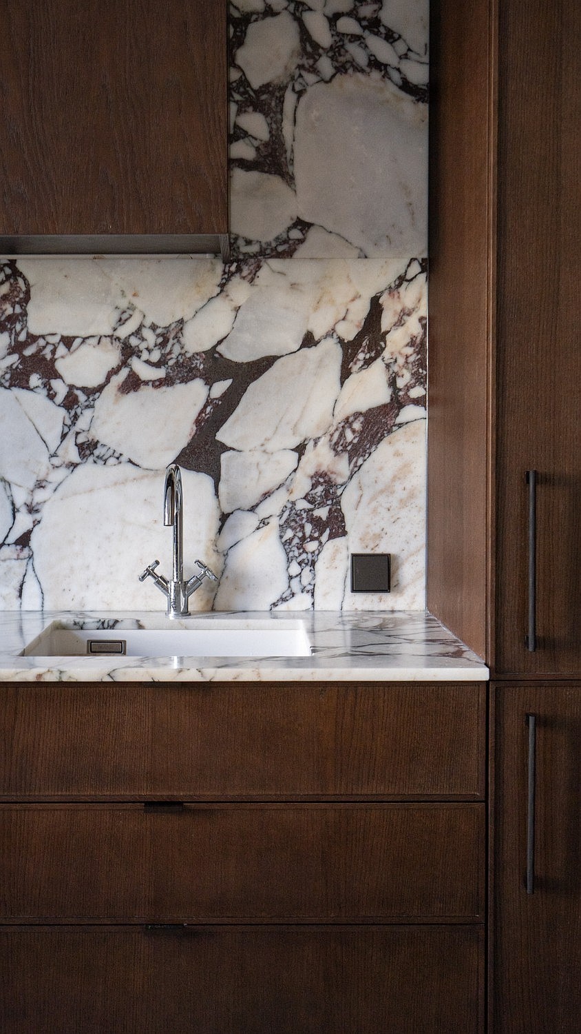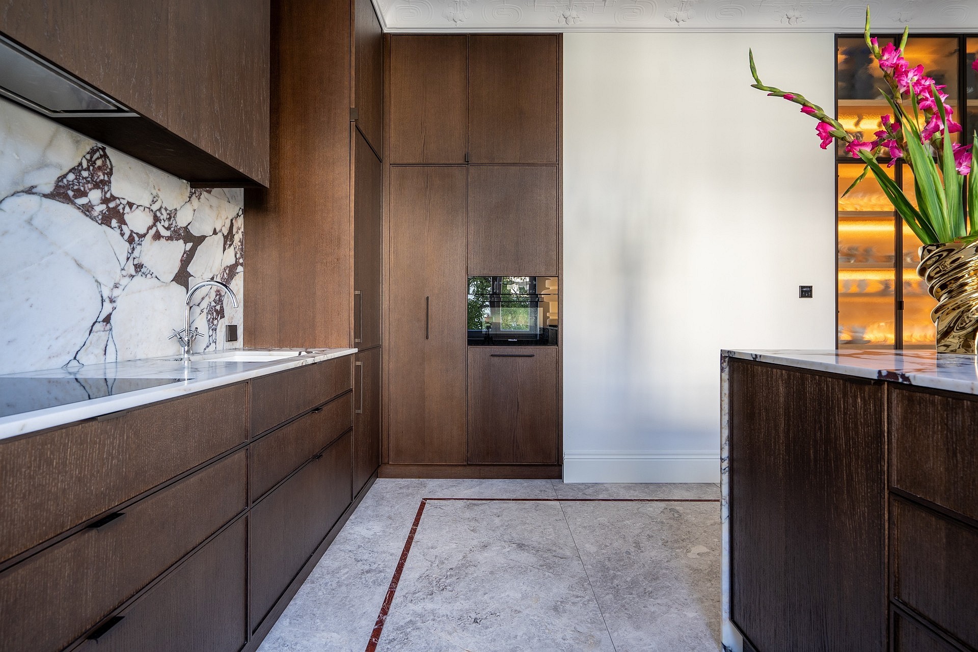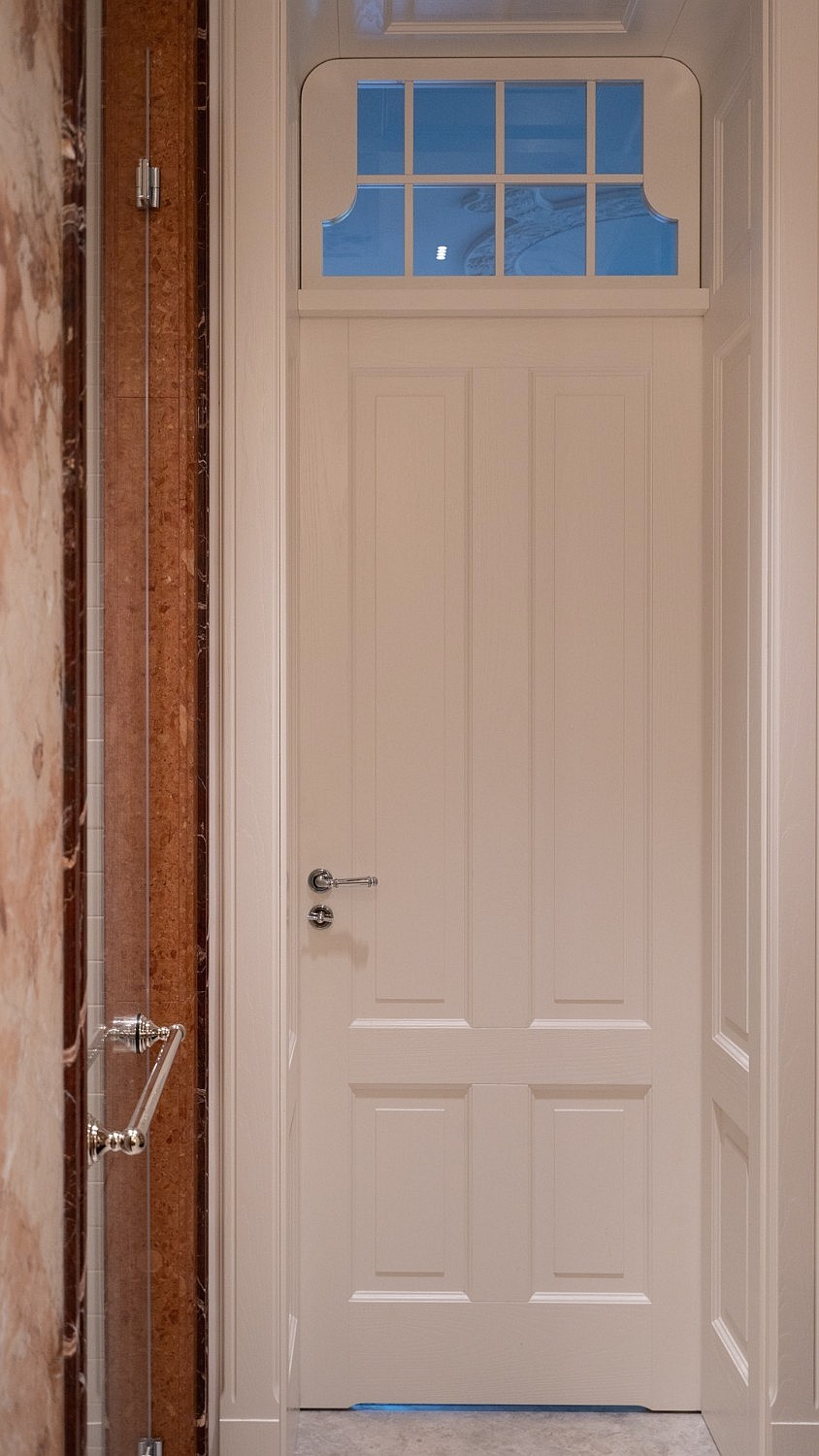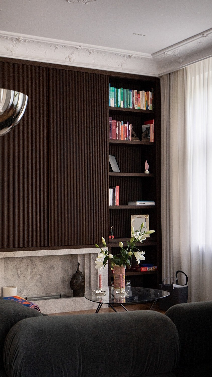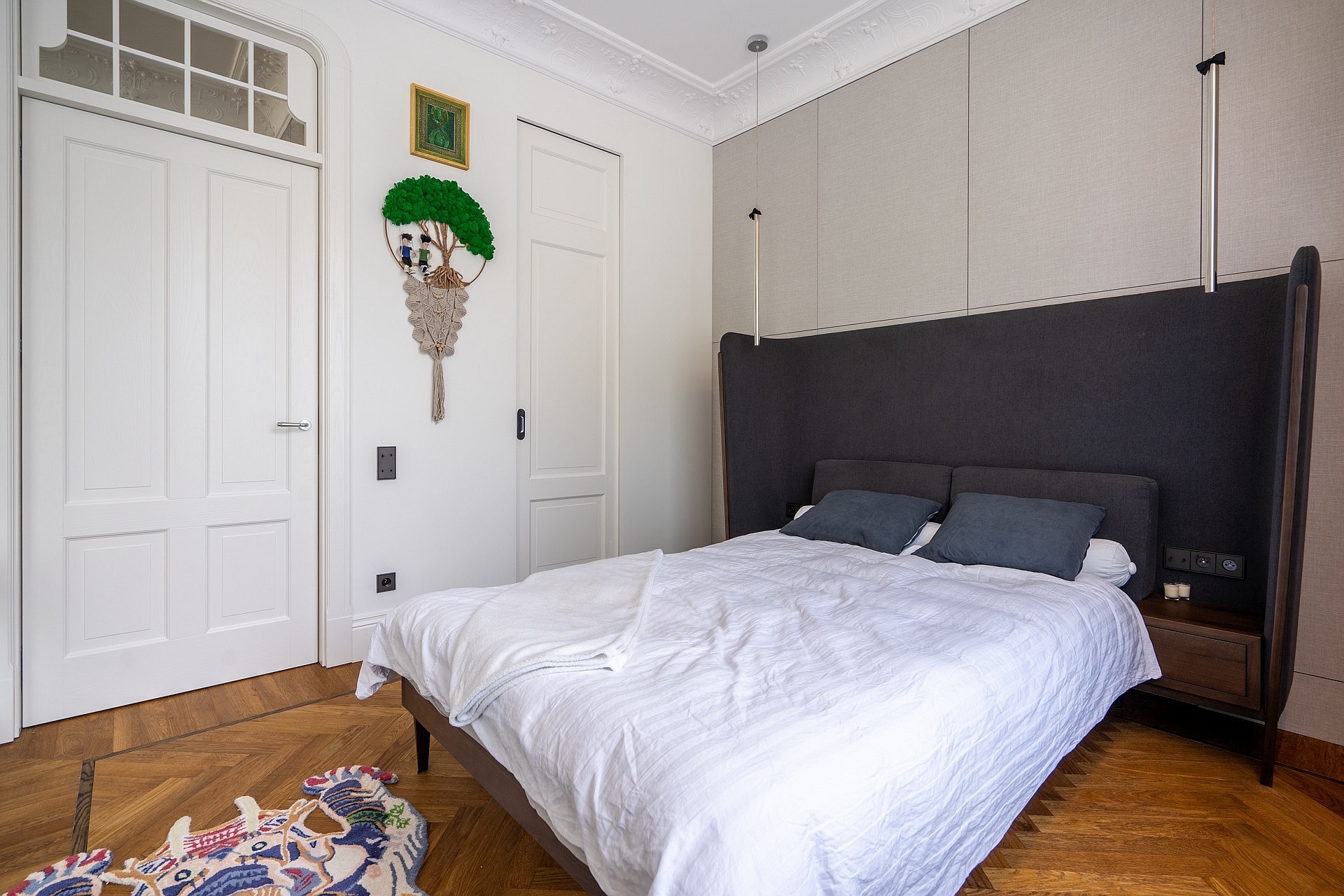 Originele eikenhouten visgraatparket, sierlijsten aan muren en plafonds, op maat gemaakte meubels. Plafondhoogte meer dan drie meter. Grote ramen zorgen voor veel daglicht.