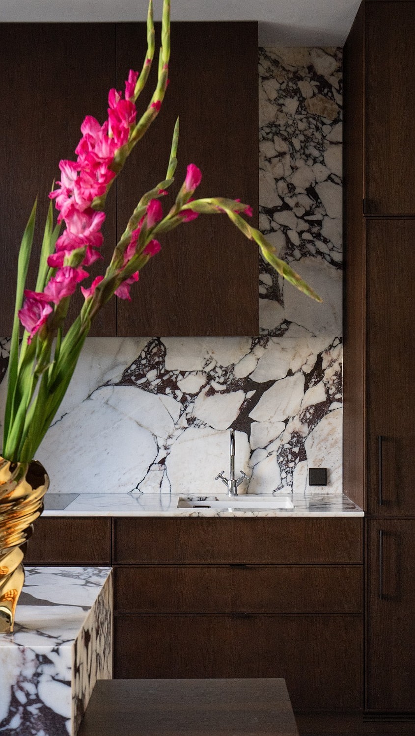 De woonkamer is verdeeld in een zithoek en een keuken-eetgedeelte met een tafel voor vier tot zes personen. De keuken is uitgevoerd met donkere kasten en een stenen werkblad; apparatuur: inductiekookplaat, vaatwasser, koel-vriescombinatie, oven en afzuigkap. Vanuit de woonkamer toegang tot de glazen, zonrijke veranda.